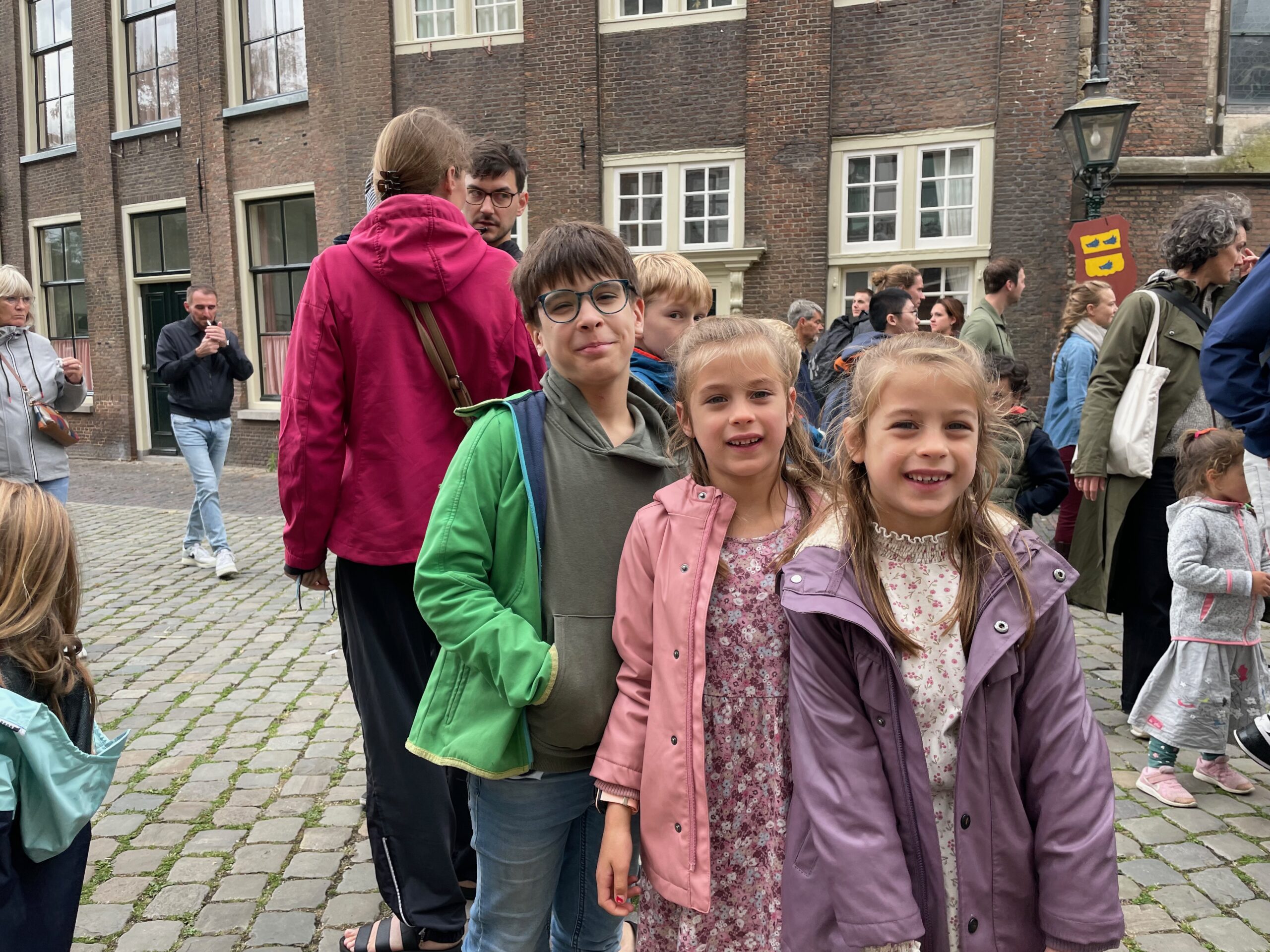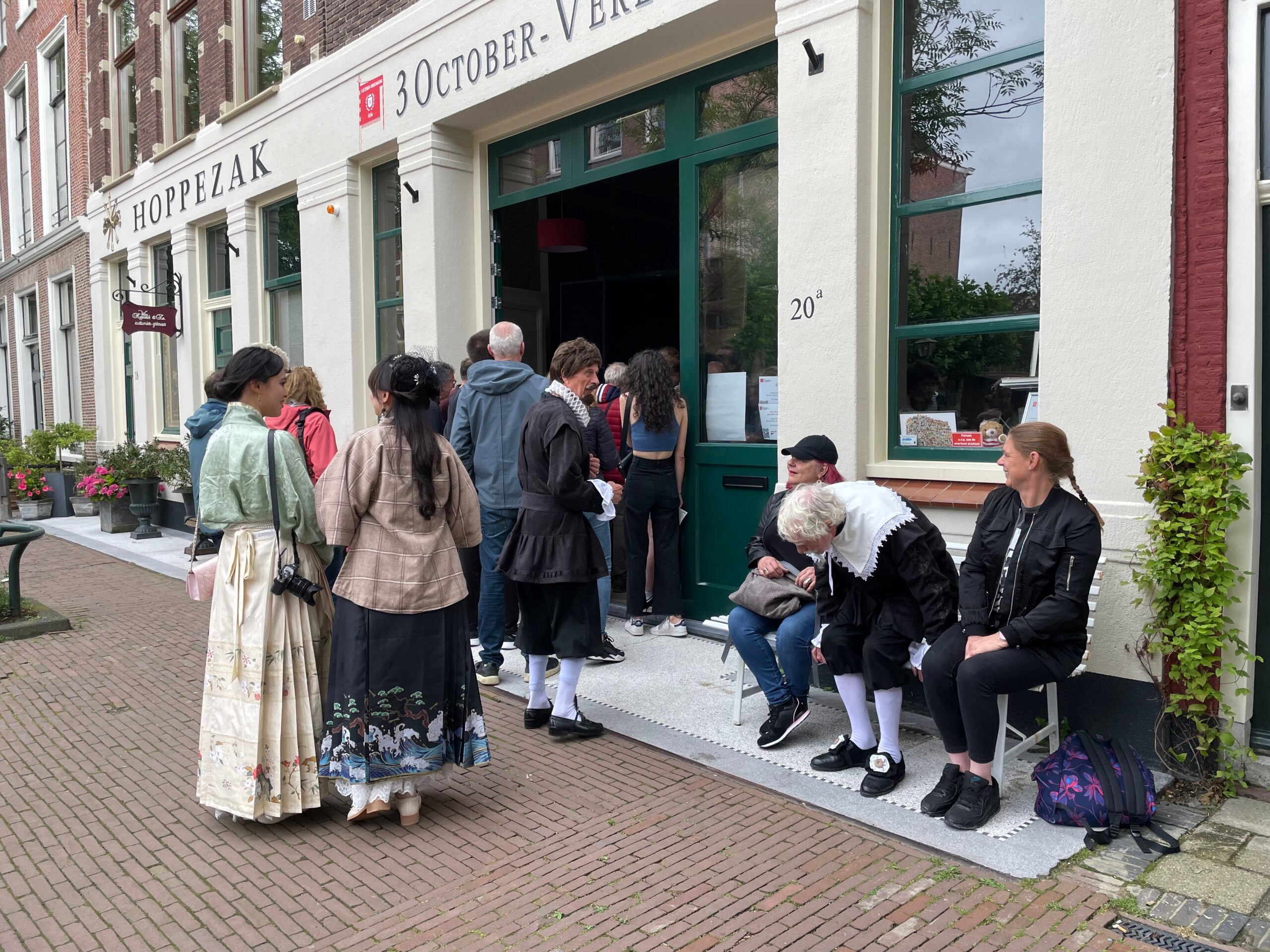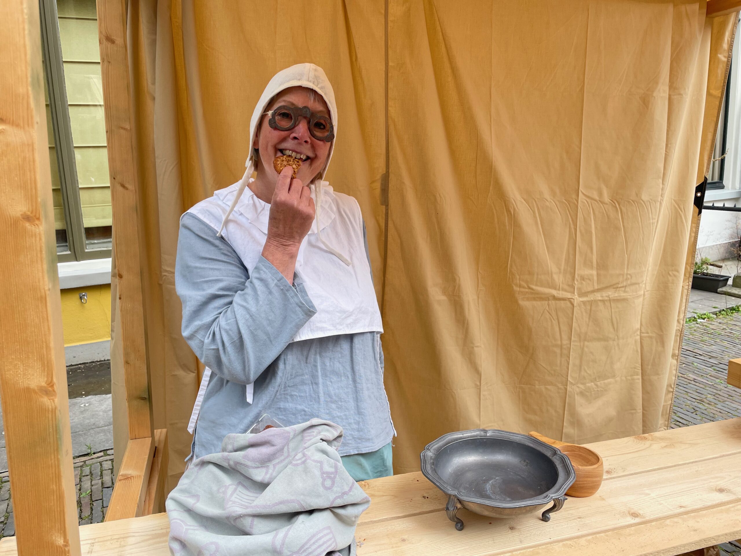 De koekjesmevrouw die alle kinderen die vijf touwtjes van verschillende kleuren kunnen laten zien een echte kletskoek aanbiedt. “Ik weet niet of het echt een Leids koekje is, maar op zijn minst oud-Hollands en vooral erg lekker.” Het loopt aardig storm, maar ze is niet bang snel door haar voorraad heen te zijn. “Ik heb flink wat dozen.” Ook kinderen met iets minder dan vijf touwtjes krijgen een koek. Maar de volwassenen worden overgeslagen.