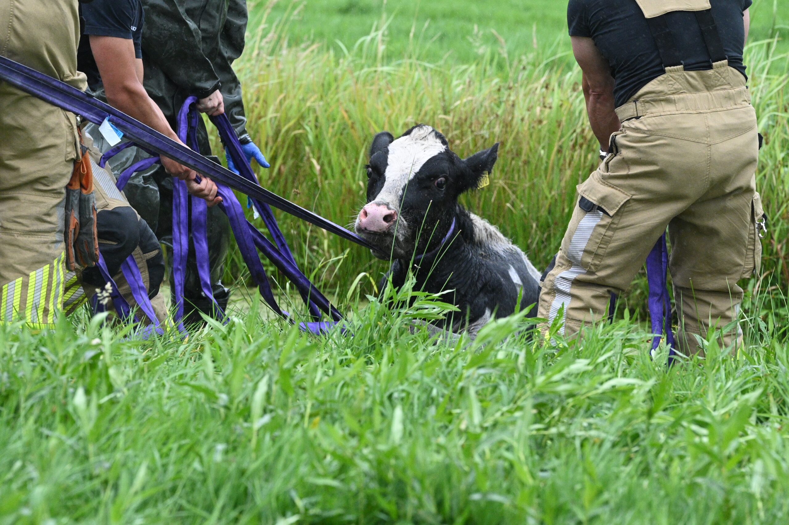 De brandweer werd maandagavond rond 20.00 uur opgeroepen voor een niet alledaagse klus. Bij het weiland tussen de Europaweg, de Kruisherenweg en de Vrouwenweg waren twee koeien in de sloot terecht gekomen en die konden er zelf niet meer uit.