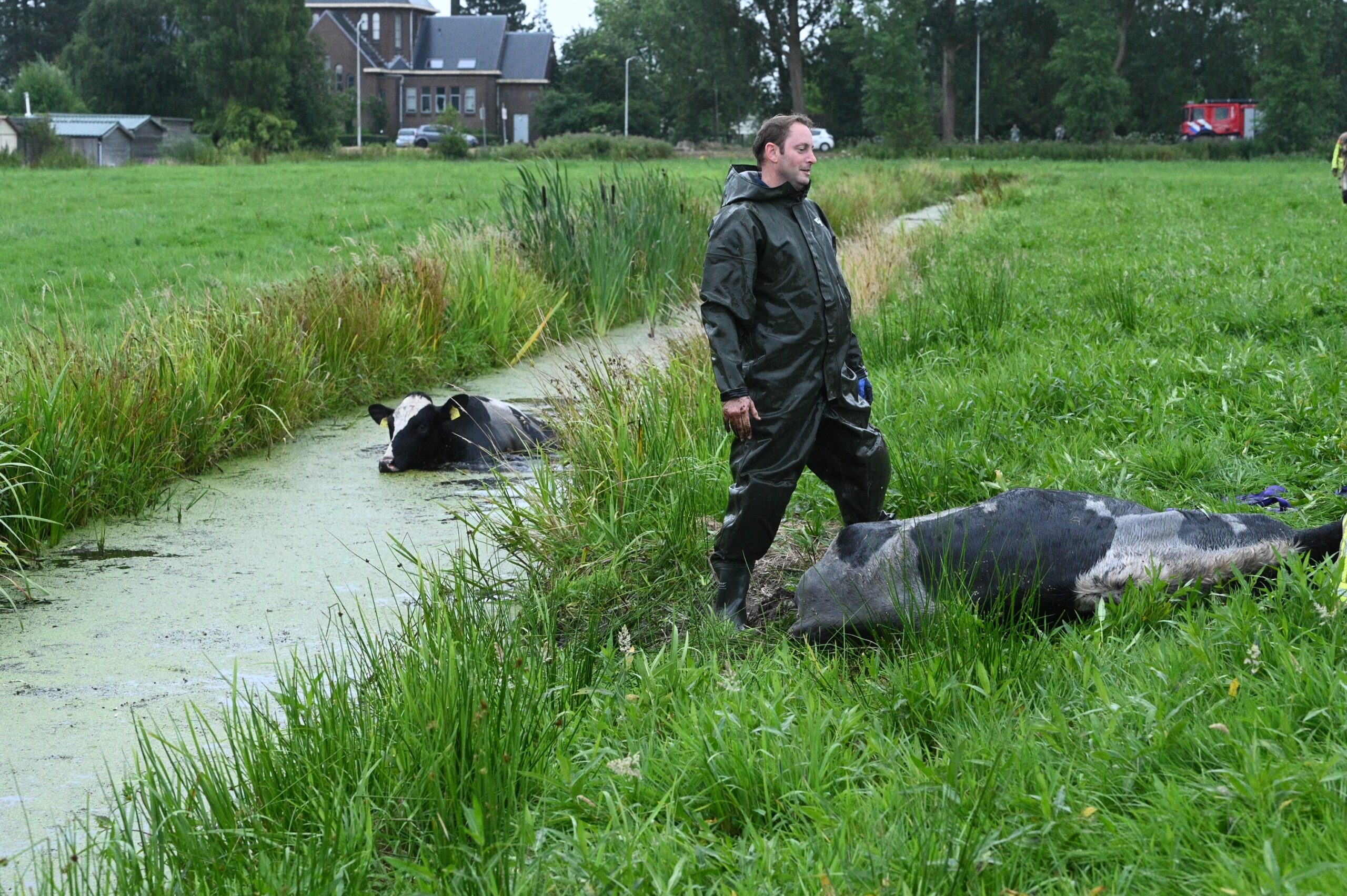 Met een flinke krachtinspanning wist de brandweer die twee dieren uit de sloot te halen. Ze bleven allebei ongedeerd.