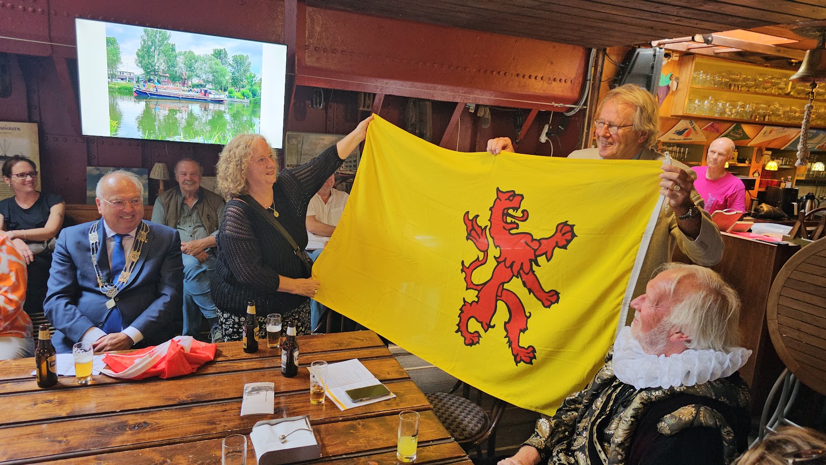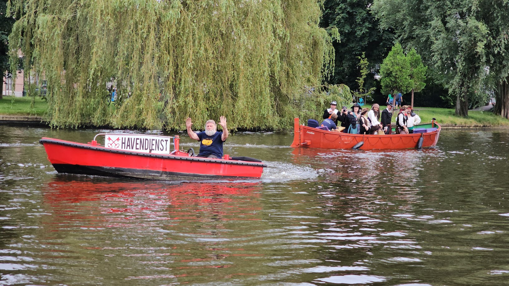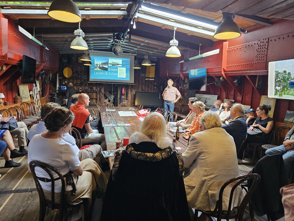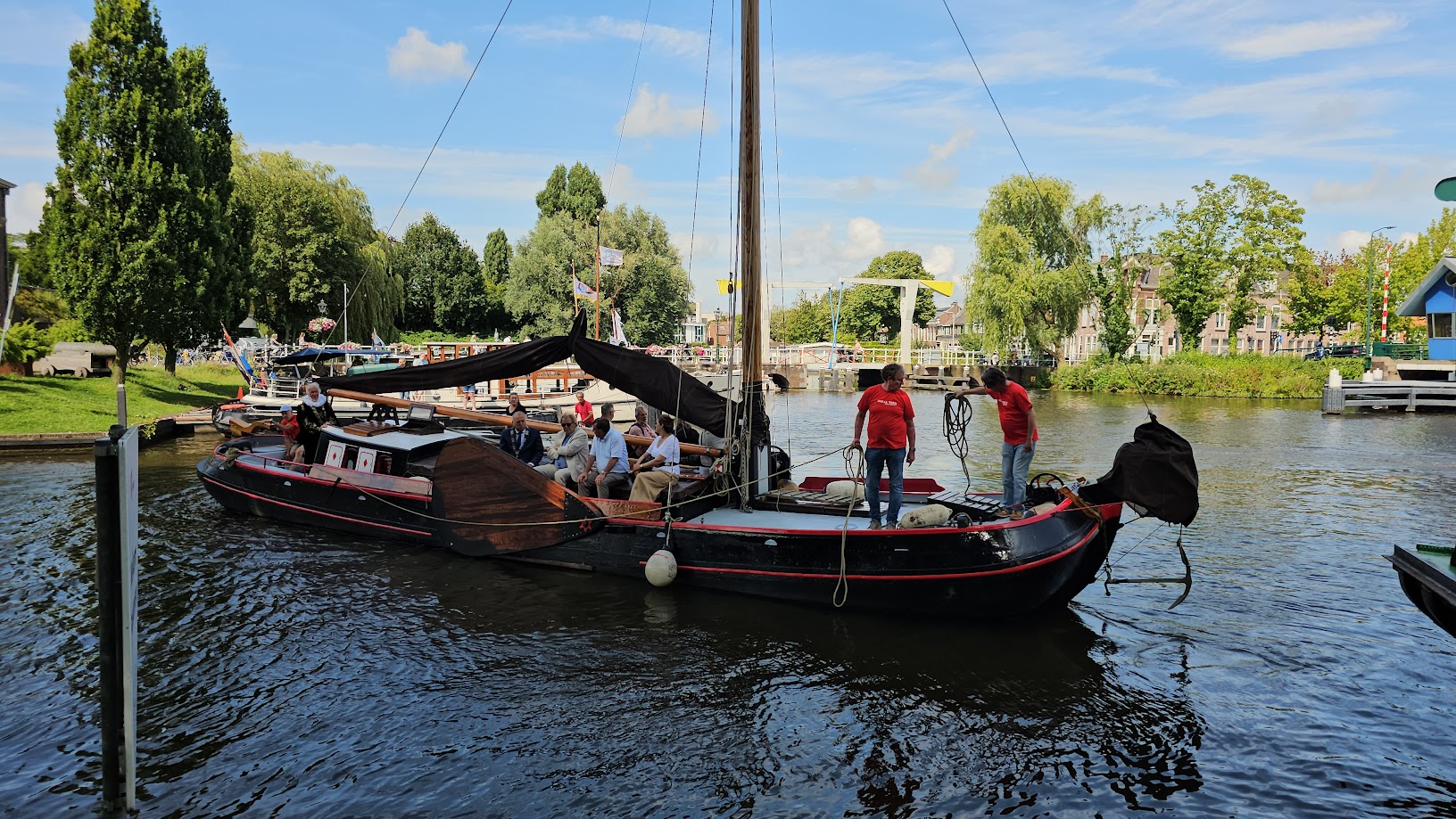 Na afloop van het officiële gedeelte volgden vaartochtjes door Leiden met Leidse rondvaartboten die er ook al een heel leven op hebben zitten. Net als schippers Koene Parmentier en Sjaak Veringa zelf trouwens. Onderweg werden ze nog ‘aangevallen’ door piraten.