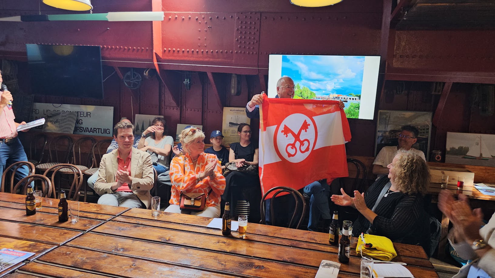 In Leiden werd tijdens een bijeenkomst aan boord van de Terra Nova stilgestaan bij het maritieme verleden van Leiden. Aansluitend zouden Commissaris van de Koning in Zuid-Holland Jaap Smit en de Leidse burgemeester Peter van der Velden de vlaggen van respectievelijk provincie en stad hijsen, maar omdat het verenigingsschip onder de bomen van het Ankerpark lag afgemeerd, was hijsen er niet bij. De vlaggen werden daarom maar ontvouwen in het ruim van de Terra Nova.