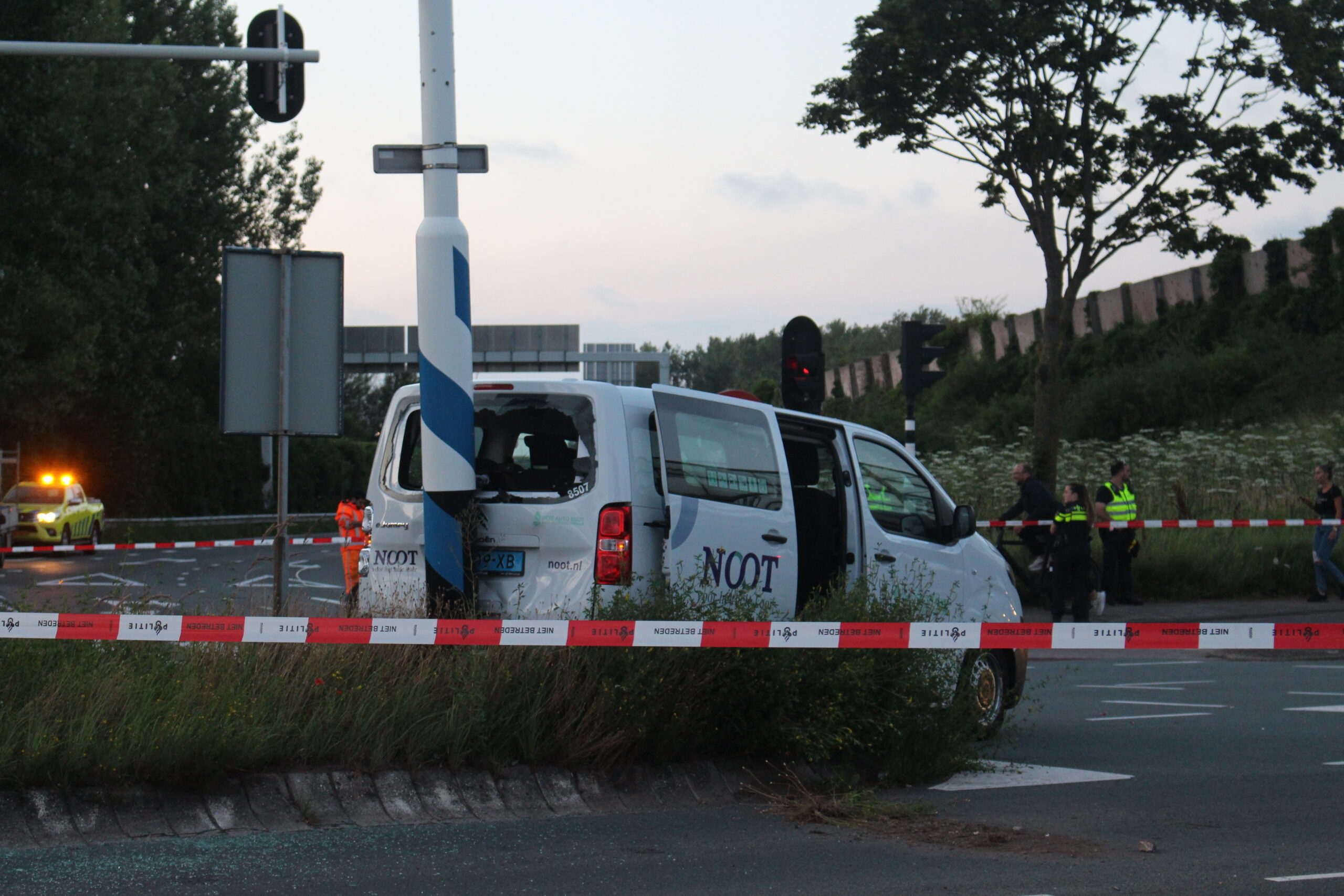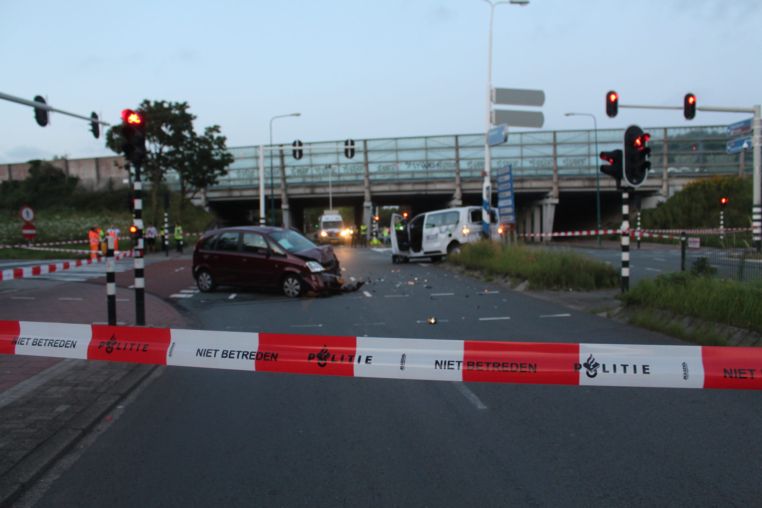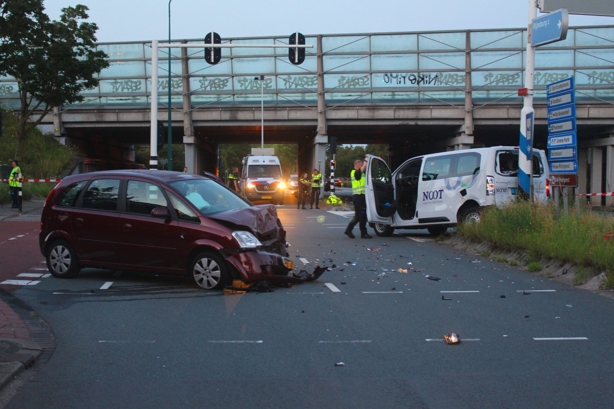 Een personenauto en een taxibusje zijn zaterdagavond rond 20.10 uur met een harde klap op elkaar gebotst op de Rijnzichtweg in Oegstgeest.