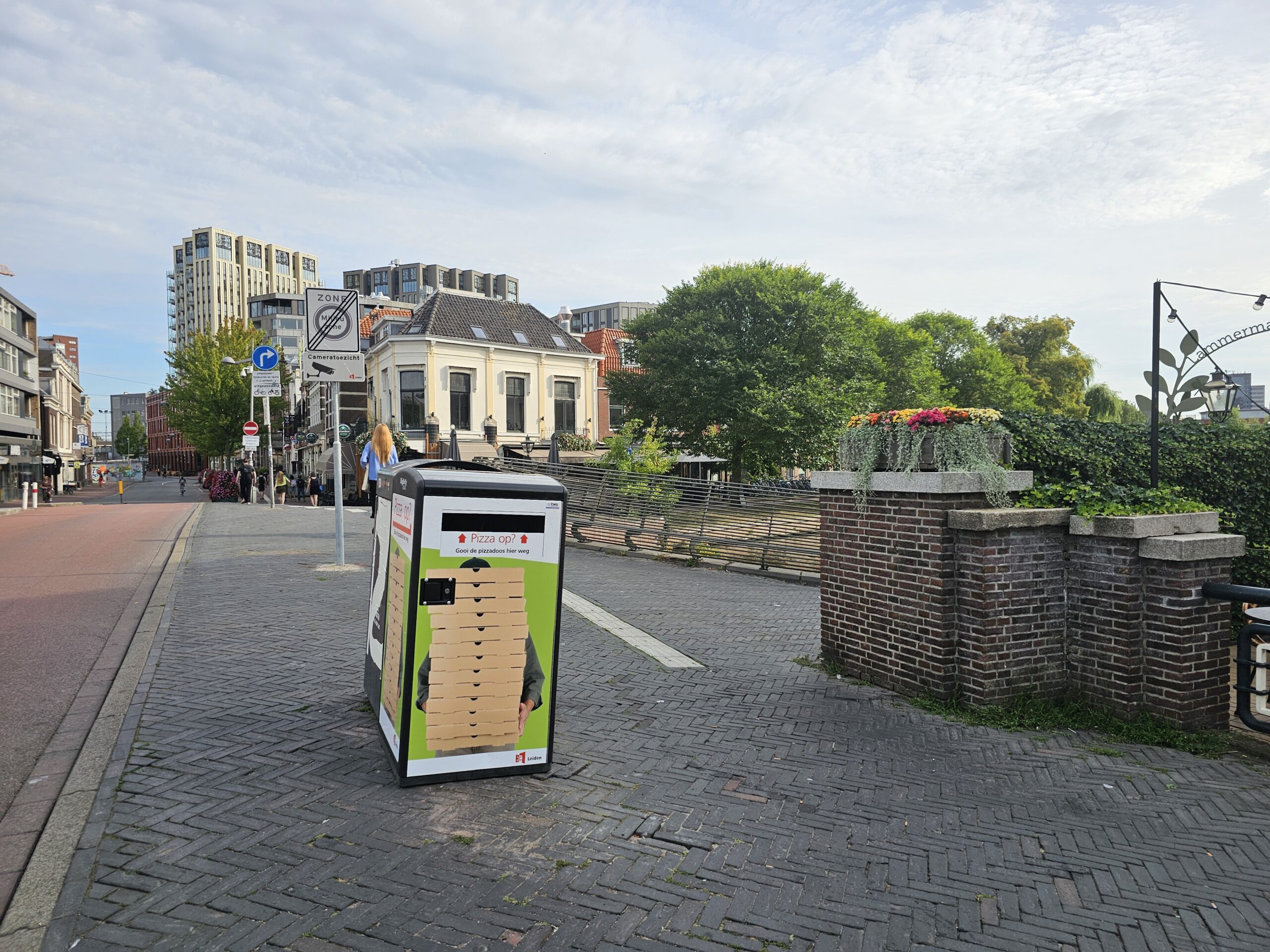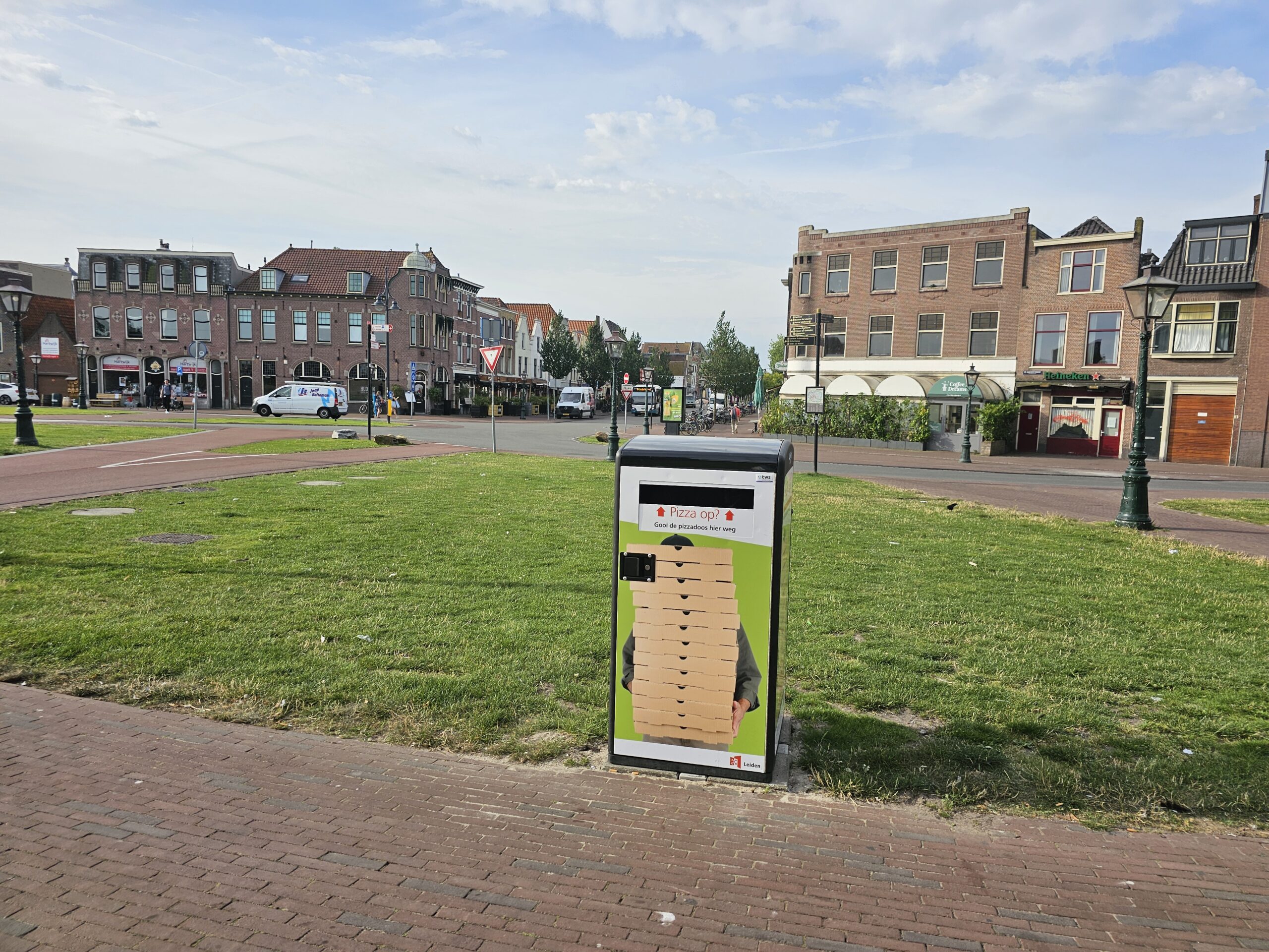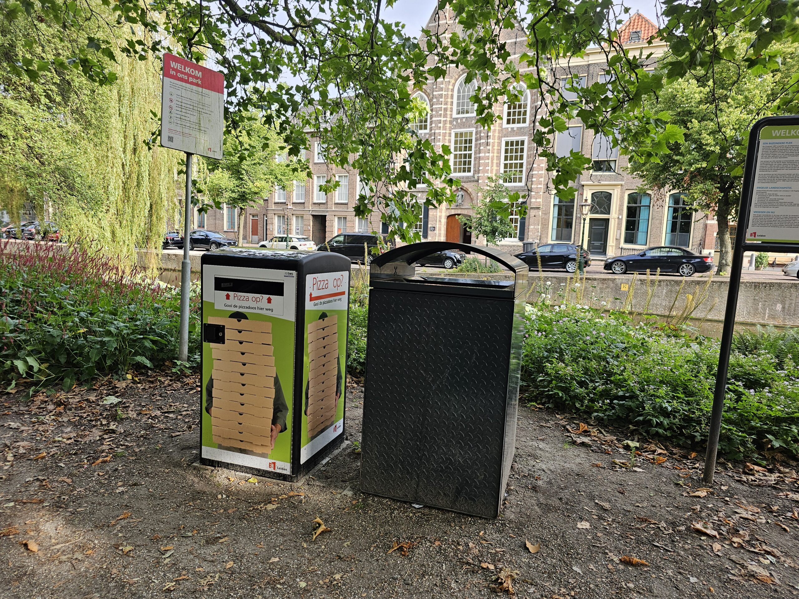 De gemeente Leiden heeft speciale pizzacontainer neergezet in het Van der Werfpark en rond molen De Valk. De extra vuilnisbakkken hebben een opening waar precies een lega pizzadoos doorheen past.
