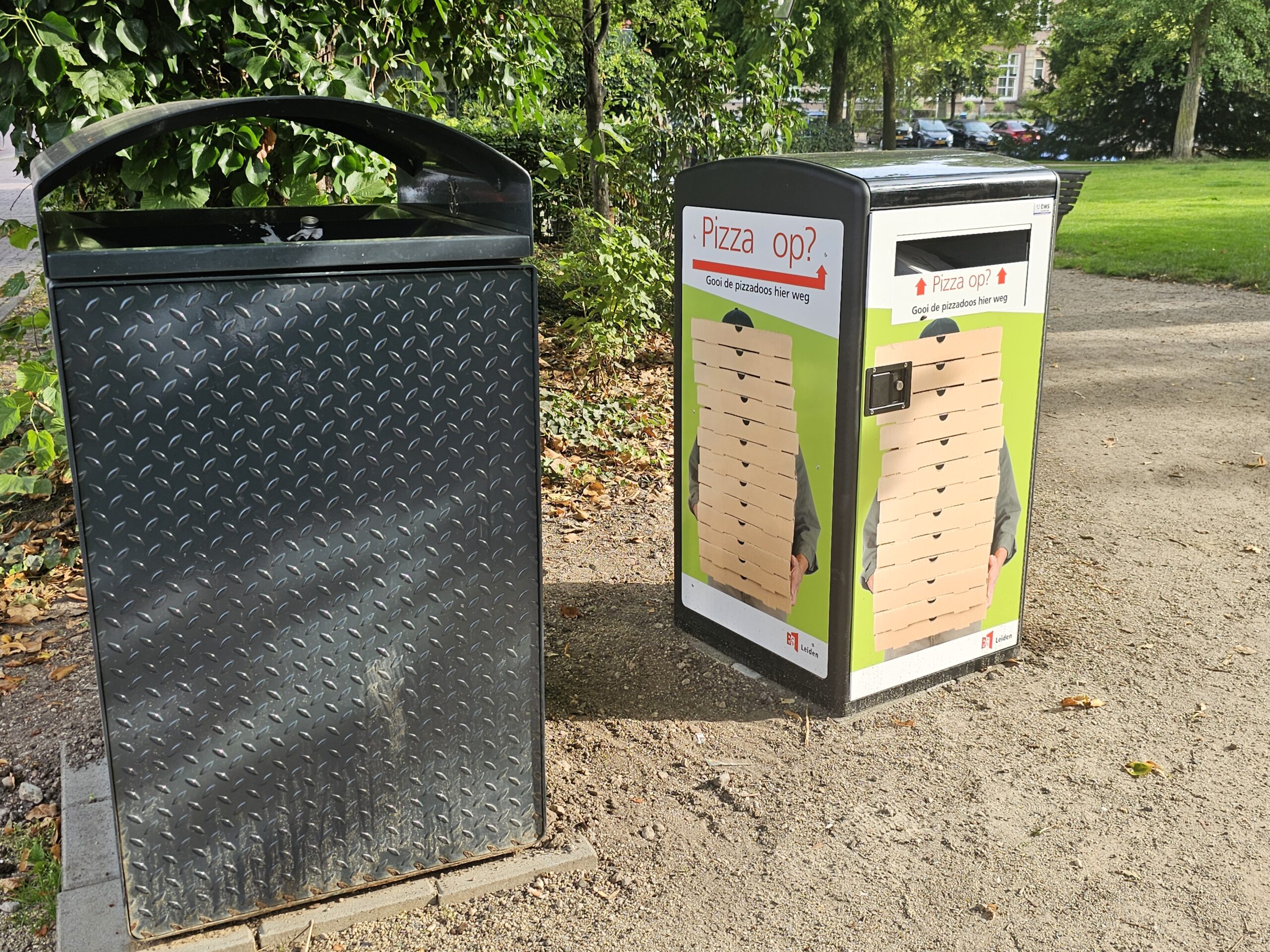De gemeente hoopt dat mensen die tijdens het mooie zomerweer een pizzaatje in het park eten, zo hun afval makkelijker kwijt kunnen en geen pizzadozen in het park achterlaten.