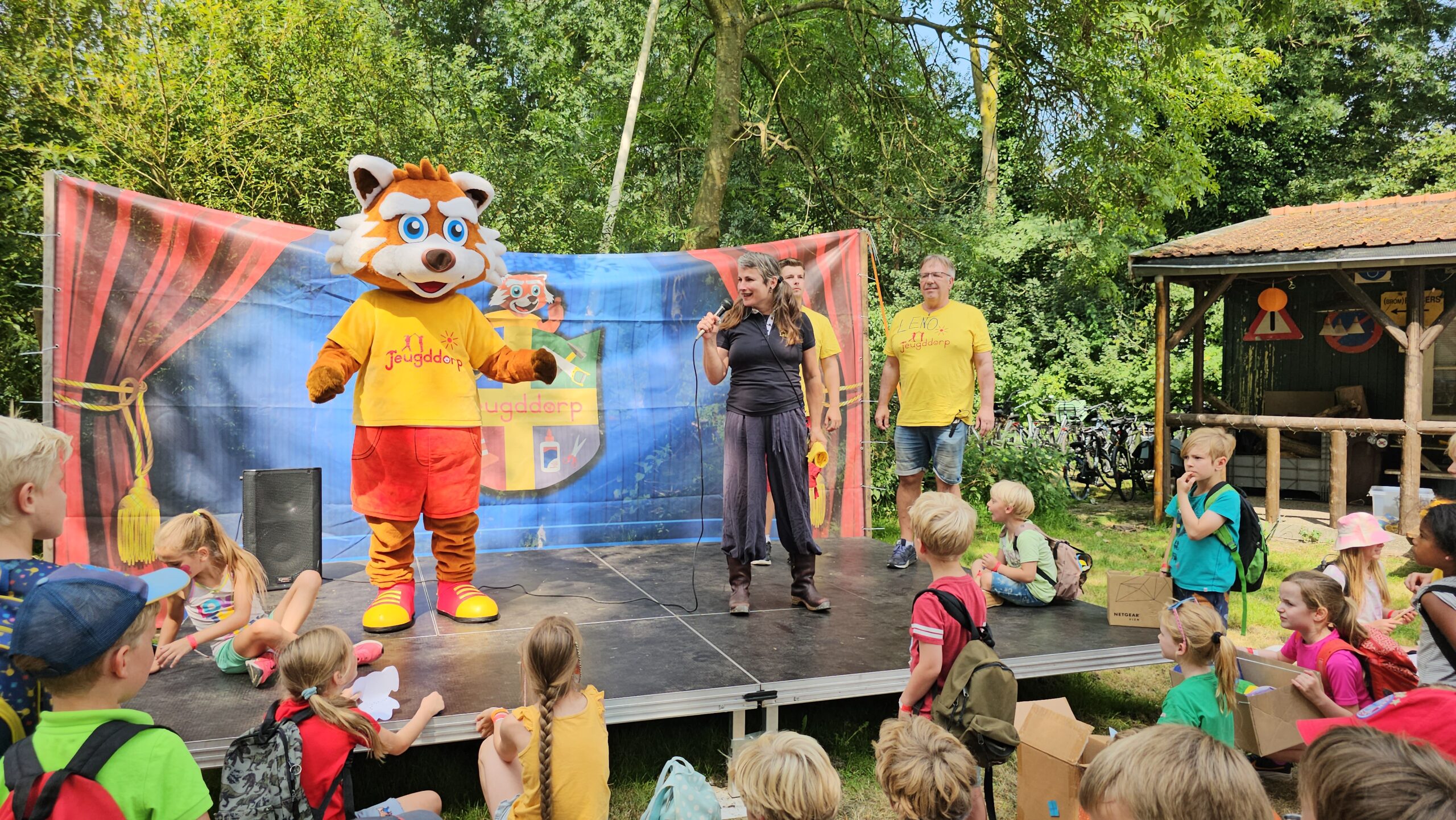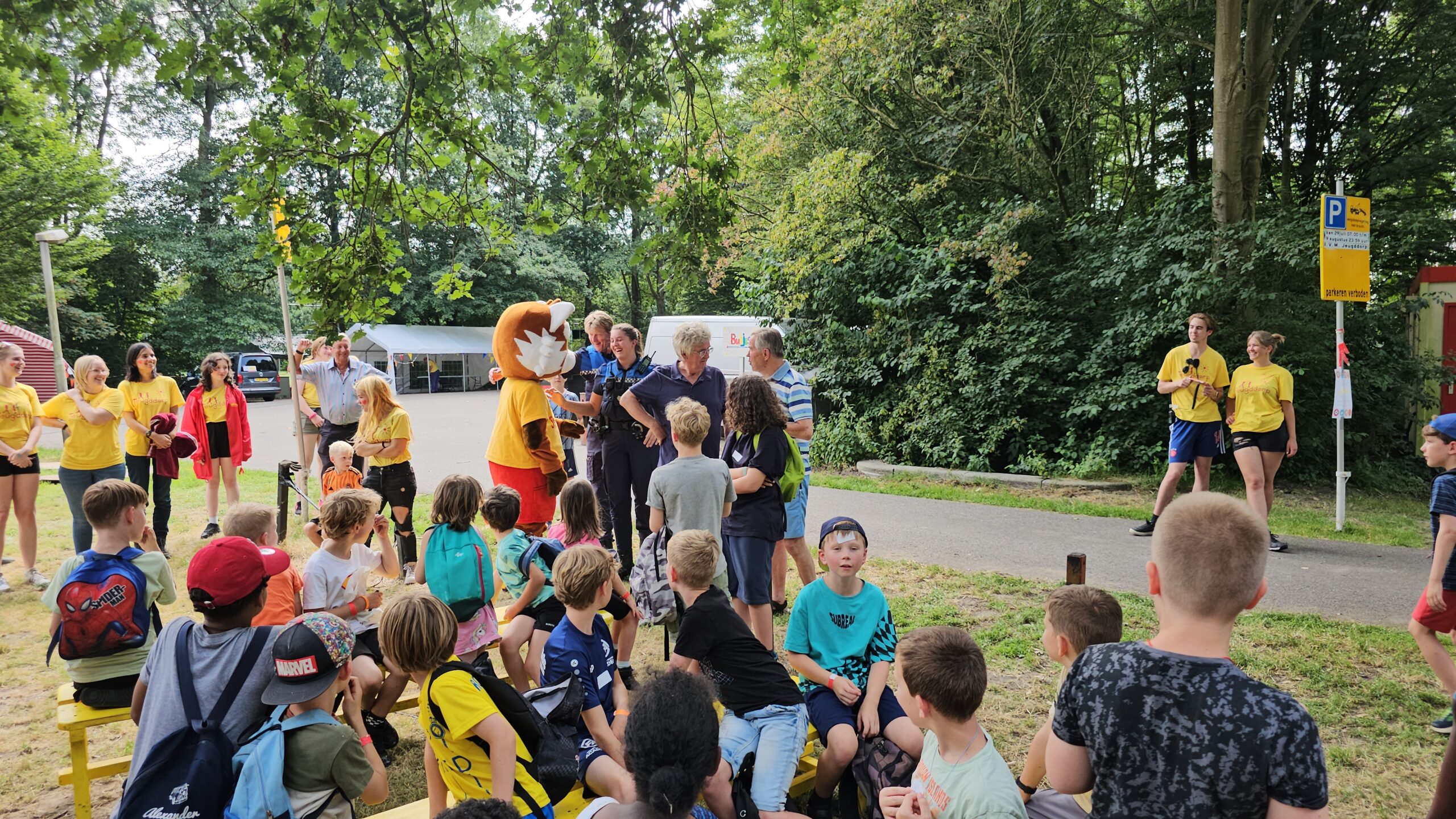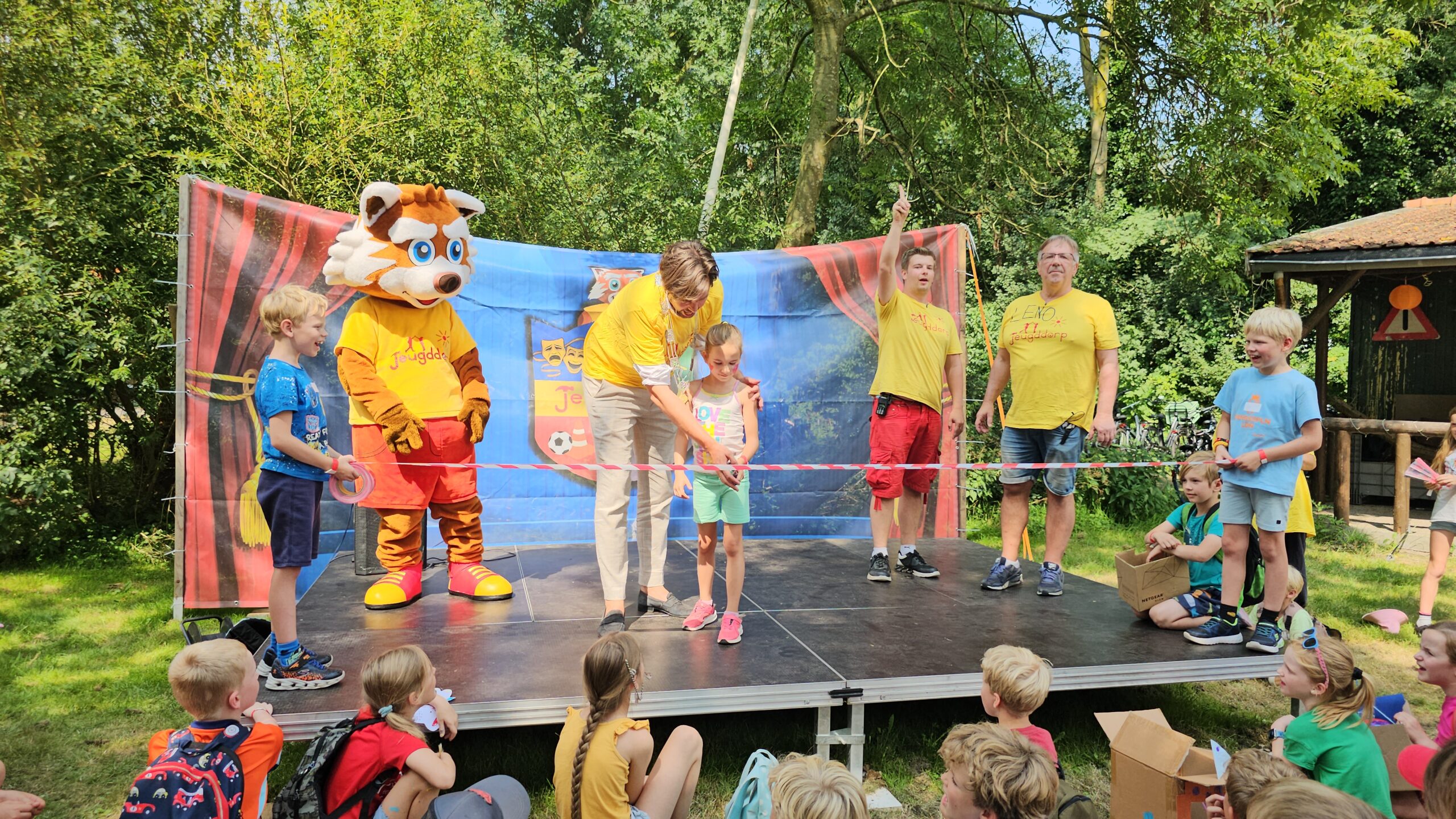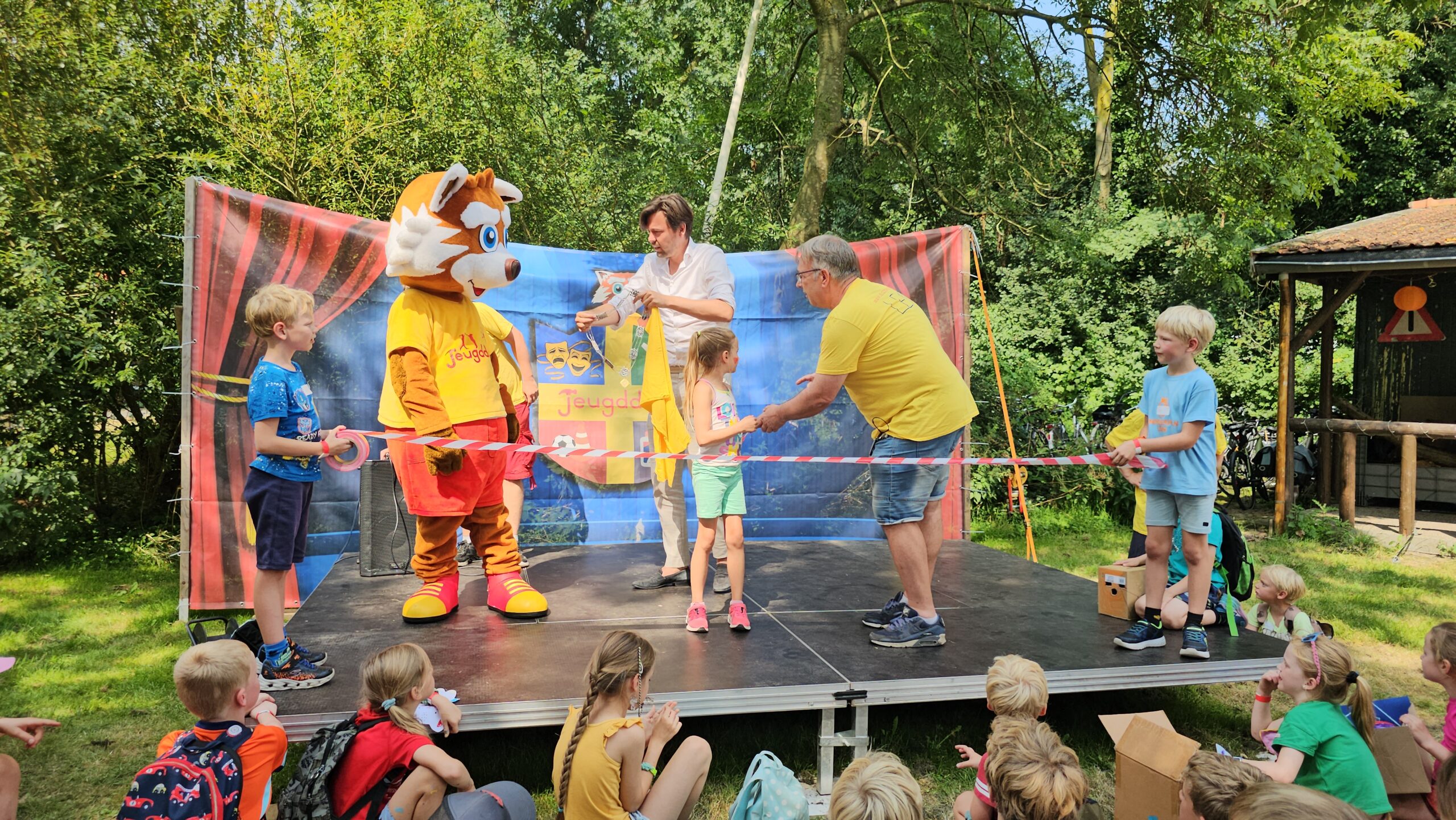 Nadat ook de mascotte Rover naar het podium was gekomen, kon begonnen worden met de opening. Felix Huisken, voorzitter van de Rotaryclub Leiden, was blij dat de kinderen het zo naar hun zin hebben op Jeugddorp. Samen met de kinderen riepen ze locoburgemeester Julius Terpstra naar voren om de officiële openingshandeling te verrichten.