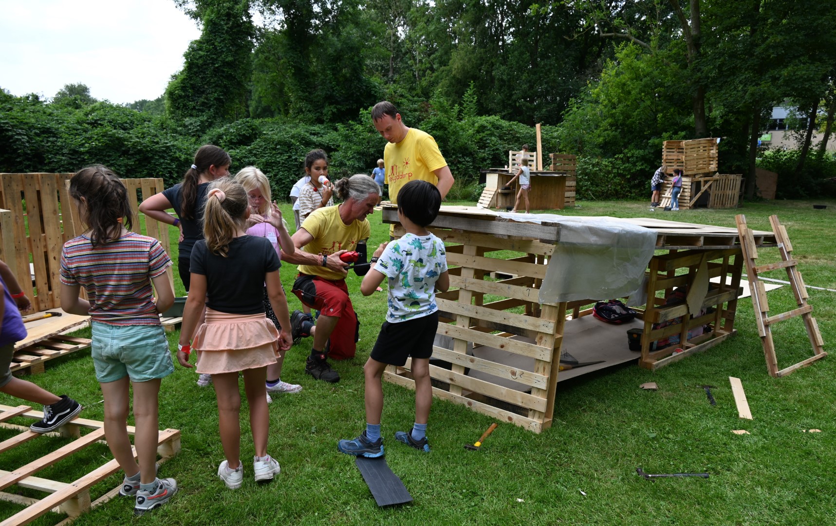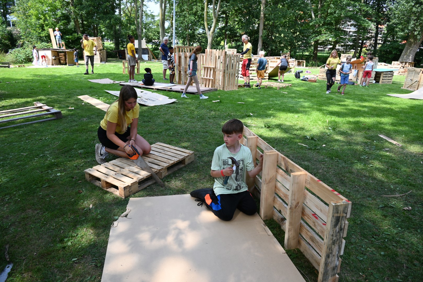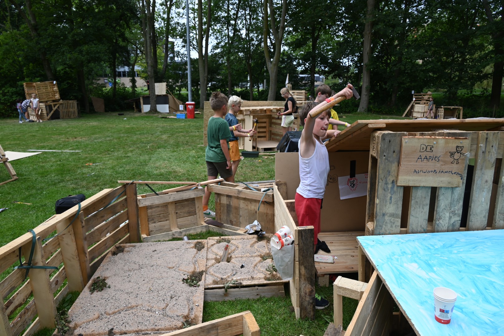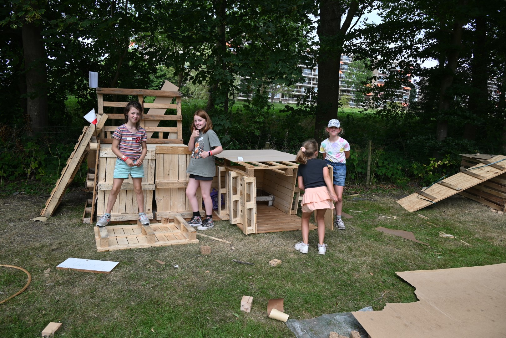 De kinderen hadden er bij de opening overigens al een hele dag opzitten vol activiteiten als knutselen, sporten en natuurlijk hutten bouwen. Hoewel de bouwvakvakantie inmiddels is begonnen, was daar op het veld niets van te merken. Er werd flink op los gezaagd en getimmerd. De hutten lijken elk jaar mooier en groter te worden, er was er zelfs eentje met een voortuin.
