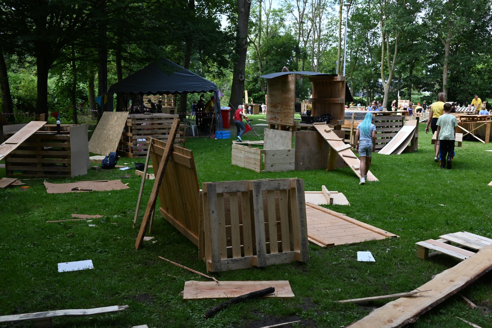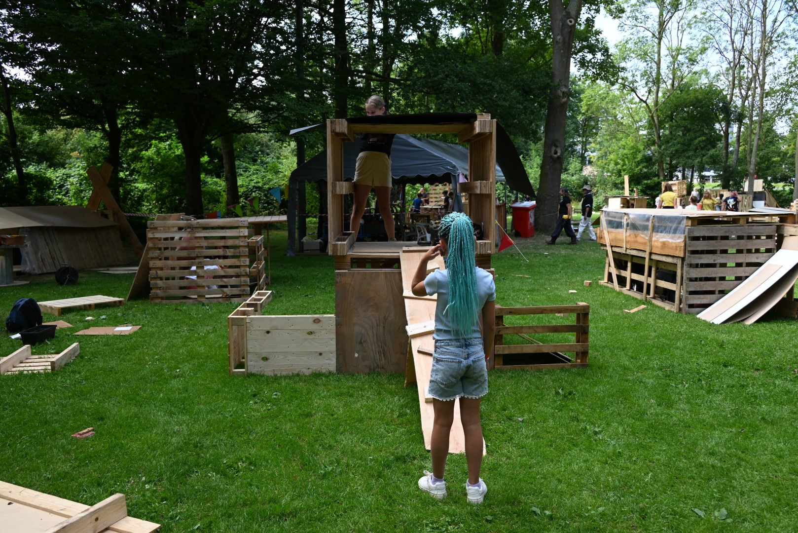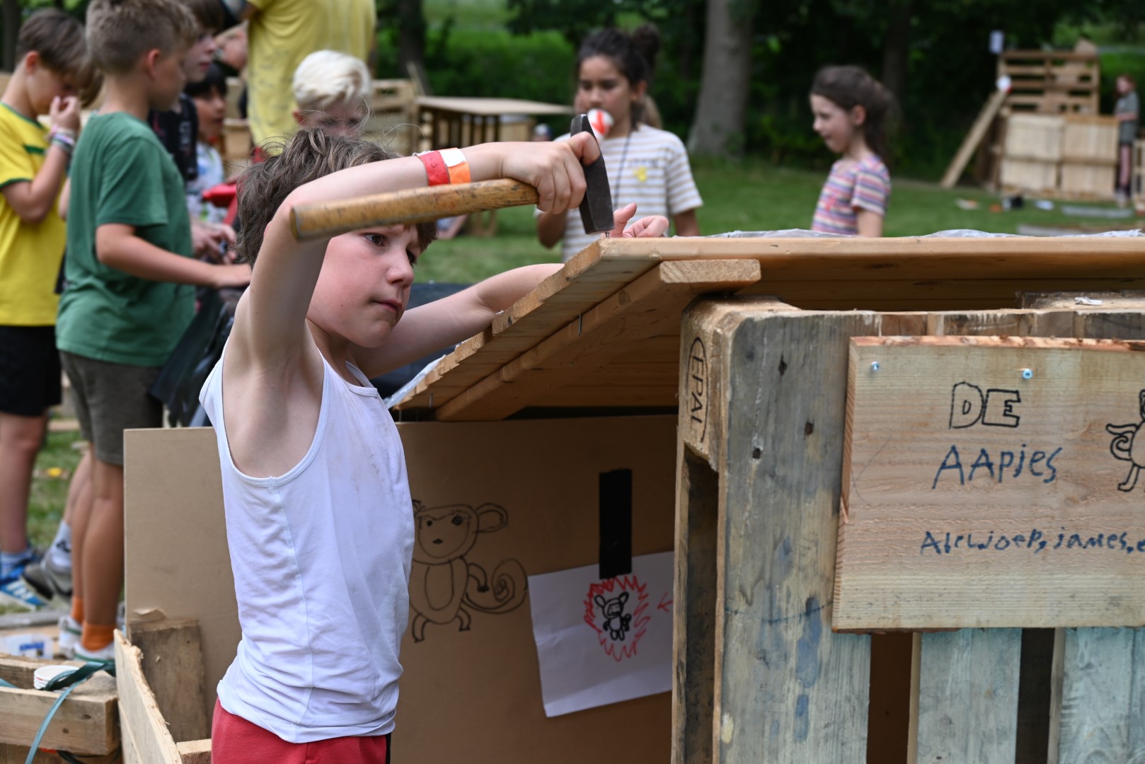 De kinderen hadden er bij de opening overigens al een hele dag opzitten vol activiteiten als knutselen, sporten en natuurlijk hutten bouwen. Hoewel de bouwvakvakantie inmiddels is begonnen, was daar op het veld niets van te merken. Er werd flink op los gezaagd en getimmerd. De hutten lijken elk jaar mooier en groter te worden, er was er zelfs eentje met een voortuin.