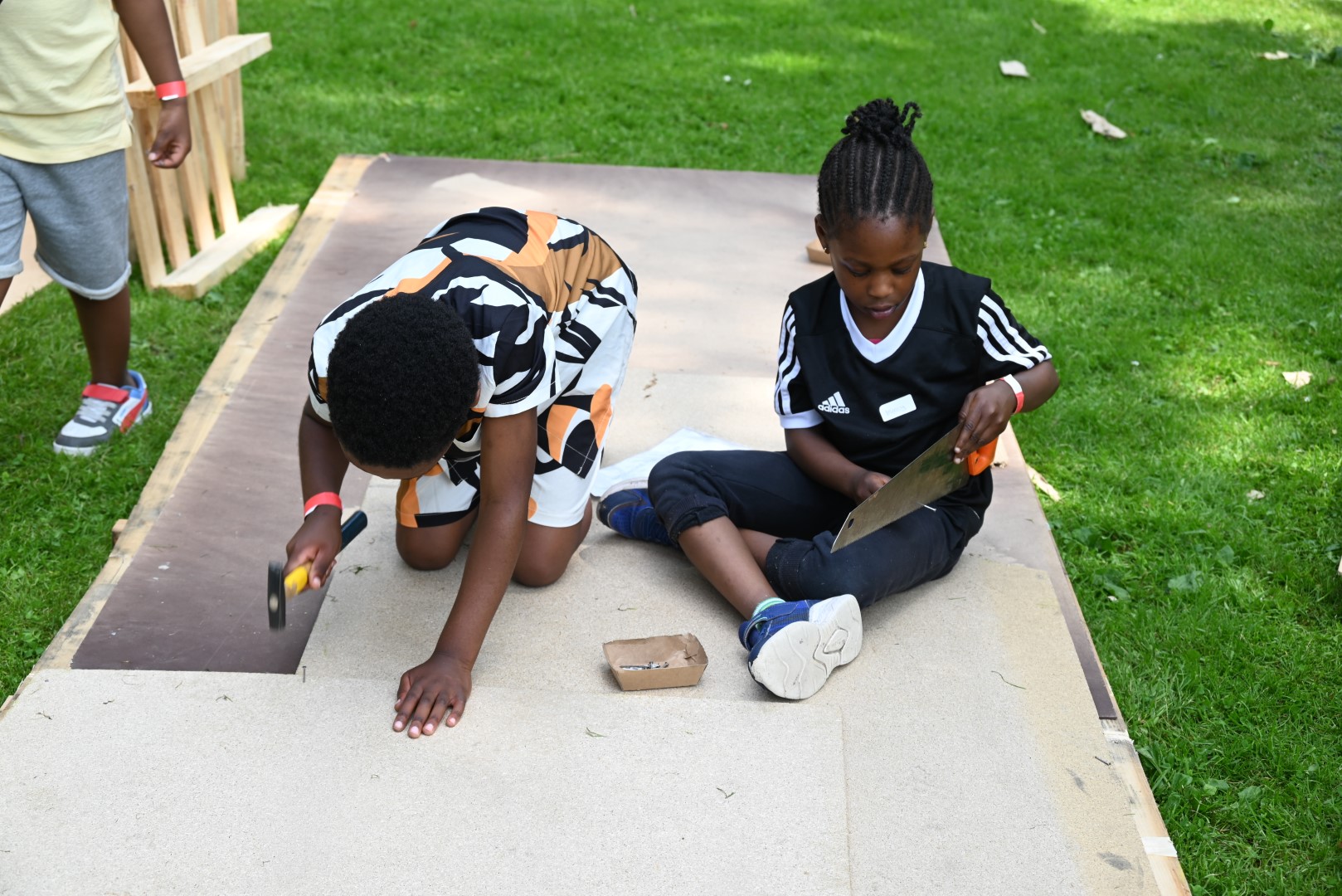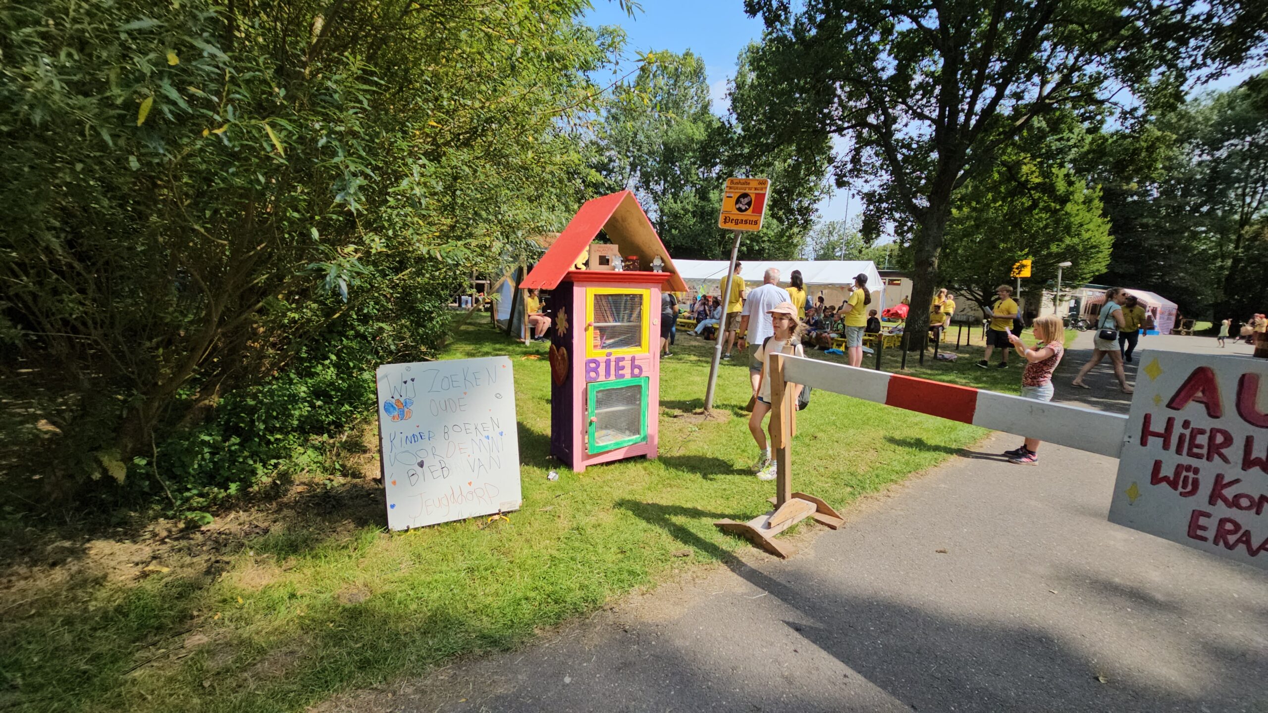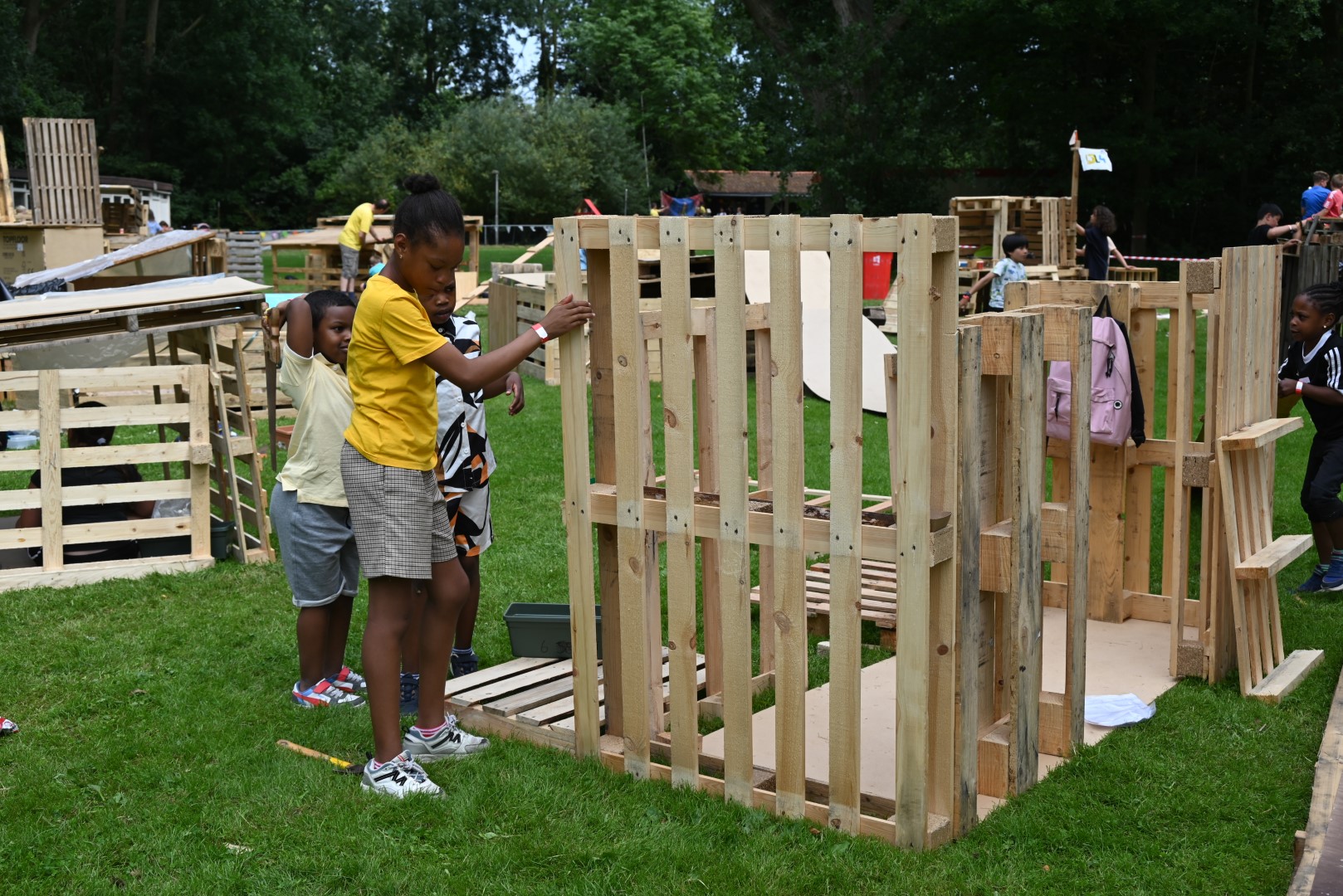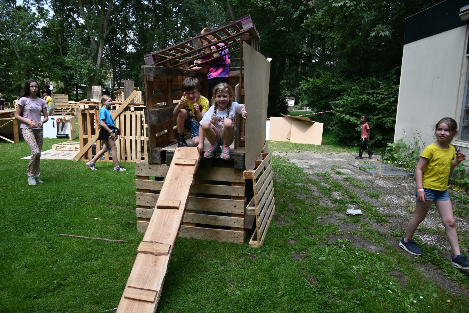 De kinderen hadden er bij de opening overigens al een hele dag opzitten vol activiteiten als knutselen, sporten en natuurlijk hutten bouwen. Hoewel de bouwvakvakantie inmiddels is begonnen, was daar op het veld niets van te merken. Er werd flink op los gezaagd en getimmerd. De hutten lijken elk jaar mooier en groter te worden, er was er zelfs eentje met een voortuin.