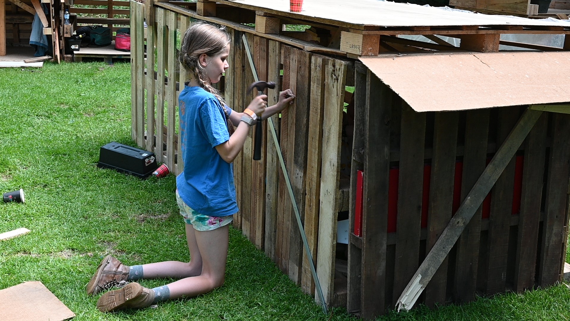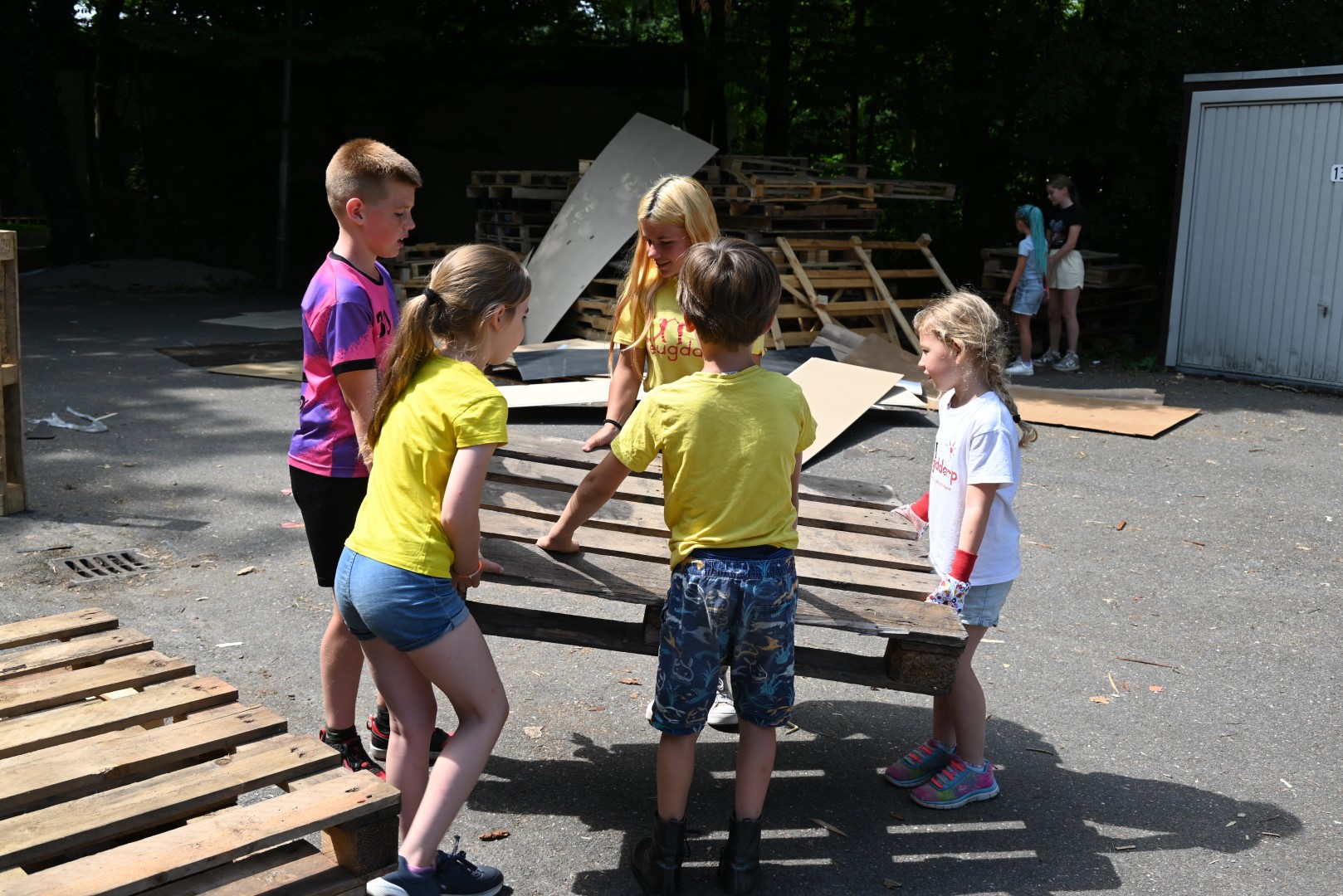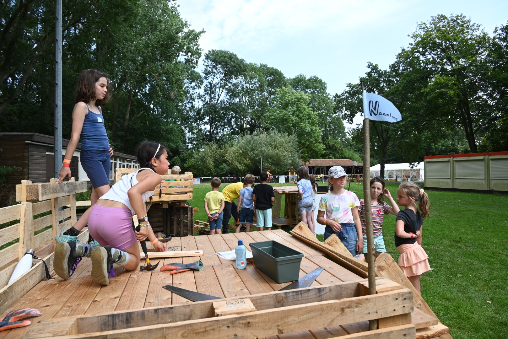 De kinderen zijn maandag al begonnen met het bouwen van hutten, knutselen en sporten, maar de opening is altijd een paar dagen later. Dan is er al wat te zien qua bouwwerken en zijn de kinderen inmiddels ook helemaal in de vakantiesfeer. Het weer zit dit jaar ook mee. Vorig jaar kwam het nog af en toe met bakken uit de hemel.
