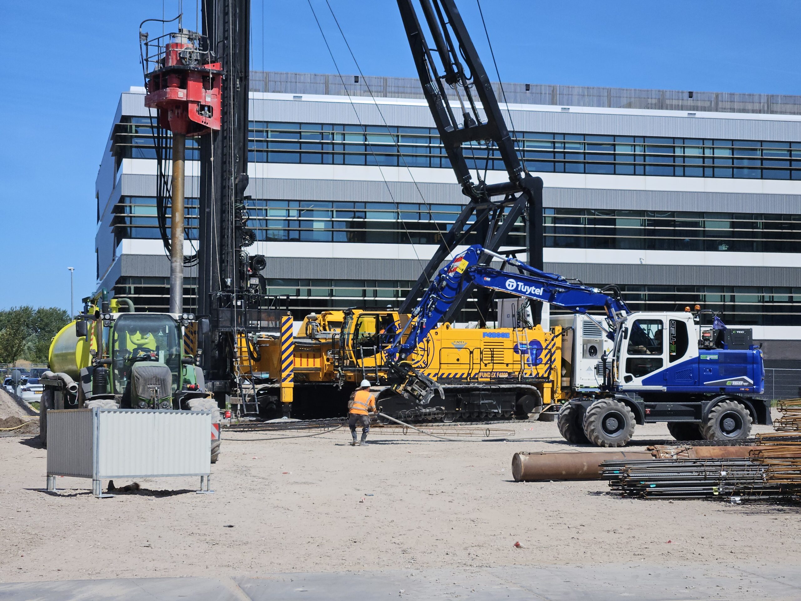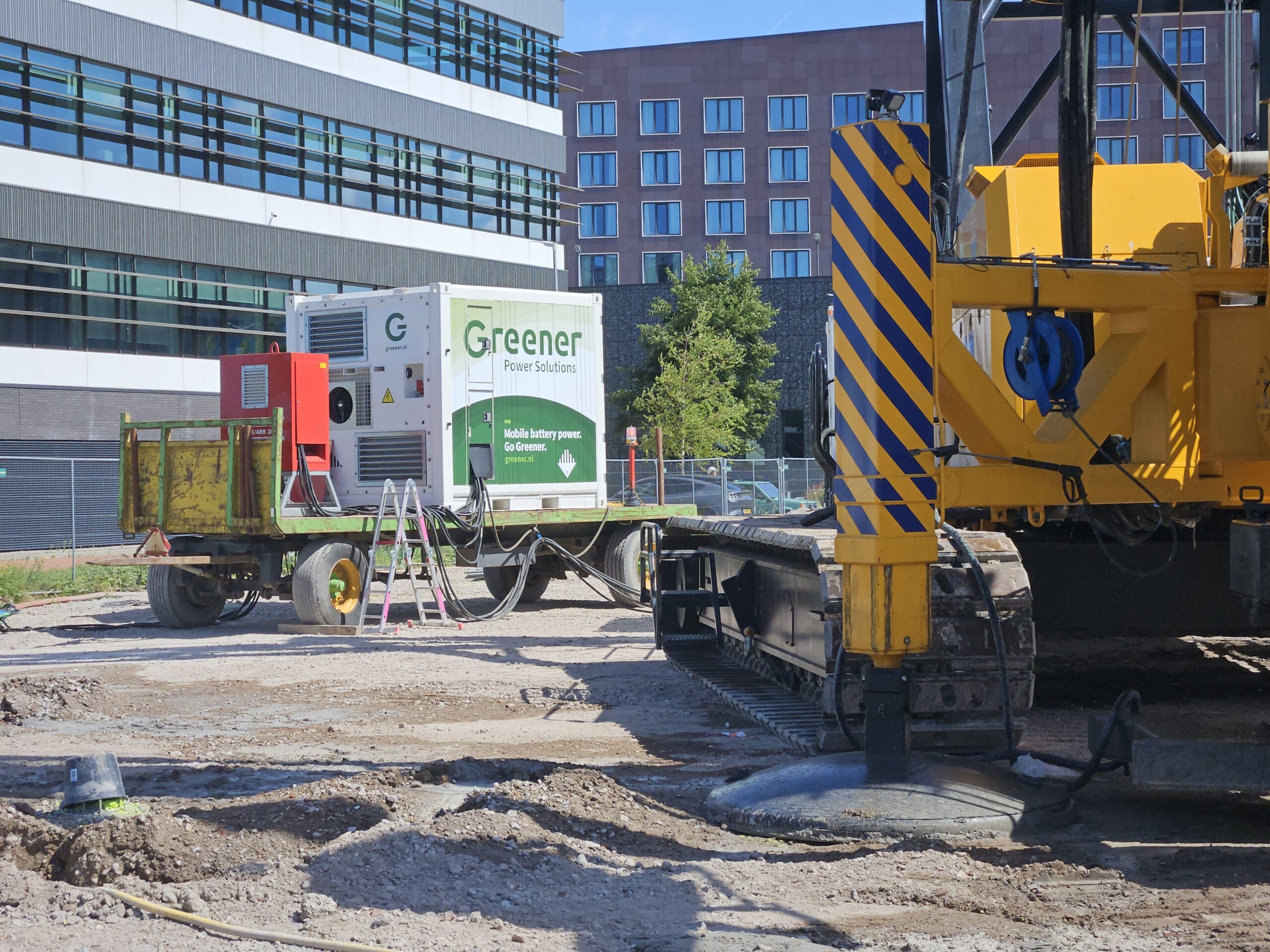 De elektriciteit uit deze grofweg tienduizend kilo wegende batterijen wordt op dit moment gebruikt om de fundering van het nieuwe gebouw in de grond te boren. De kraan waarmee Dura Vermeer deze werkzaamheden uitvoert, draait nu voor het eerst op stroom in plaats van diesel. Hoewel het afstemmen van de batterijen op de machines een vrij complex proces is, waar veel trial and error bij komt kijken, gaan de bouwwerkzaamheden zelf er niet anders aan toe dan voorheen.