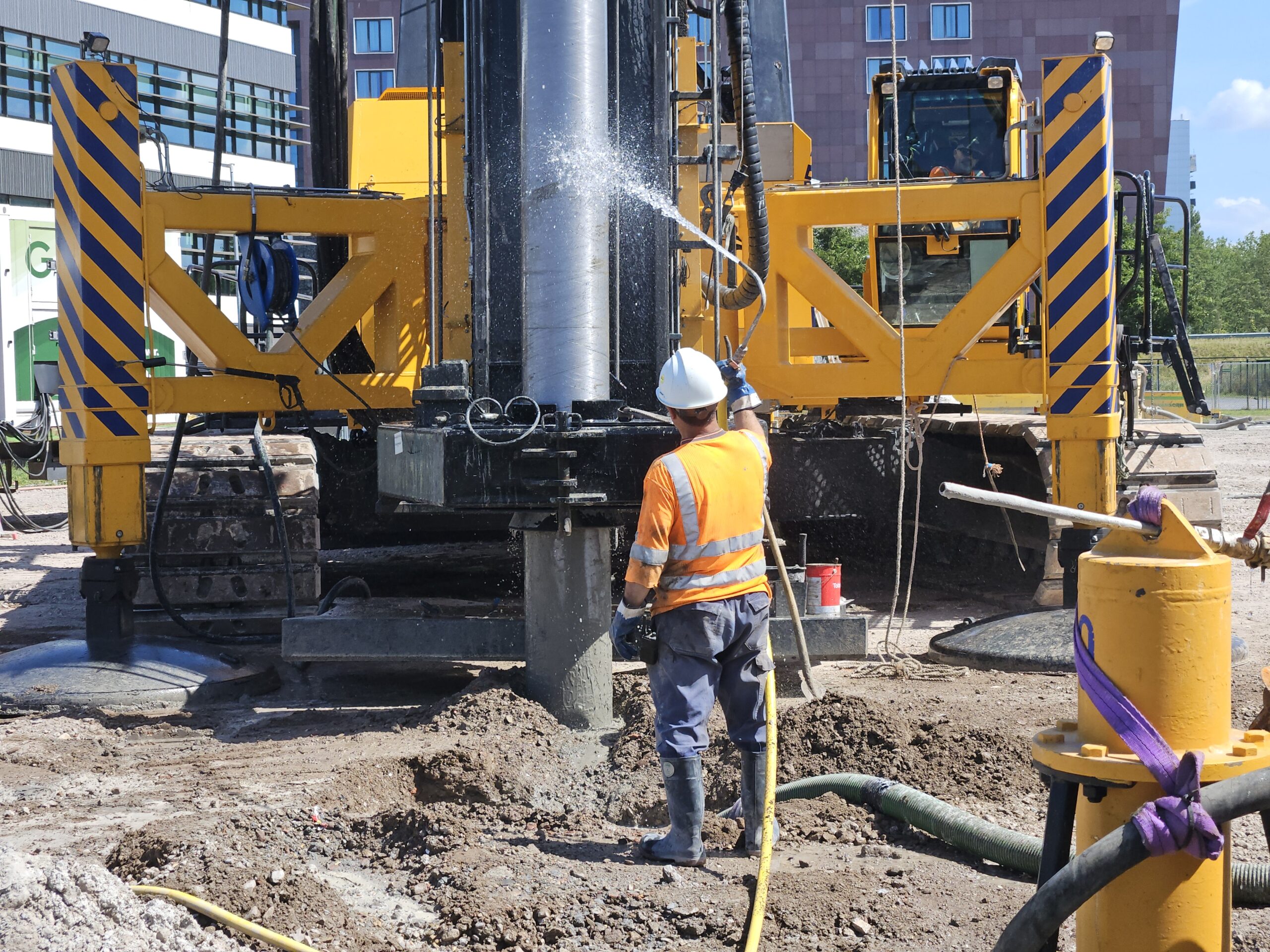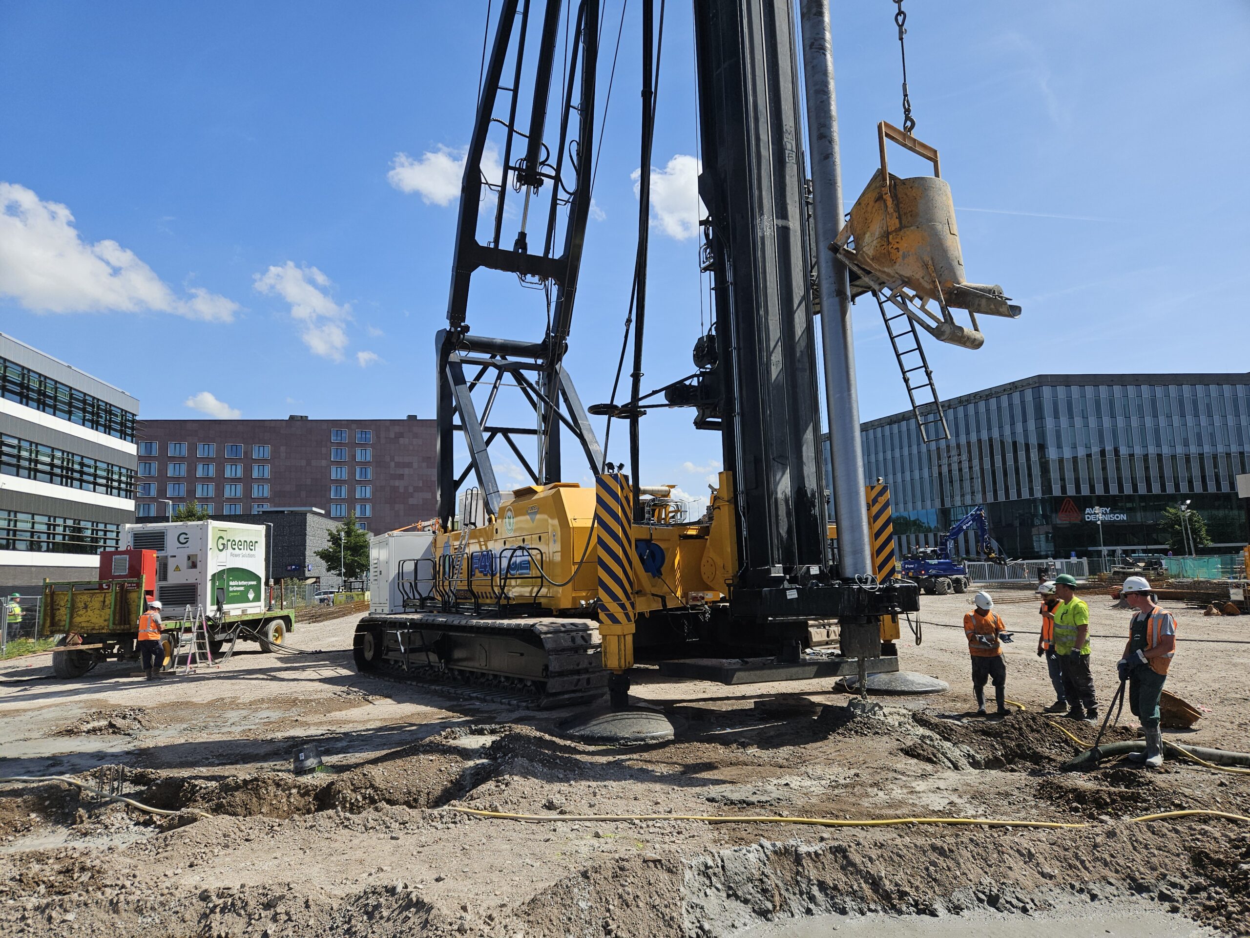 Er is nogal wat stroom nodig om de fundering van het nieuwe gebouw op zo’n vijftig meter diepte aan te leggen. “Je moet je ongeveer voorstellen dat deze boorstelling per dag net zoveel verbruikt als een huishouden in honderd dagen. Heel veel energie dus”, zegt Marnix Griffioen van Greener Power Solutions. Hij durft niet exact te zeggen hoeveel uitstoot dit bouwproject in totaal zal besparen. “Maar als je dit in dieseluitvoering zou doen, zou je duizenden liters diesel per week opstoken. Die besparen we in ieder geval.”