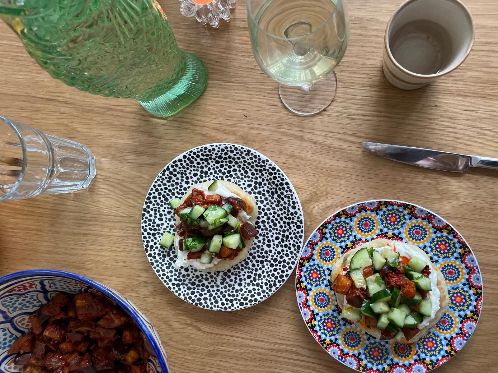 Snijd de komkommer en kruiden fijn en met dit met de azijn, water, zout, suiker en honing. Laat dit 15 minuten inweken en gebruik het als een verse topping voor op de pita. Voeg op het laats een likje chili olie toe als extra topping.