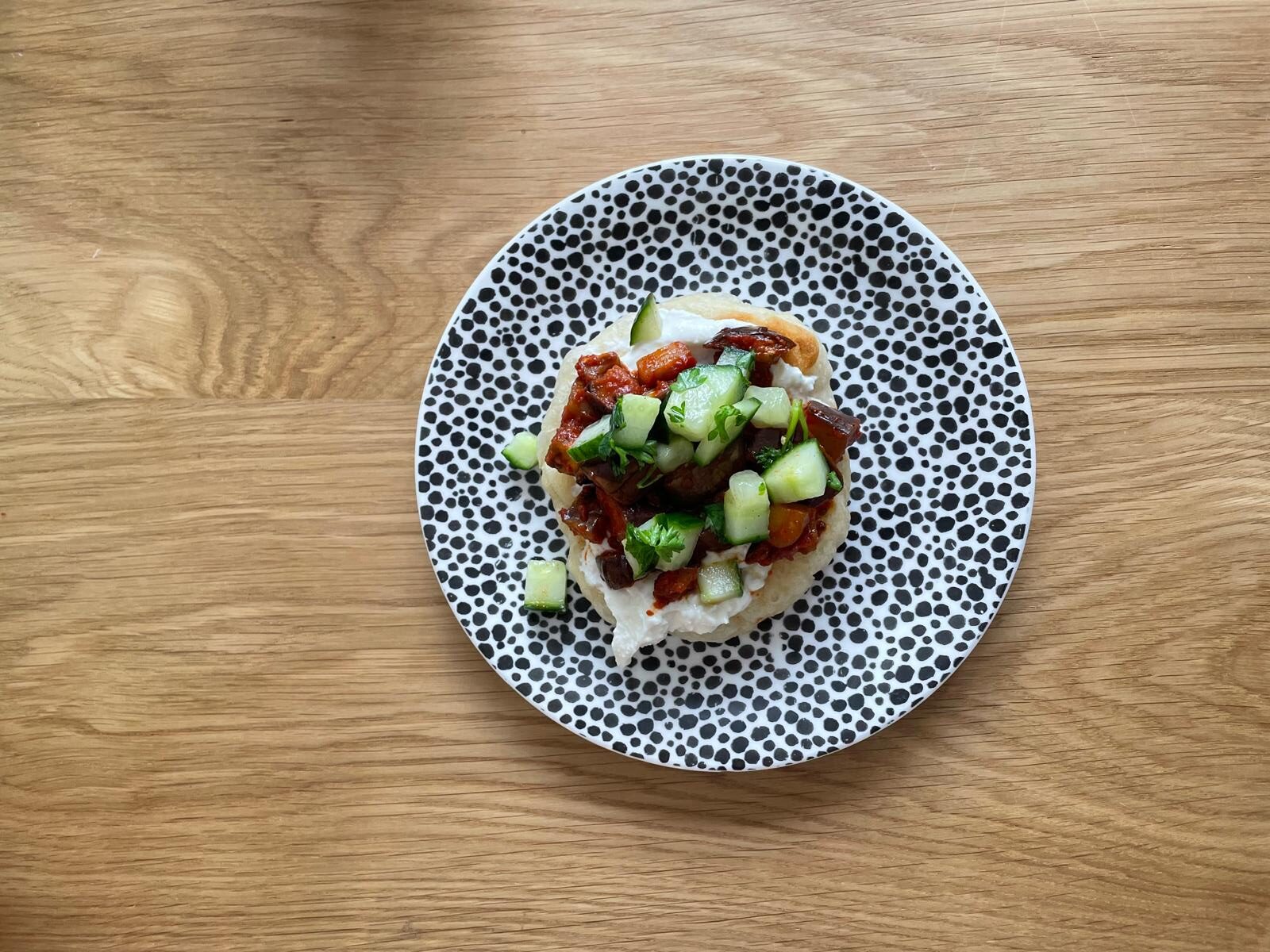 Voeg de pita, aubergine, feta en de topping toe tot 1 lekker vegetarisch broodje!