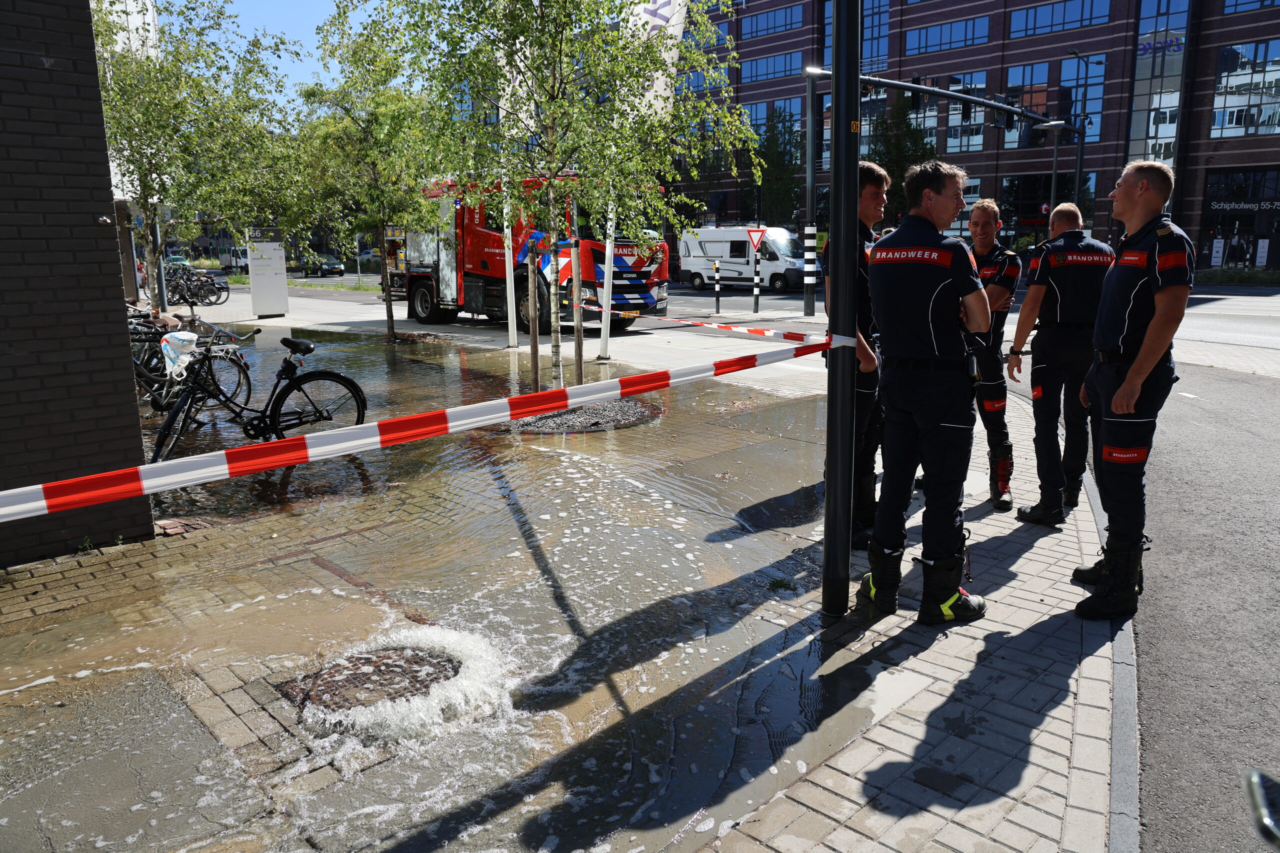 Het water borrelt op uit een rioolput en spoelt over de bestrating van het gebouw. Een deel van de bestrating is hierdoor al weggezakt. De brandweer en waterleidingbedrijf Dunea zijn op zoek naar de plek waar de leiding is gesprongen.