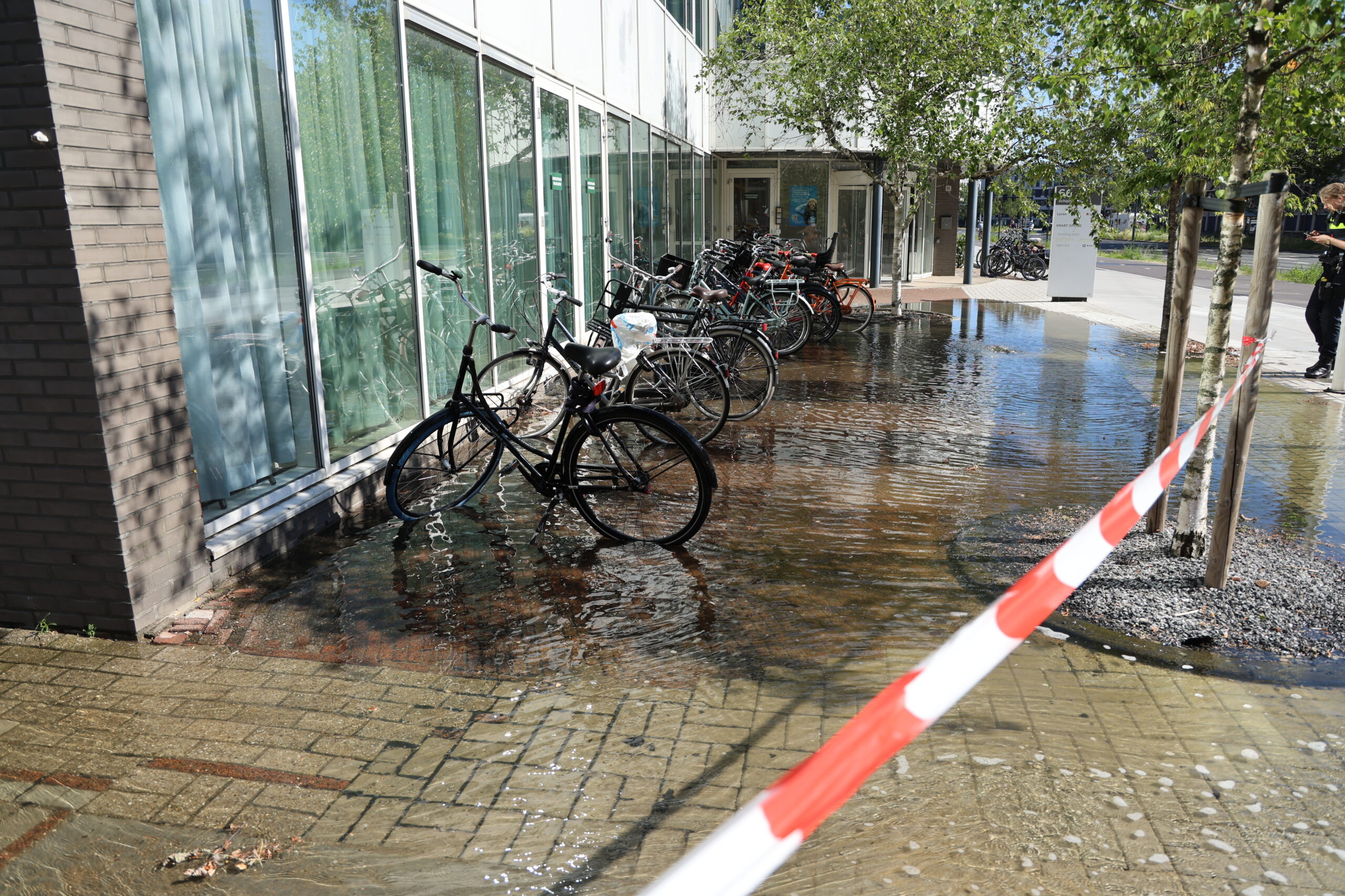 Een gesprongen waterleiding aan de Schipholweg in Leiden ter hoogte van het Achmeagebouw zorgt niet voor de nodige verfrissing op deze warme maandagochtend, het levert flink wat overlast op.