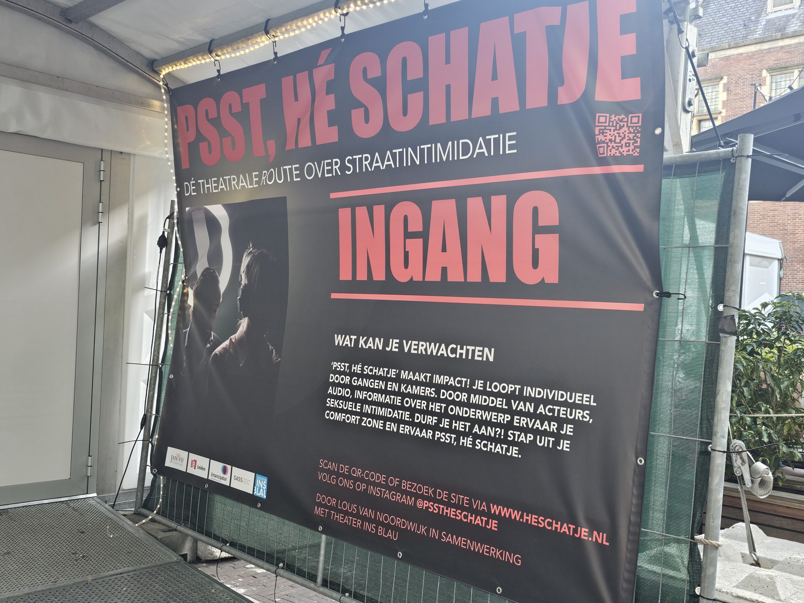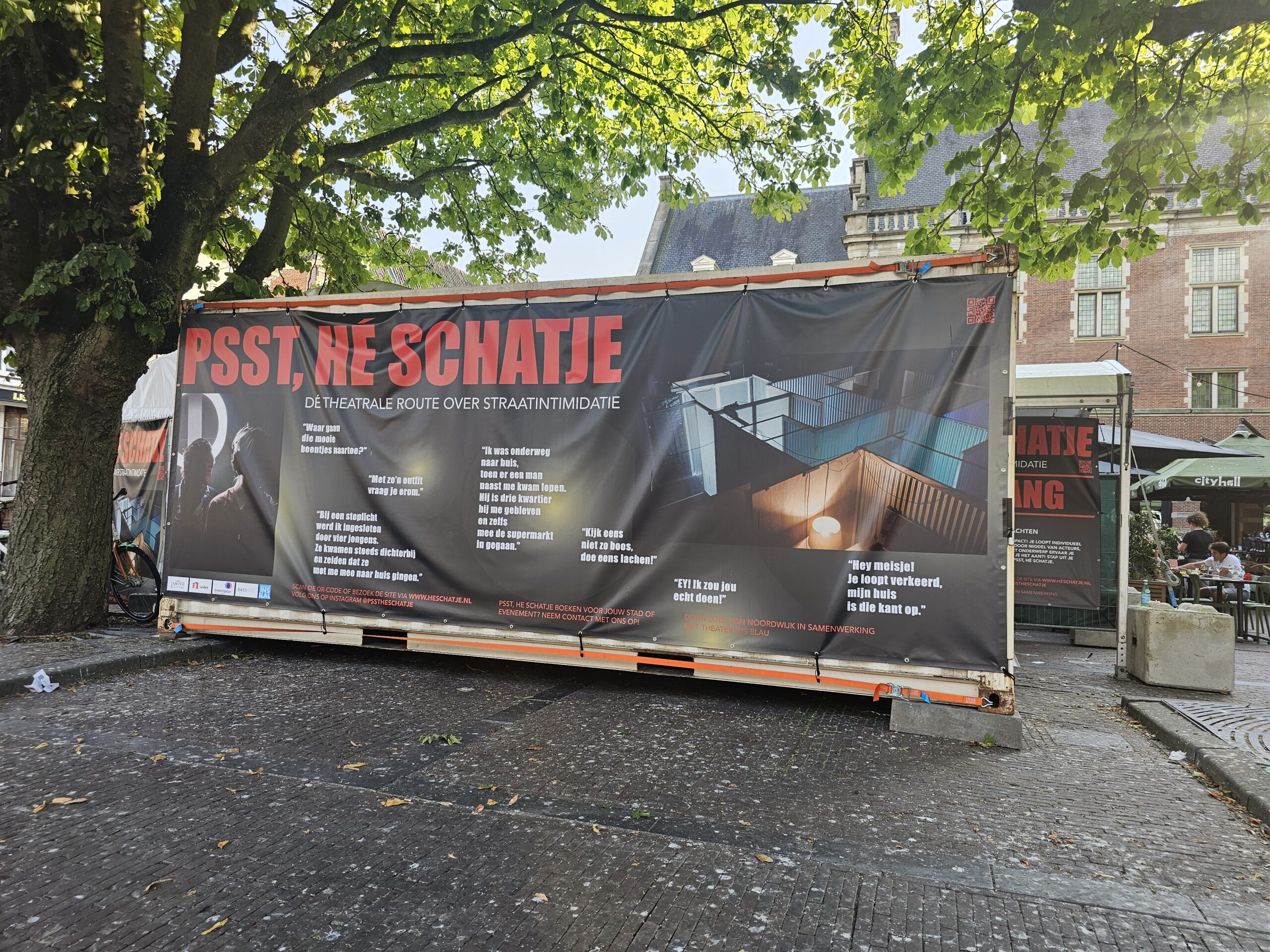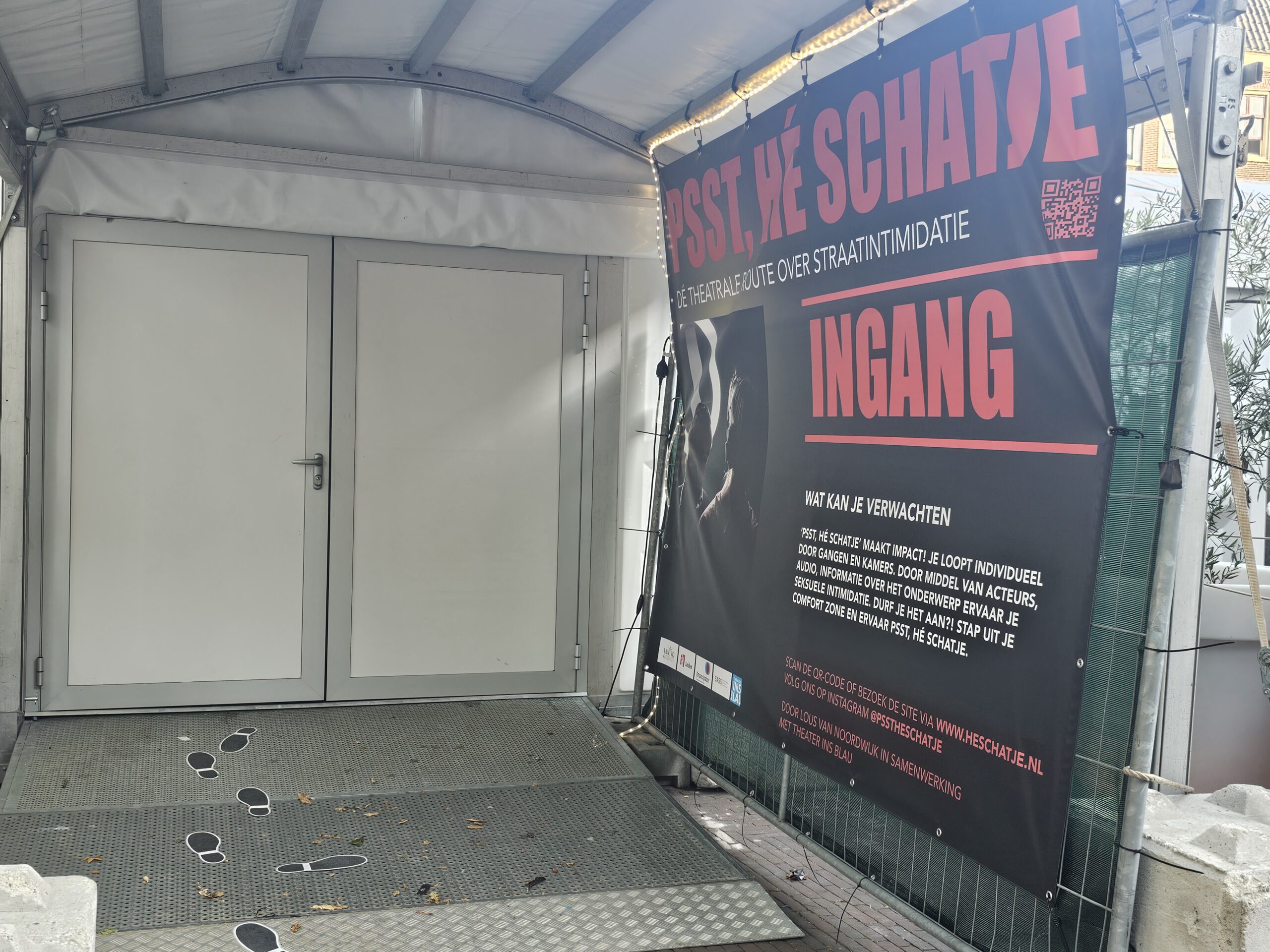 Nog tot donderdagavond staat de container waarin de voorstelling ‘Psst, hé Schatje’ zich afspeelt op het Stadhuisplein in Leiden. Het is een installatie die is gemaakt door Lous van Noordwijk die daarvoor de samenwerking zocht met Theater Ins Blau. De voorstelling gaat over seksuele straatintimidatie.