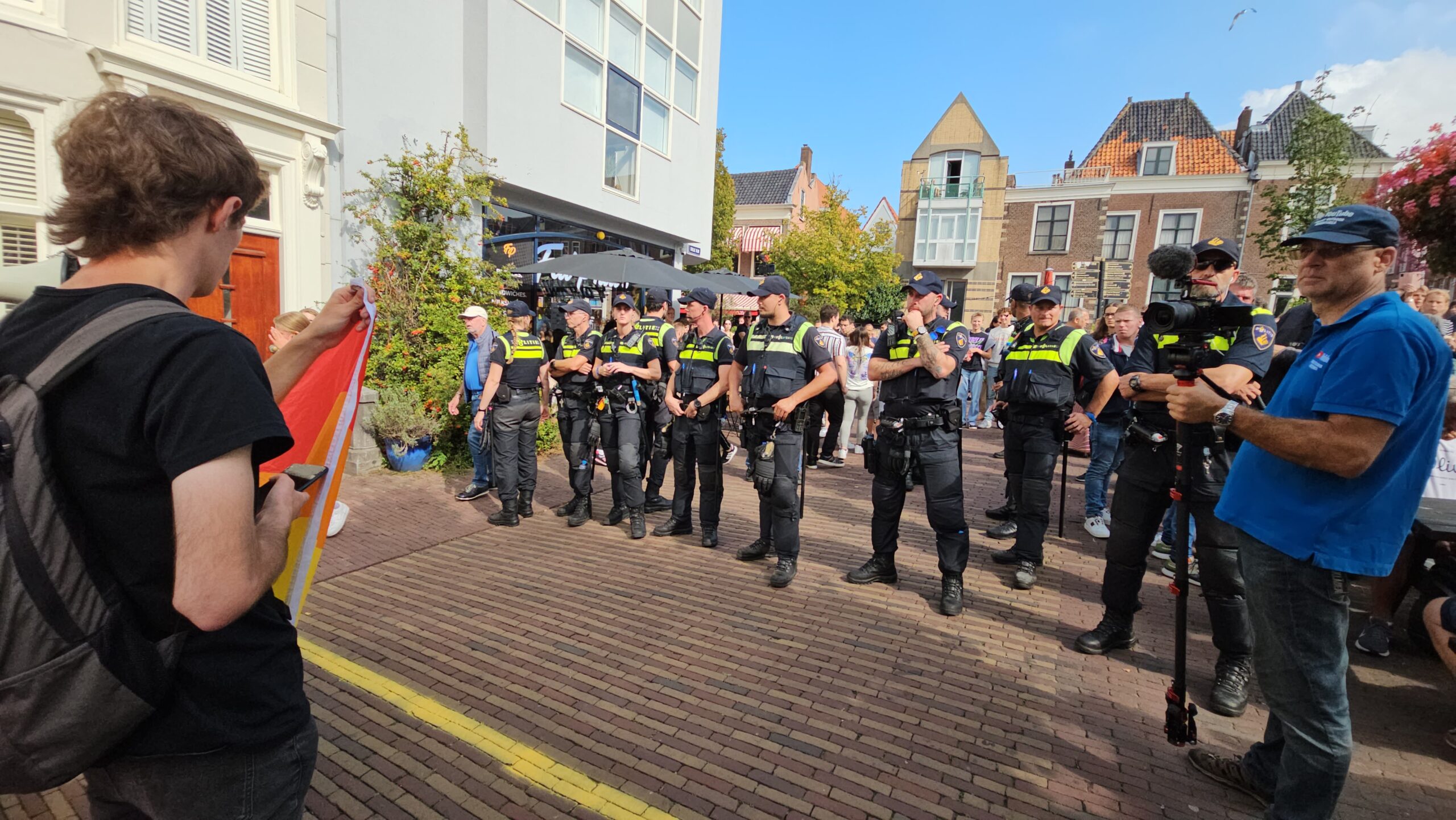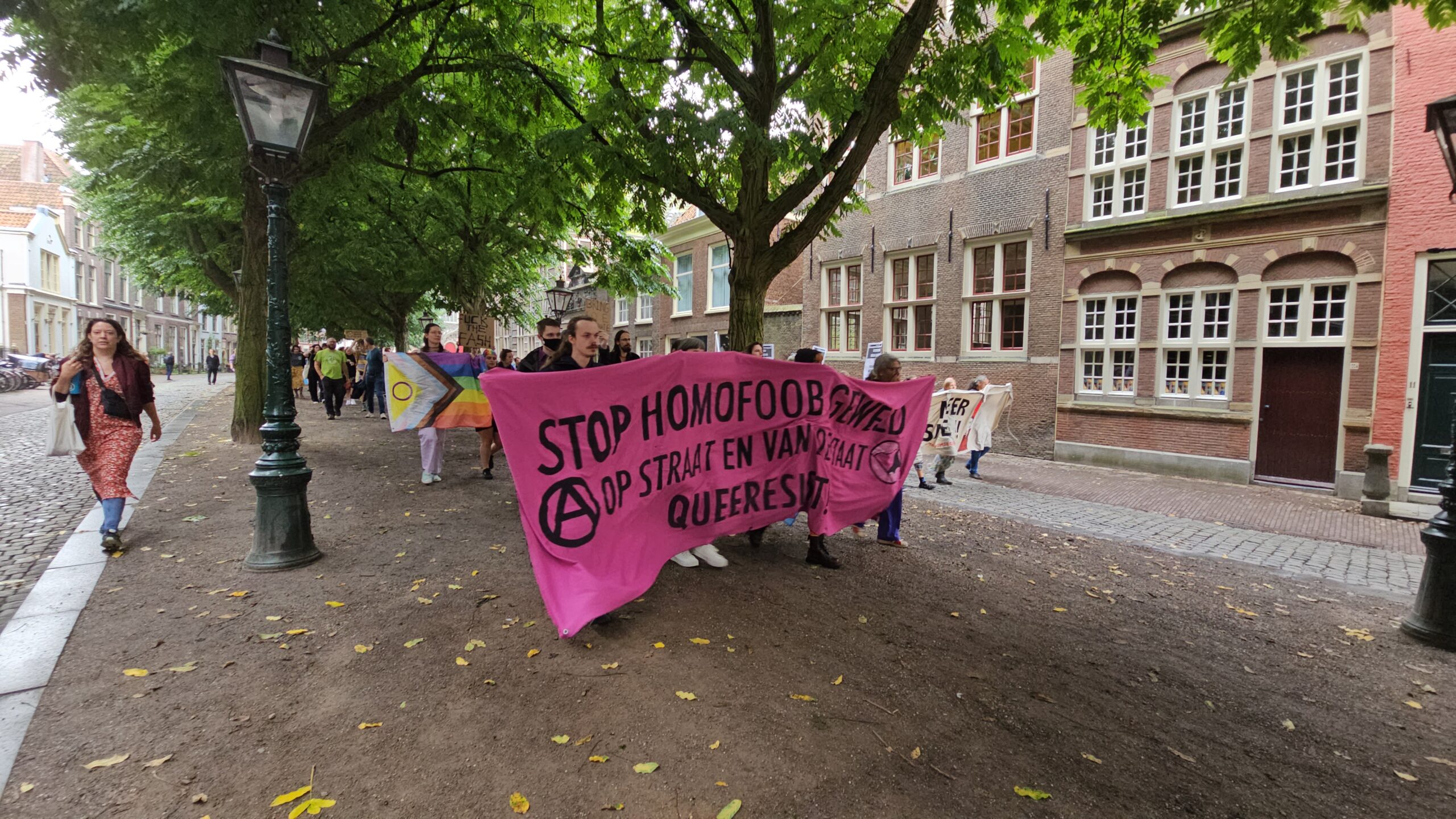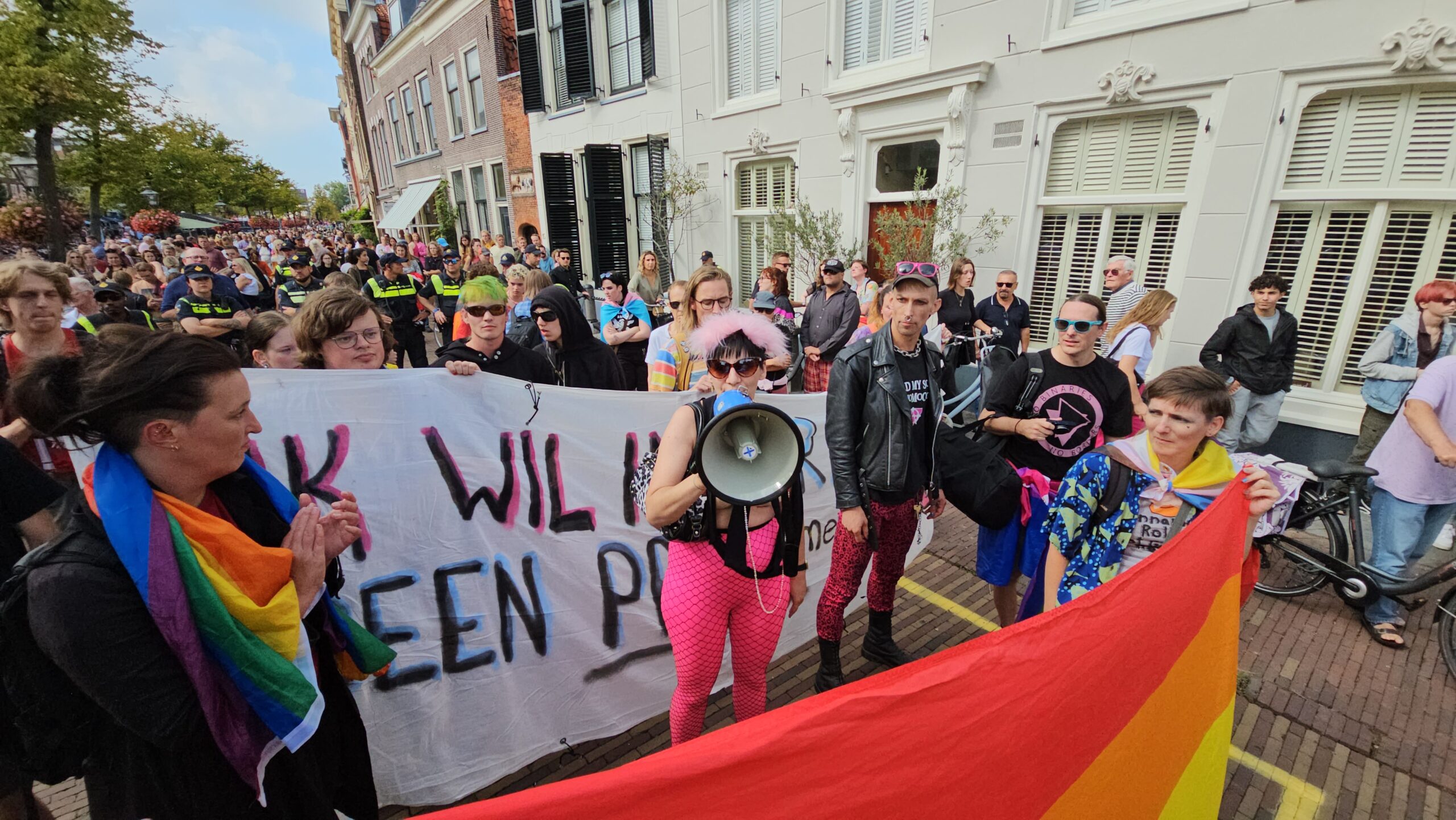 Vorig jaar waren er voorafgaand en tijdens de Pride ook protesten. ’s Ochtends gericht tegen voorlees dragqueen Dina Diamond en ’s middags tegen de ‘kapitalistische insteek’ die de Pride volgens de demonstranten heeft. Ze vroegen vooral om meer aandacht voor queer- en transrechten. Dat deden ze ook begin vorige maand nog eens op de brug waar ze vorig jaar tijdens de Pride werden verdreven door de politie. (Foto’s: Chris de Waard)