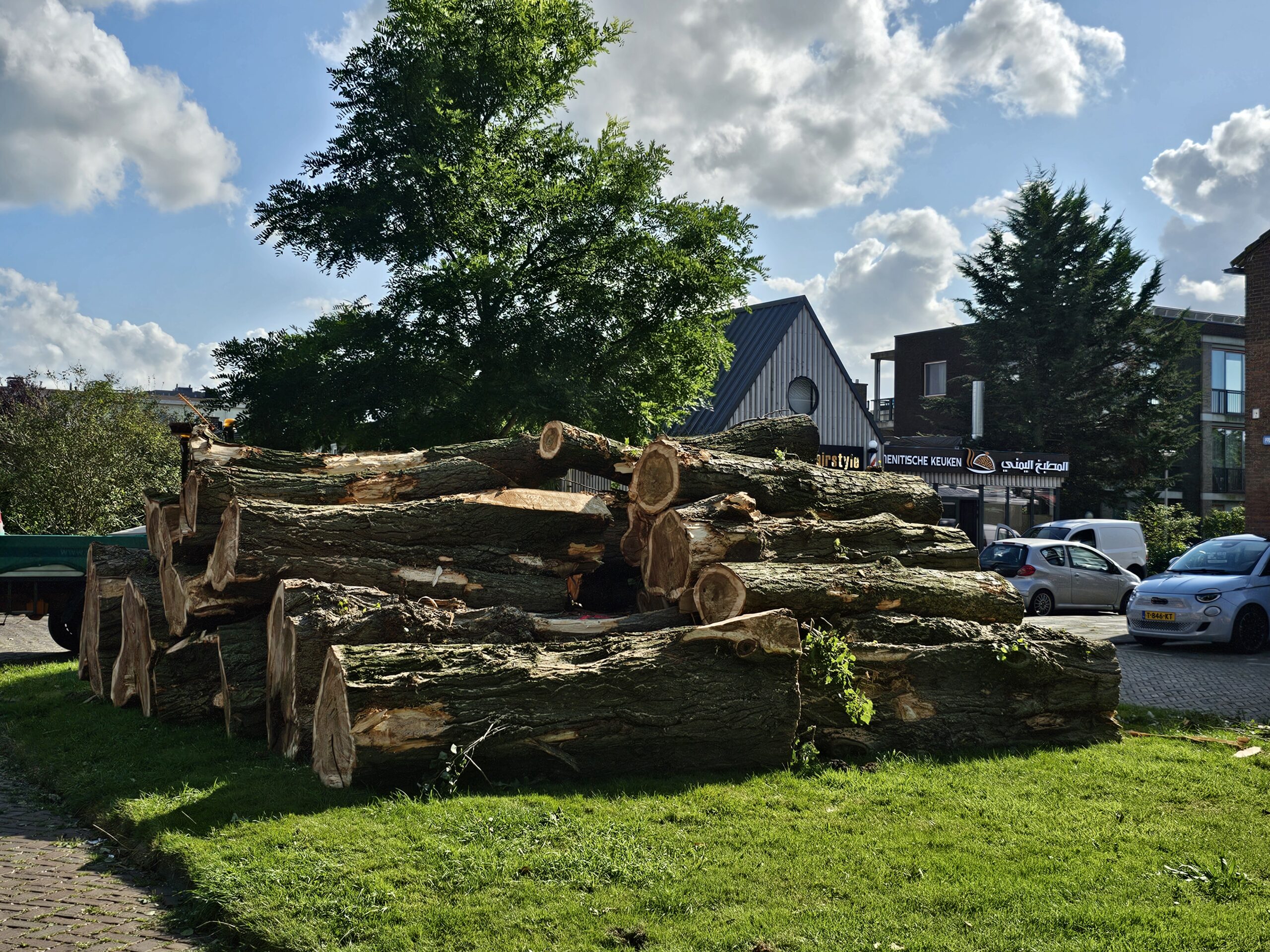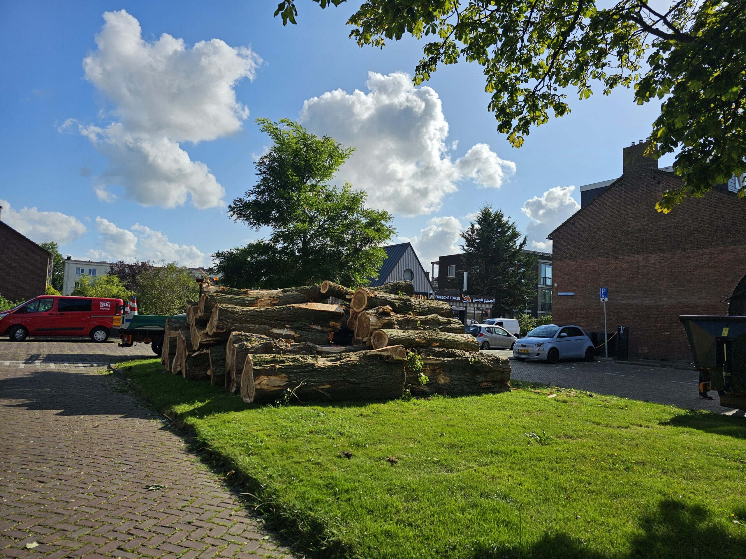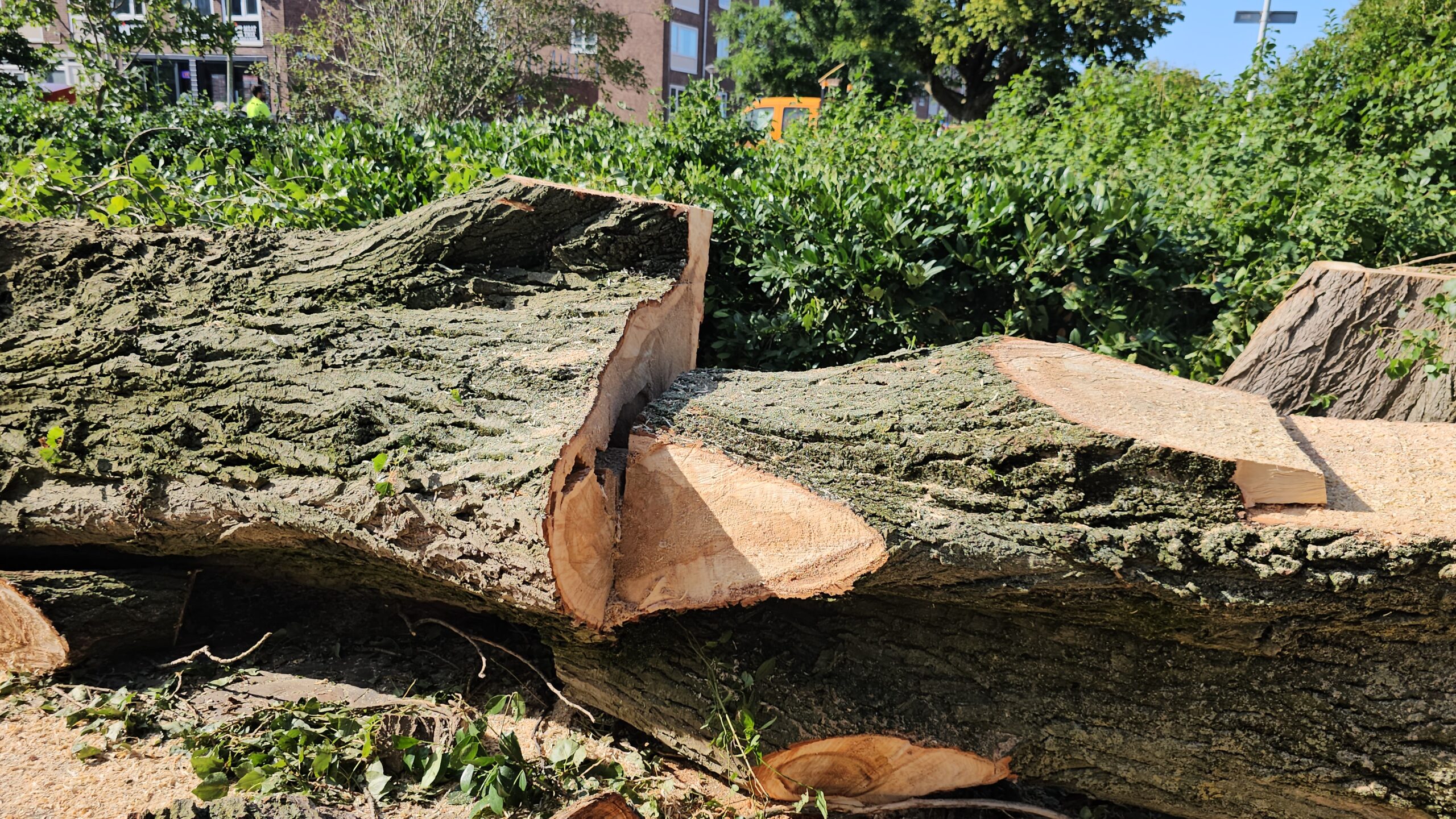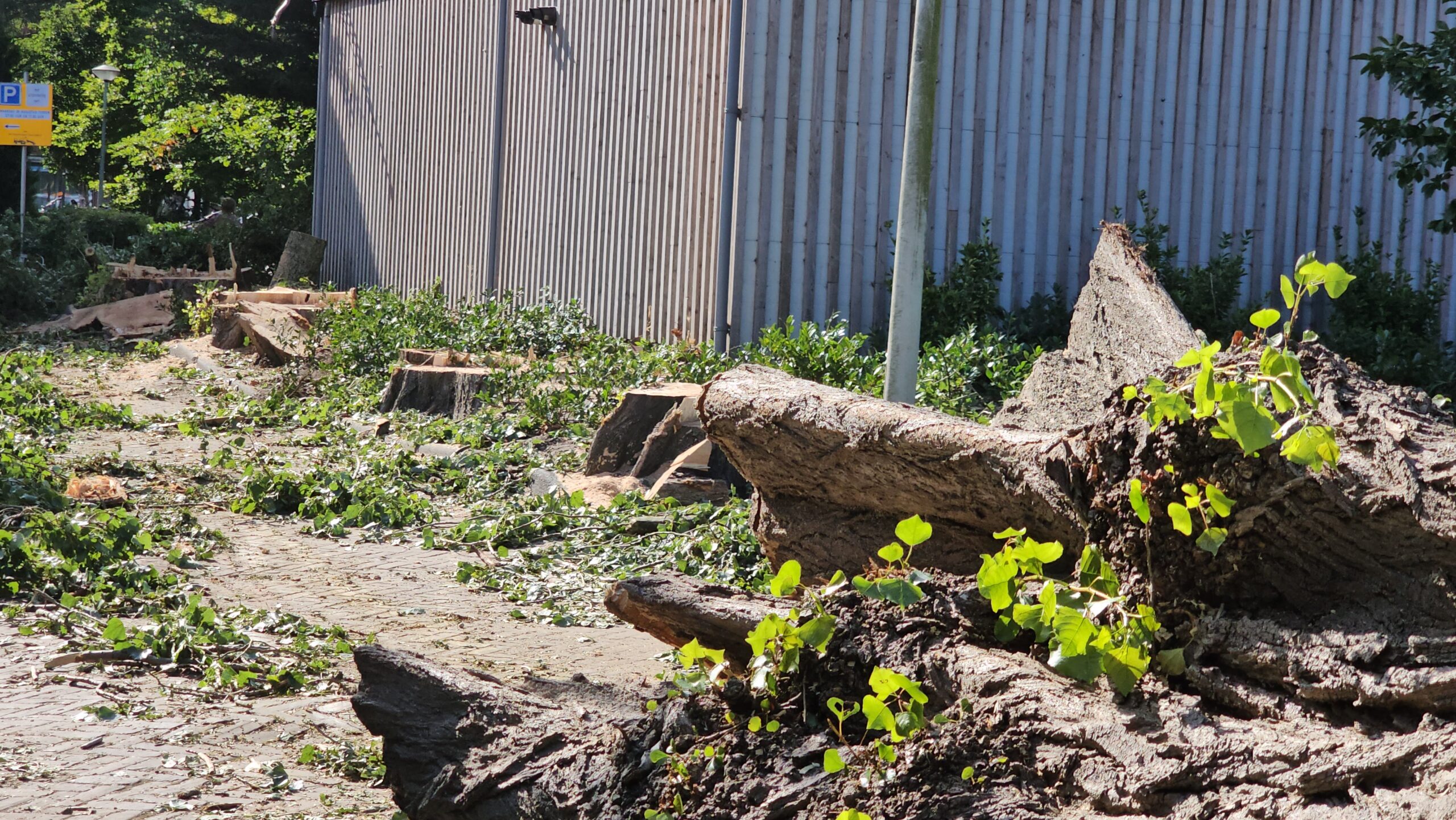 Het rijtje populieren op de hoek van de Frederik van Eedenlaan en de Willem Klooslaan in Haagwijk-Zuid in Leiden is gisteren omgezaagd. De bomen waren volgens de gemeente al een tijdje aan het einde van hun levensduur en begonnen gevaar op te leveren. Aan de doorgezaagde stammen van de groene reuzen is dat ook wel te zien.