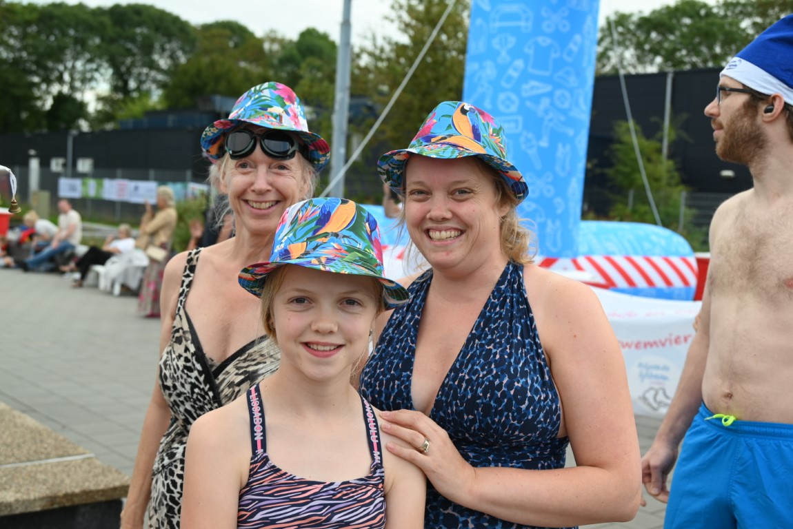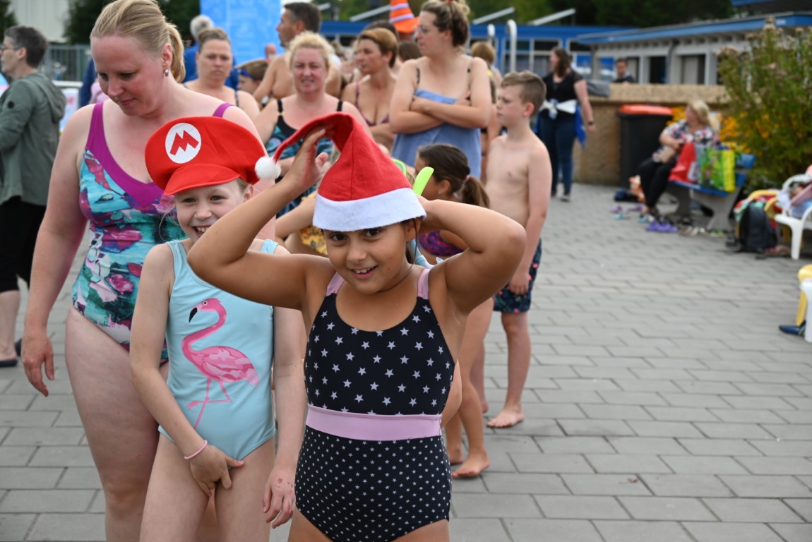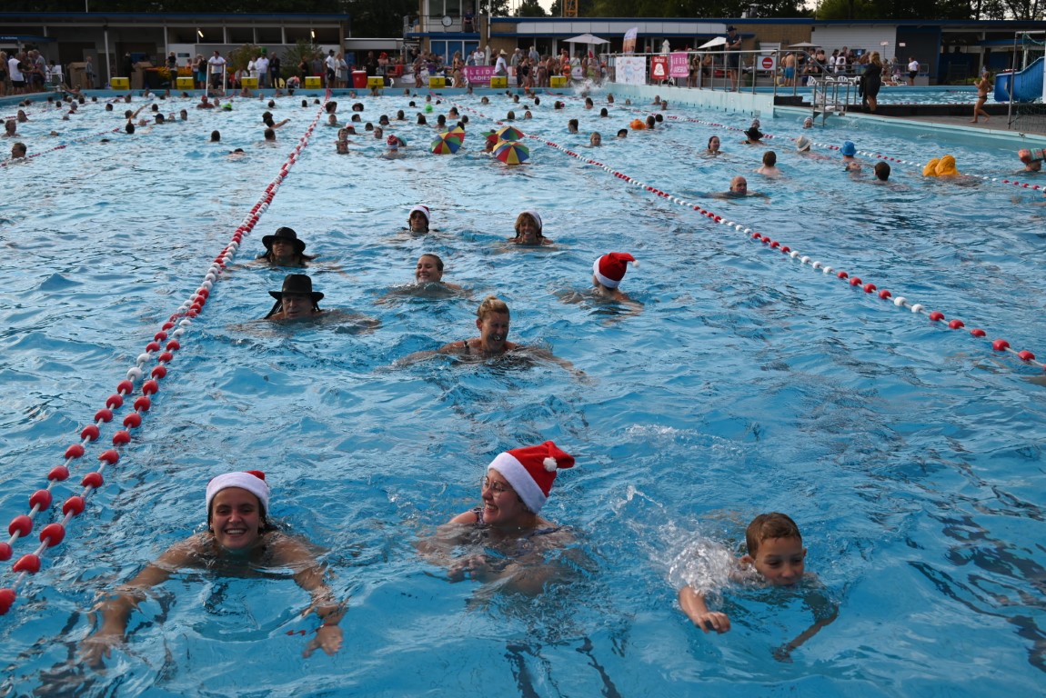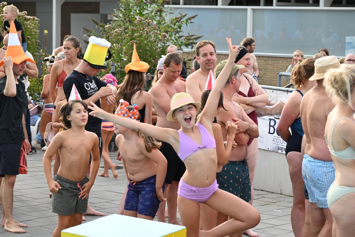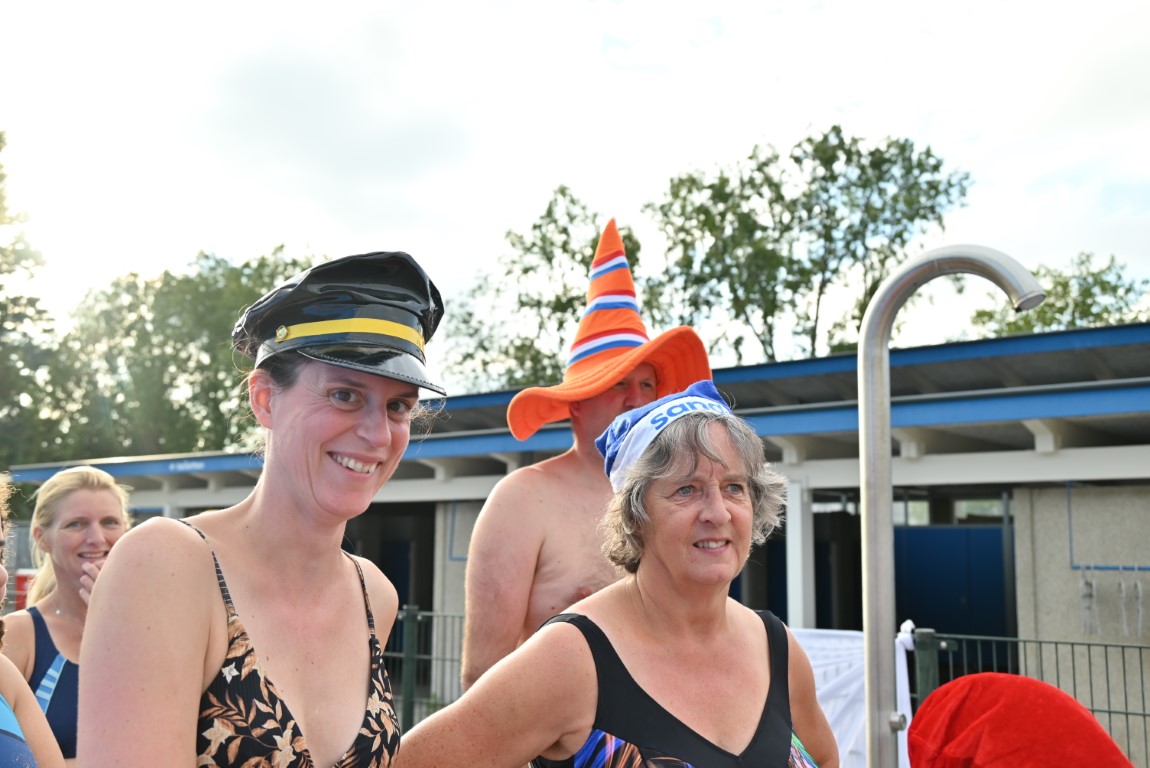 De selectie van zwemhoedjes die Emile van Aelst langs zag komen bestond onder andere uit glas bier, verschillende oranjehoeden, veel kerstmutsen, Dimario, een Sinterklaasmijter, allerlei hoedjes en zelfs een clubje met paraplu’s op hun hoofd. Twee dinosaurussen waren wel erg origineel, maar uit veiligheidsoverwegingen gingen ze maar niet het water in.