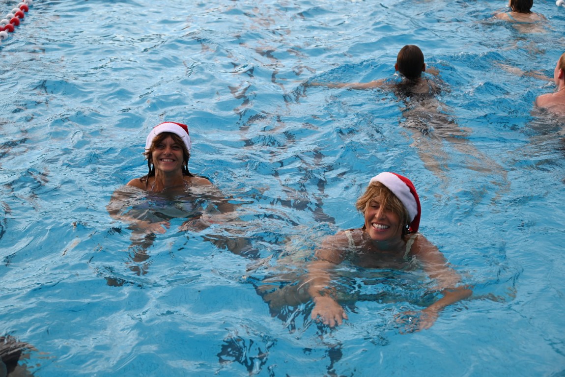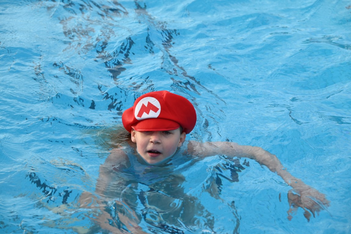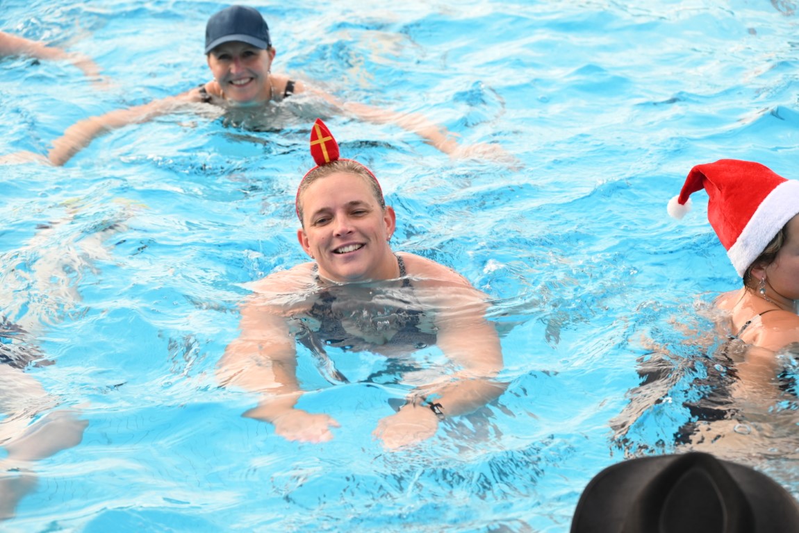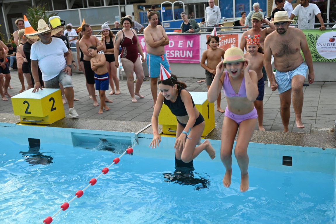 De selectie van zwemhoedjes die Emile van Aelst langs zag komen bestond onder andere uit glas bier, verschillende oranjehoeden, veel kerstmutsen, Dimario, een Sinterklaasmijter, allerlei hoedjes en zelfs een clubje met paraplu’s op hun hoofd. Twee dinosaurussen waren wel erg origineel, maar uit veiligheidsoverwegingen gingen ze maar niet het water in.