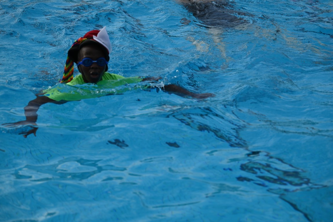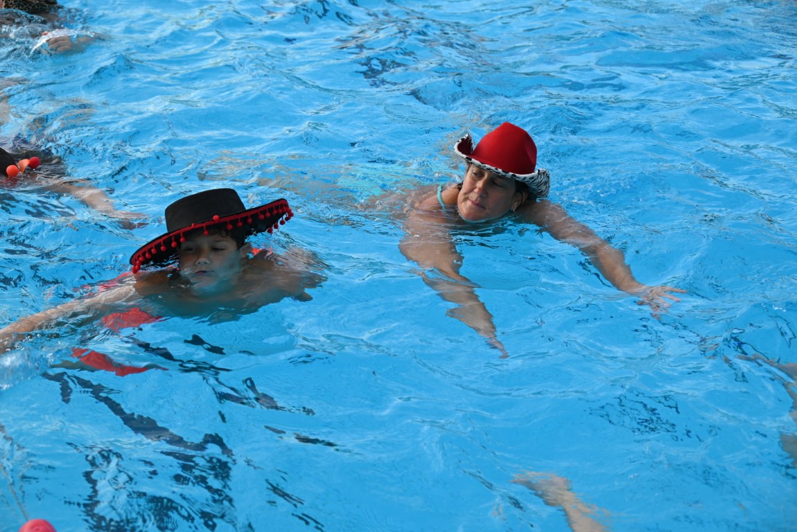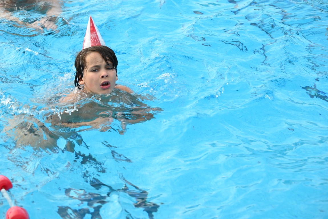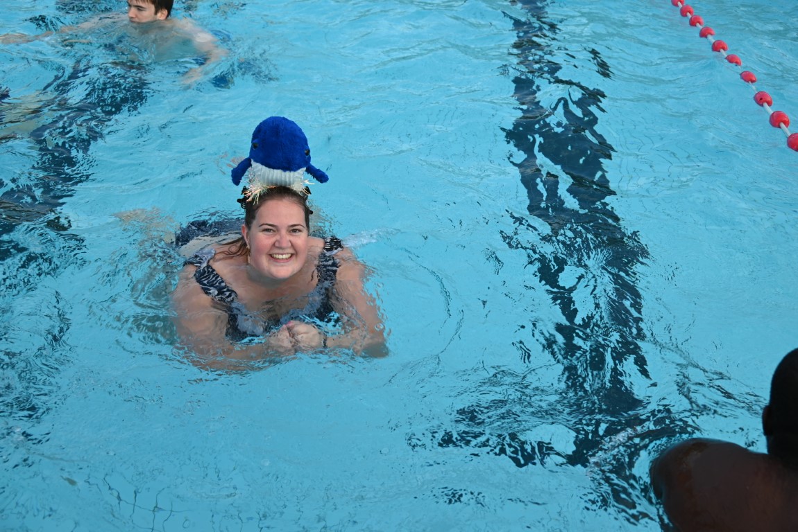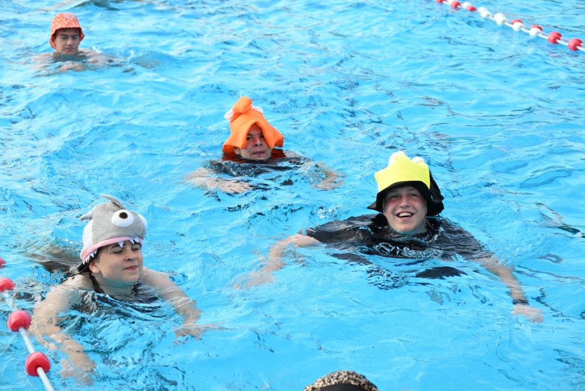 De selectie van zwemhoedjes die Emile van Aelst langs zag komen bestond onder andere uit glas bier, verschillende oranjehoeden, veel kerstmutsen, Dimario, een Sinterklaasmijter, allerlei hoedjes en zelfs een clubje met paraplu’s op hun hoofd. Twee dinosaurussen waren wel erg origineel, maar uit veiligheidsoverwegingen gingen ze maar niet het water in.