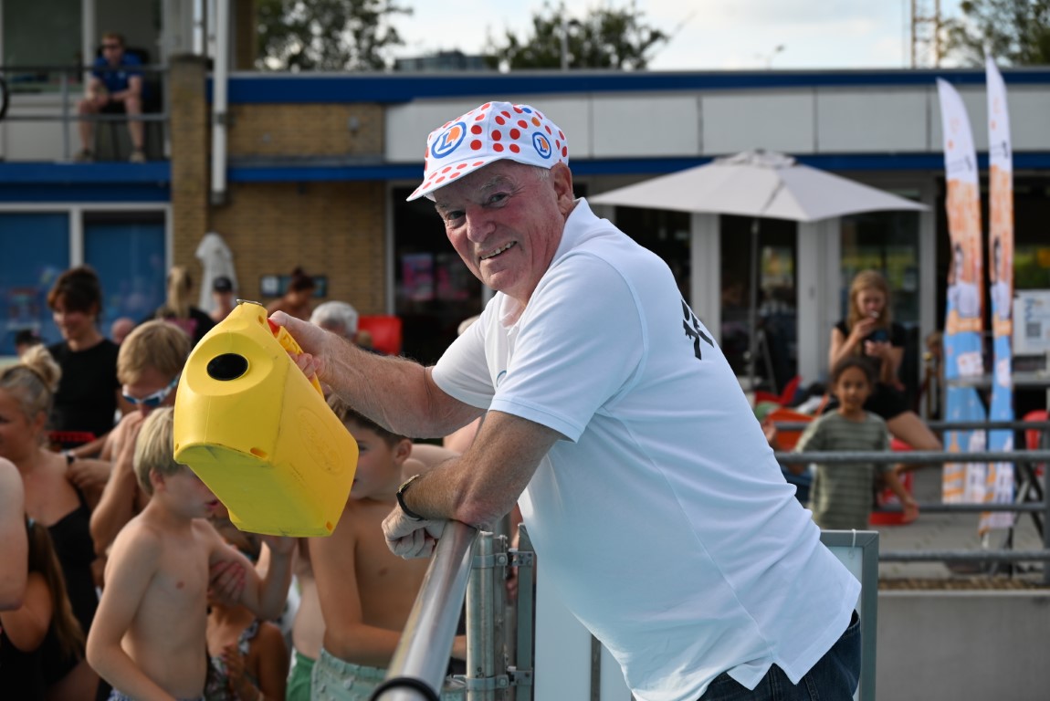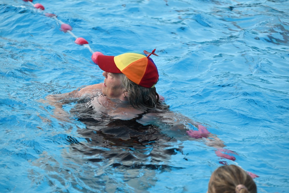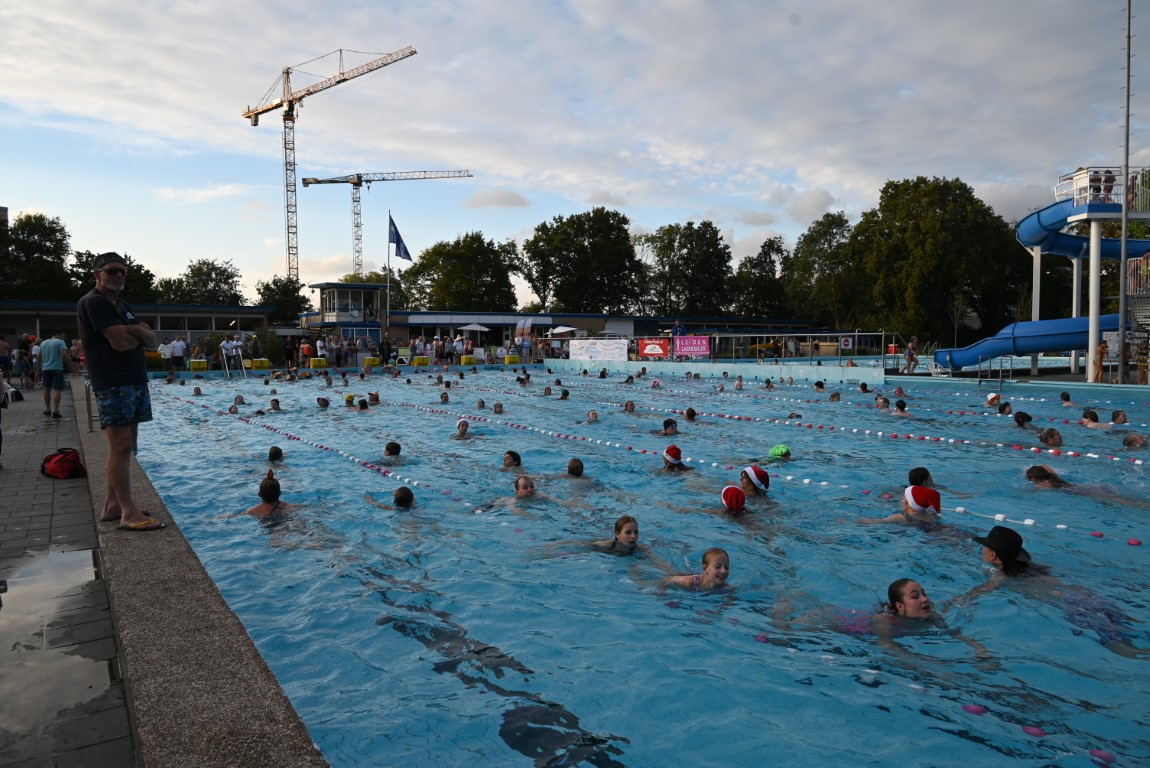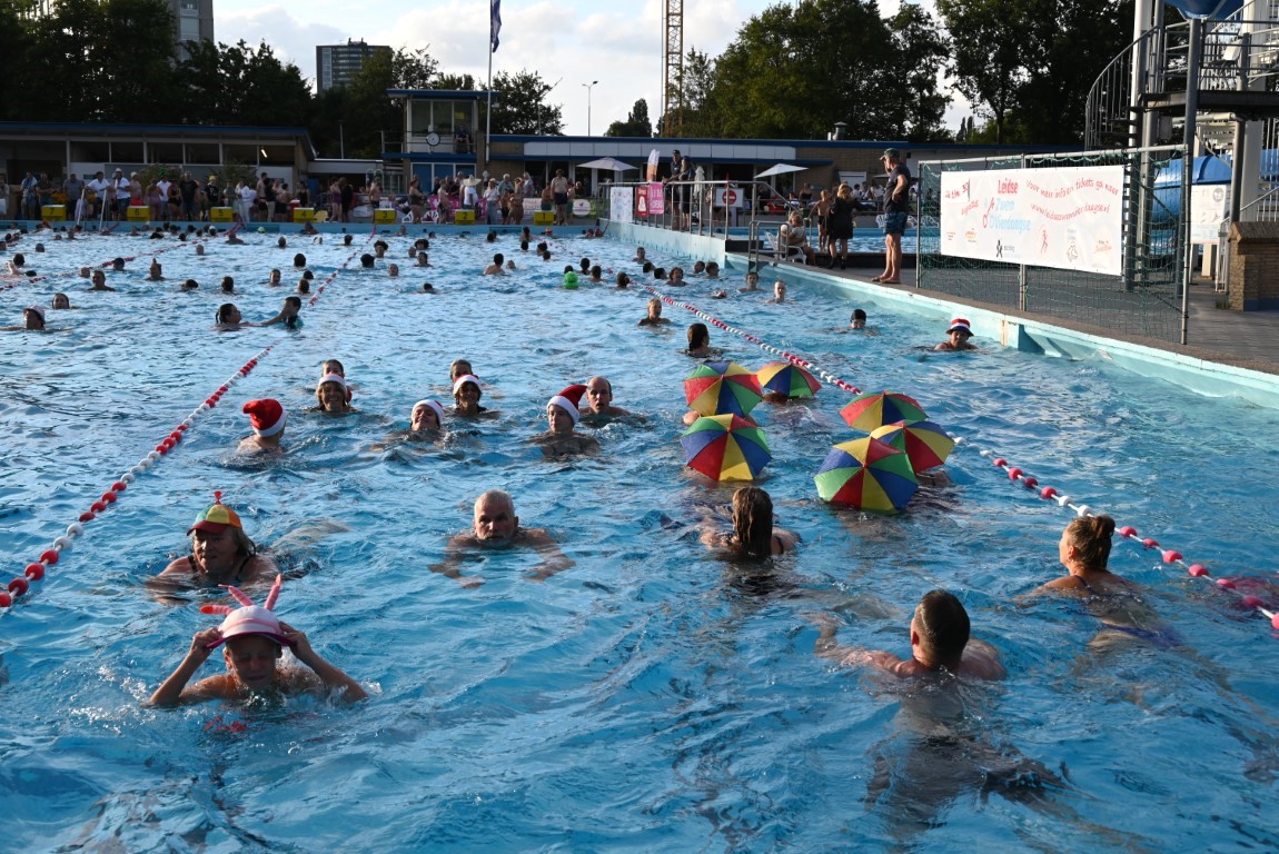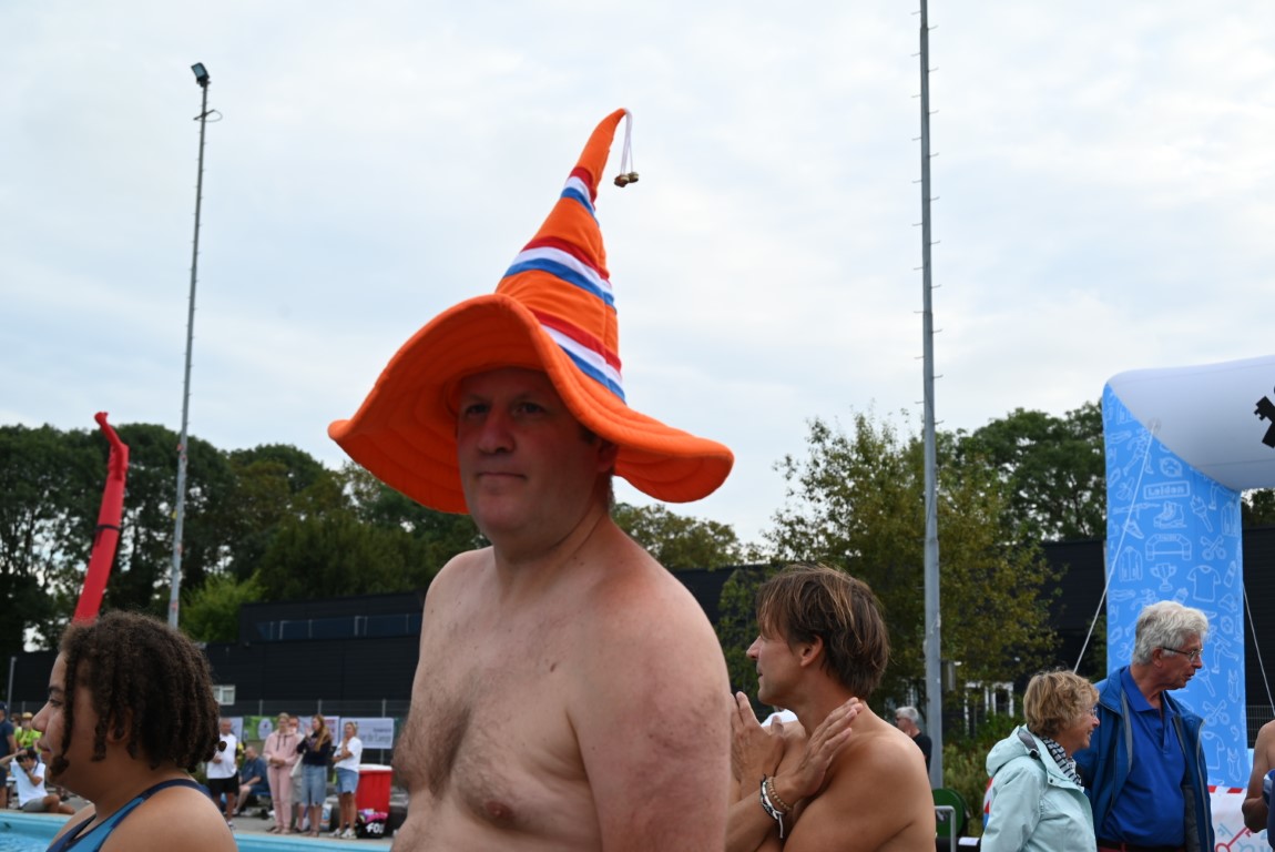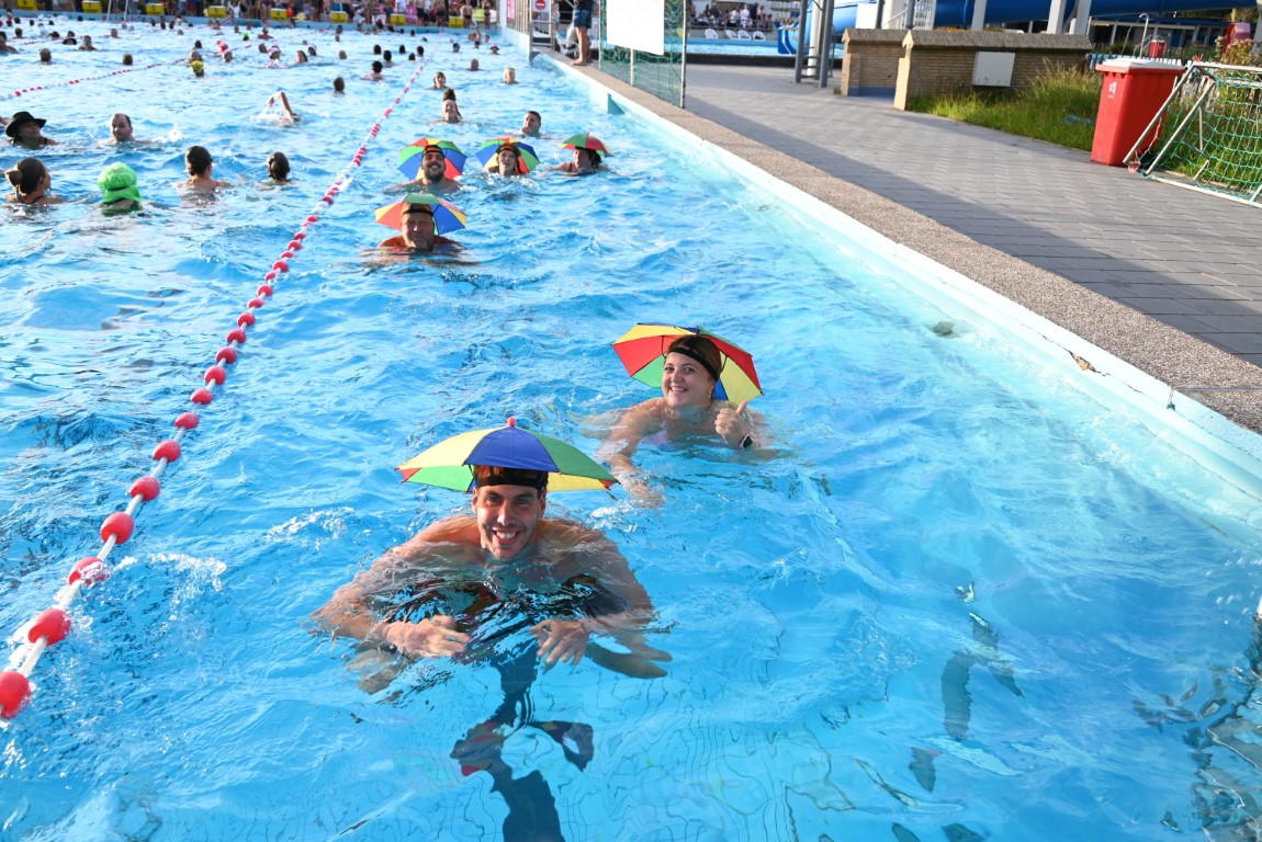 Het is vandaag alweer de laatste dag van een week lang Leidse Zwemvierdaagse in buitenbad De Vliet. De donderdag staat al jaren bekend als ‘badmutsendag’ en dus gingen gisteravond veel deelnemers met een bijzonder hoofddeksel te water. “Uw verslaggever telde slechts één echte badmuts en dat was er dan ook nog eentje met bloemetjes”, lacht Emile van Aelst die deze week voor Sleutelstad een paar keer langs ging.