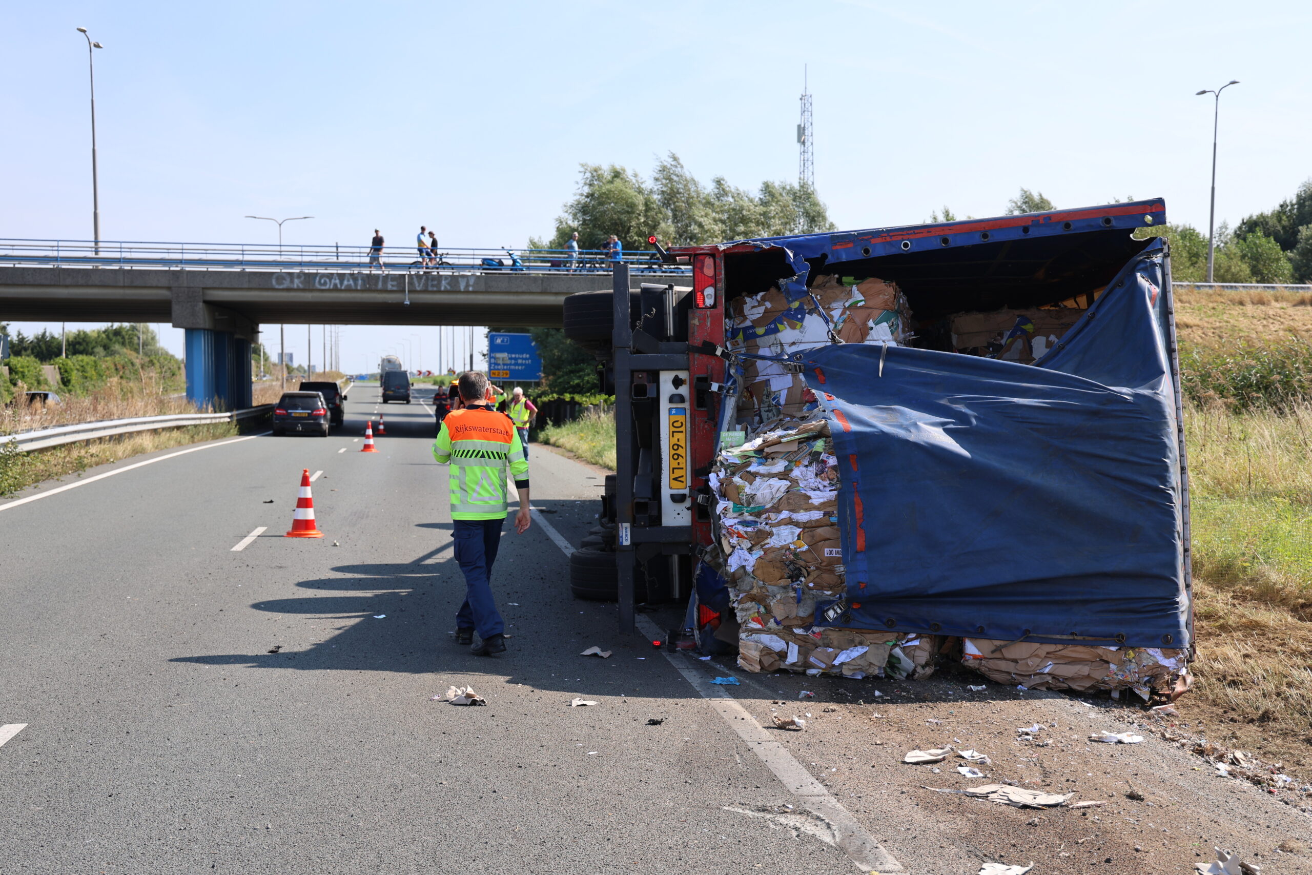 Een vrachtwagen is maandag aan het begin van de middag op de N11 bij Hazerswoude-Dorp op zijn kant terecht gekomen. De rijbaan richting Bodegraven is dicht, verkeer moet omrijden via de A4 en A12. Het ongeval zorgt maandagmiddag voor een lange file.