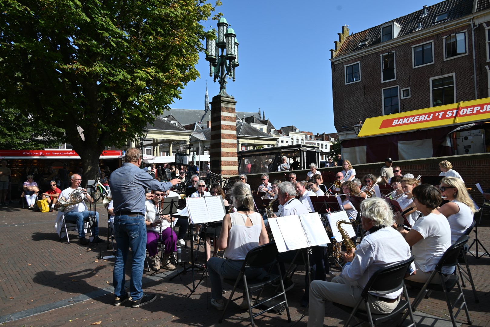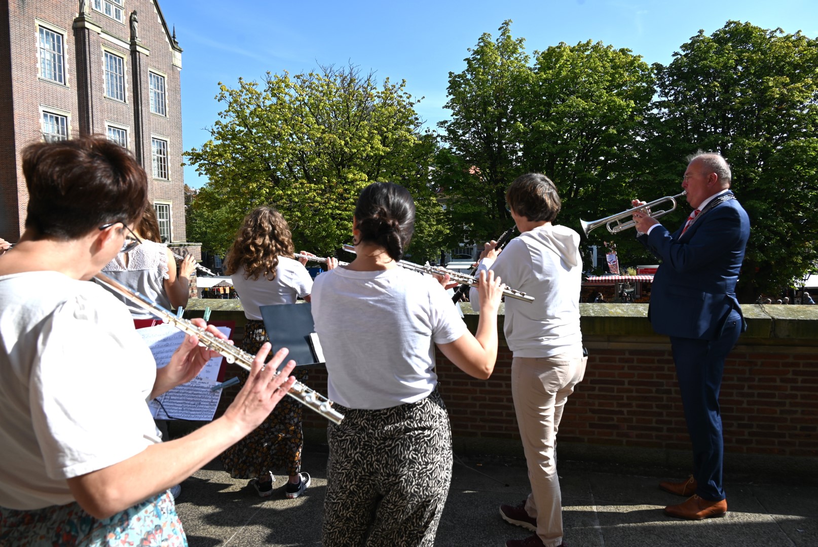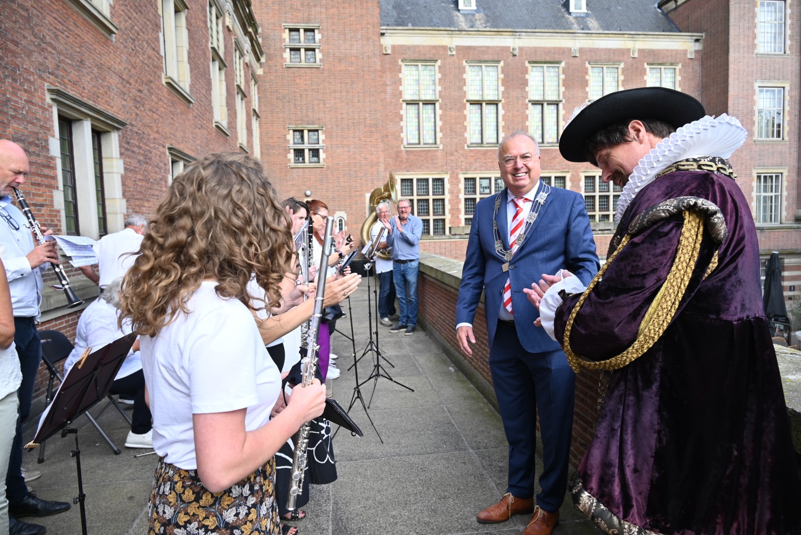 Marktbezoekers keken raar op toen zaterdagmorgen op het bordes van het Stadhuis een harmonie speelde in aanwezigheid van burgemeesters Pieter van der Werf en Peter van der Velden.