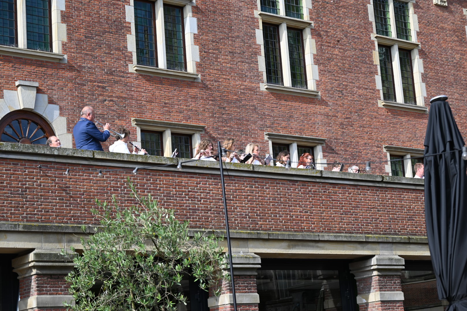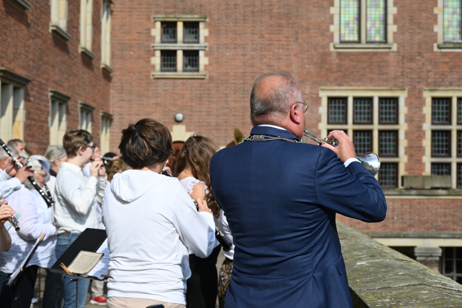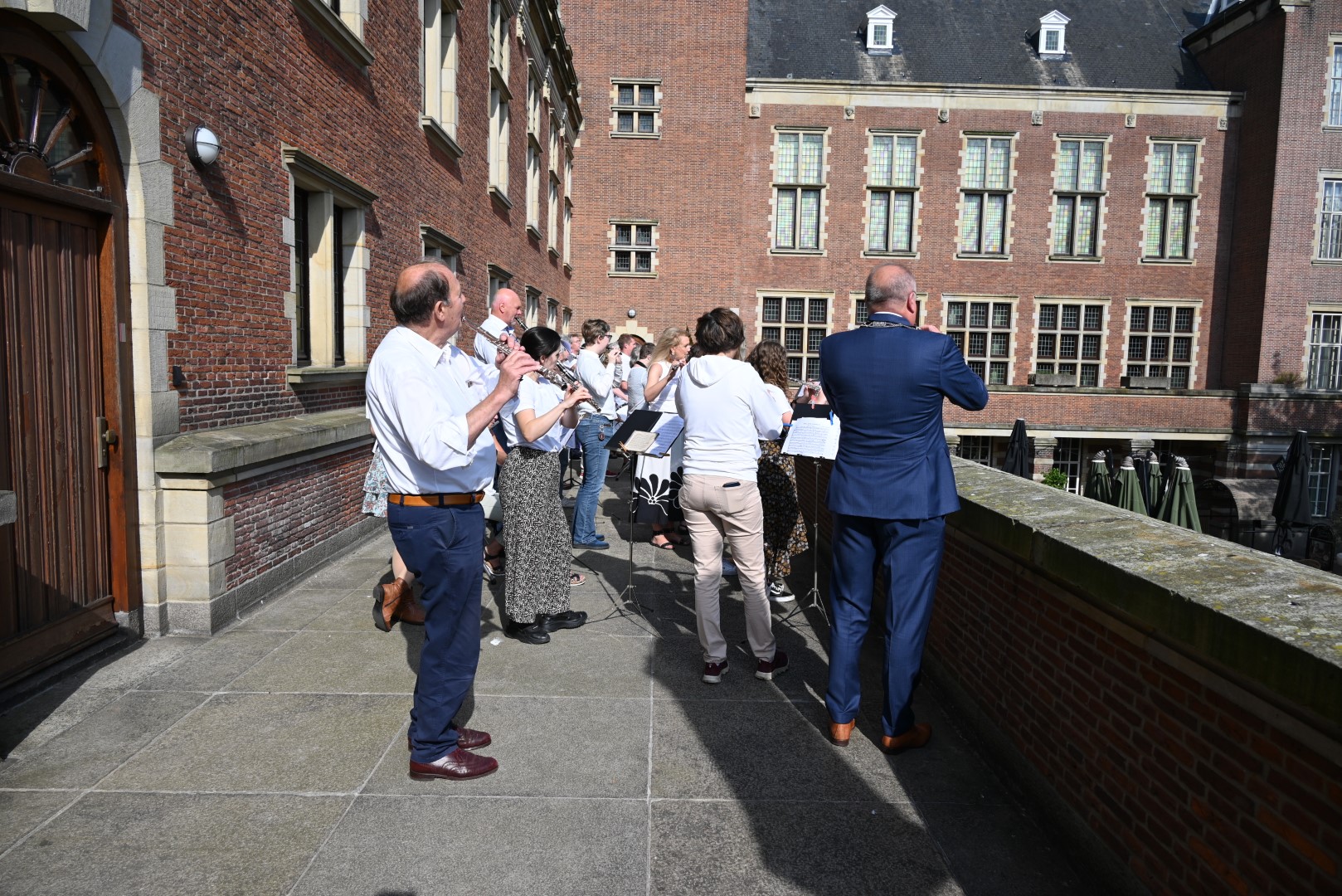 Na een rondleiding door het Stadhuis nam het orkest plaats op het bordes om een paar nummers te spelen. Toevallig kwam ook net burgemeester Pieter van der Werf langs en wilde weten wat er gaande was. Voor Van der Werf was het een vreemde gewaarwording dat de huidige burgemeester ook trompet speelde in een harmonie.