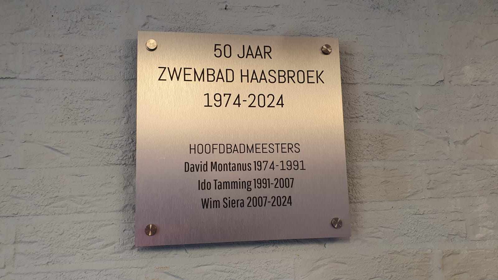 De plaquette voor een halve eeuw zwembad Haasbroek werd woensdagmiddag onthuld. De laatste naam op het bordje is die van hoofdbadmeester Wim Siera die dit seizoen met pensioen is gegaan.