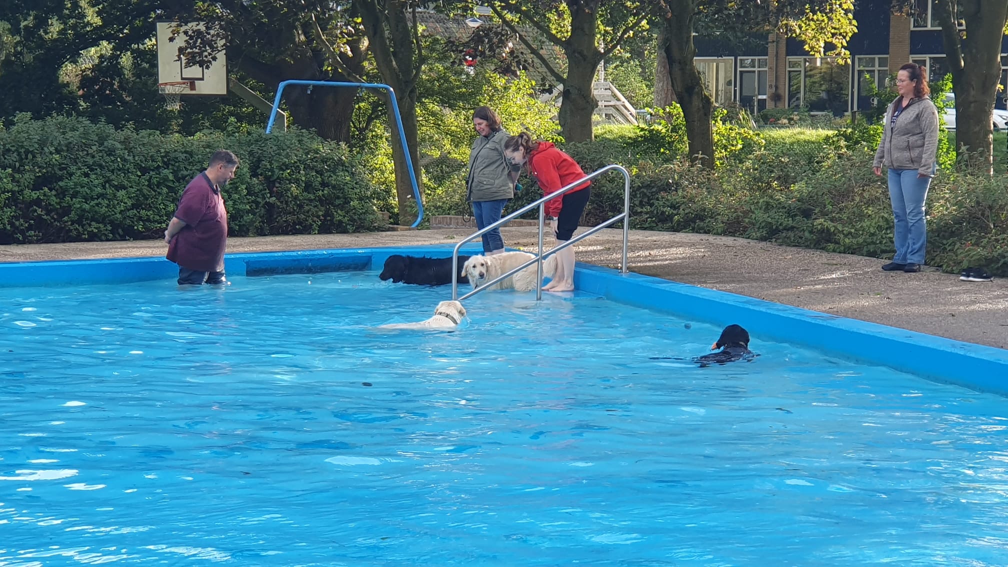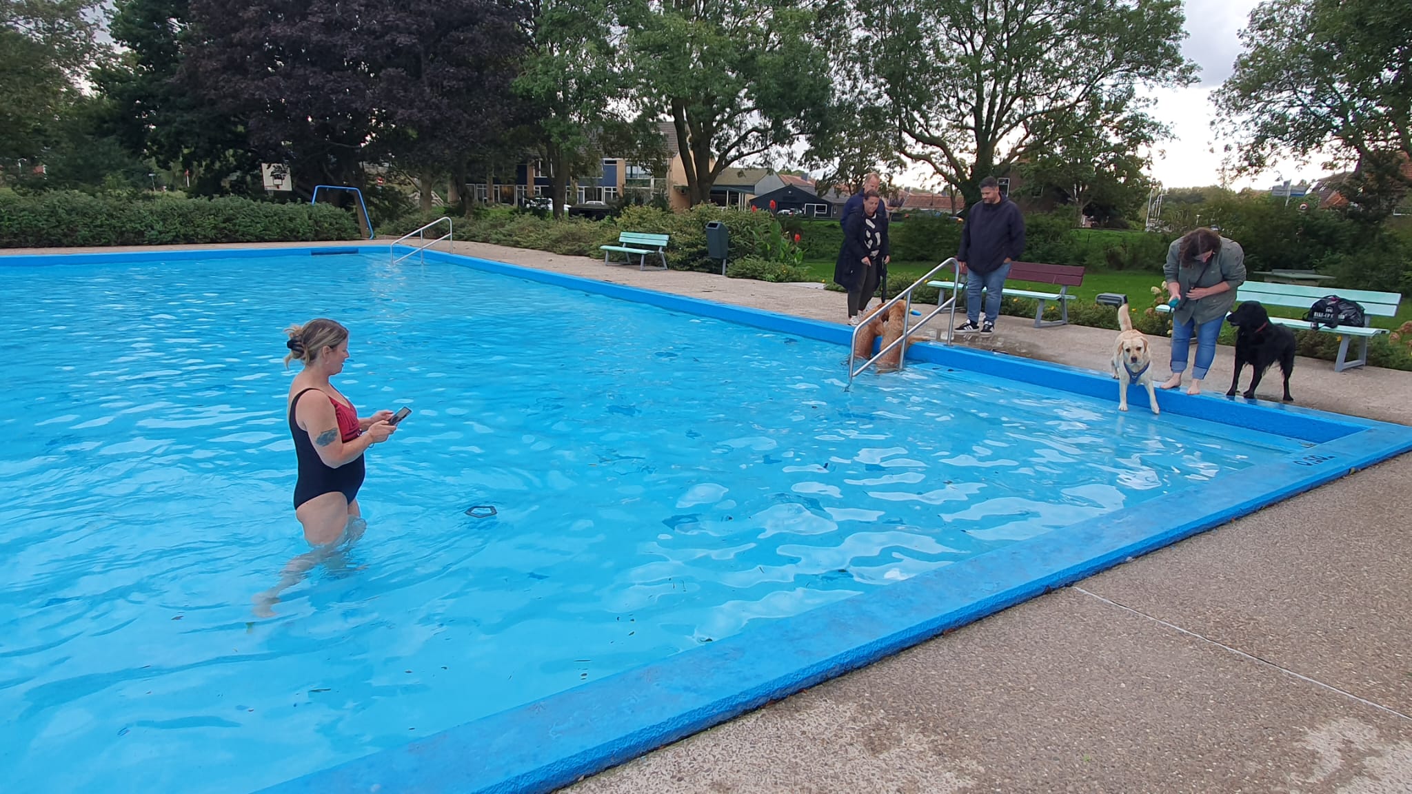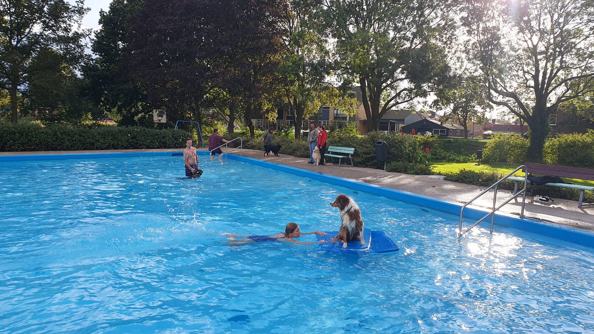 Het is zo langzamerhand een traditie geworden in zwembad Haasbroek in Zoeterwoude. Op de laatste dag dat het buitenbad is geopend, mogen baasjes er met hun hond komen zwemmen. Even dreigde het gisteren niet door te gaan vanwege de slechte weersvoorspellingen, maar het klaarde net op tijd op.