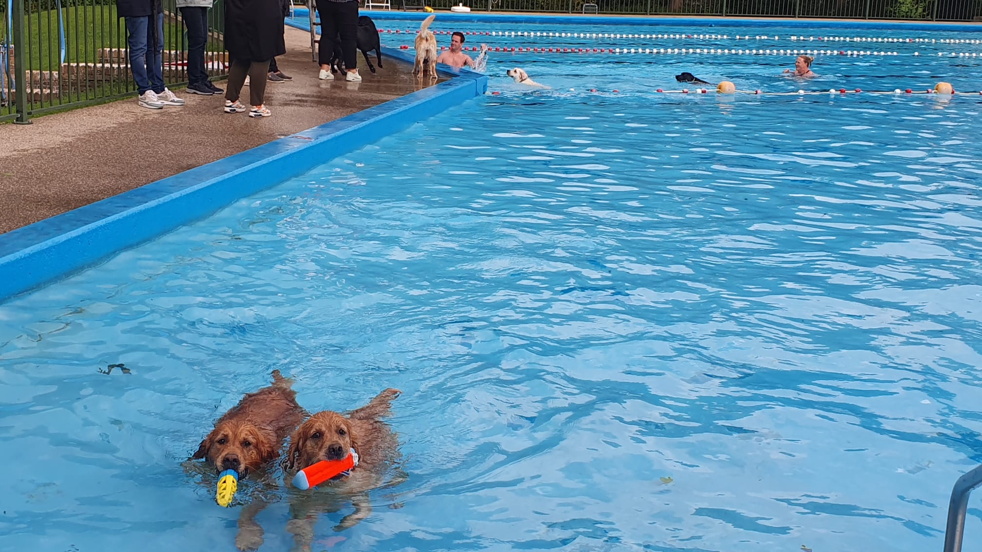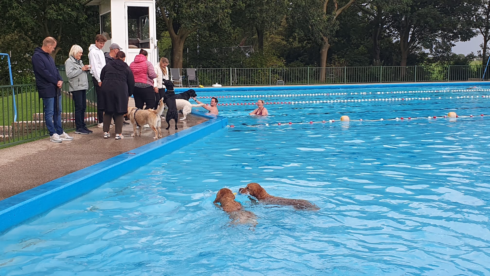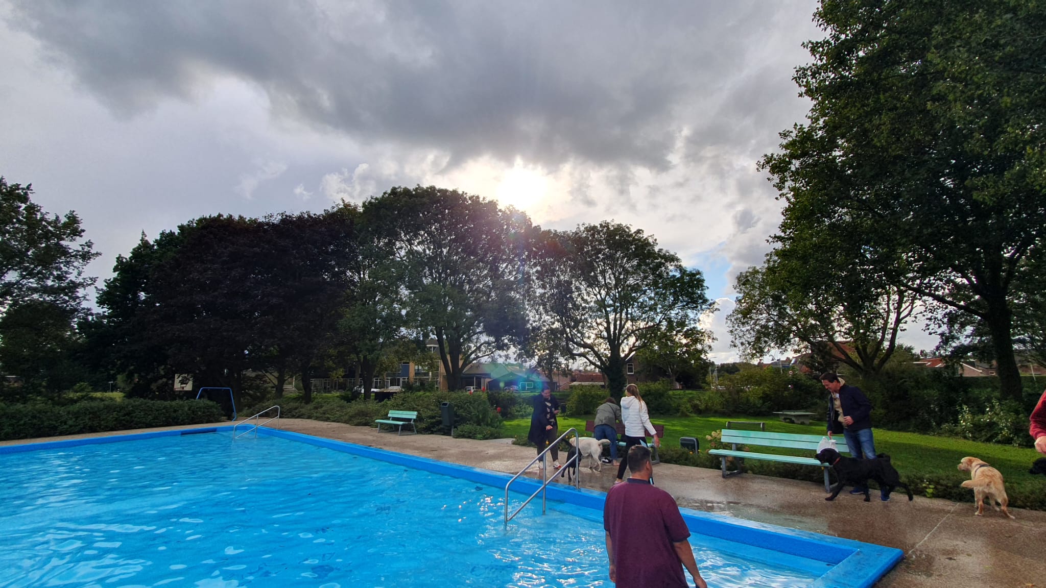 Het is zo langzamerhand een traditie geworden in zwembad Haasbroek in Zoeterwoude. Op de laatste dag dat het buitenbad is geopend, mogen baasjes er met hun hond komen zwemmen. Even dreigde het gisteren niet door te gaan vanwege de slechte weersvoorspellingen, maar het klaarde net op tijd op.