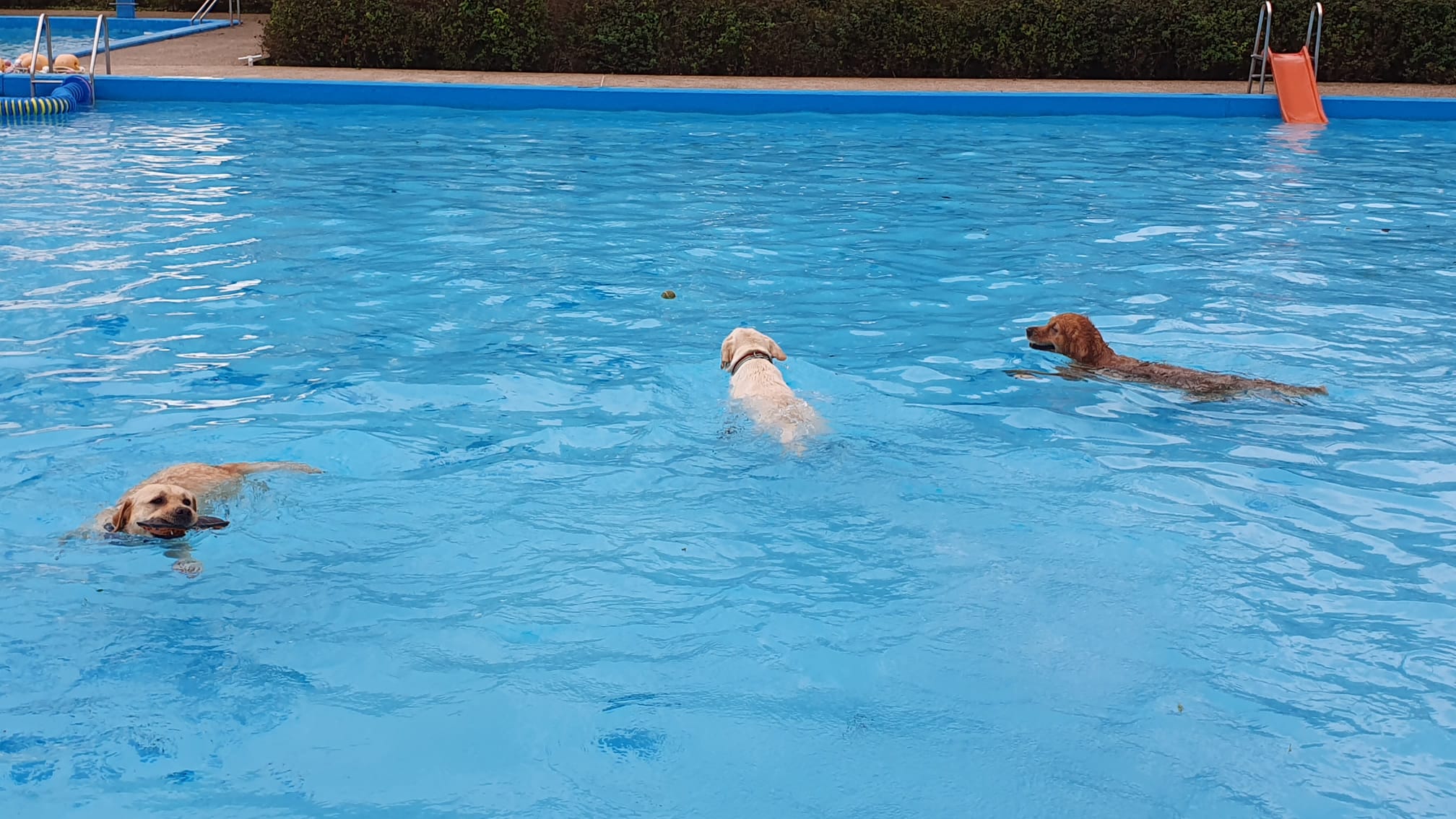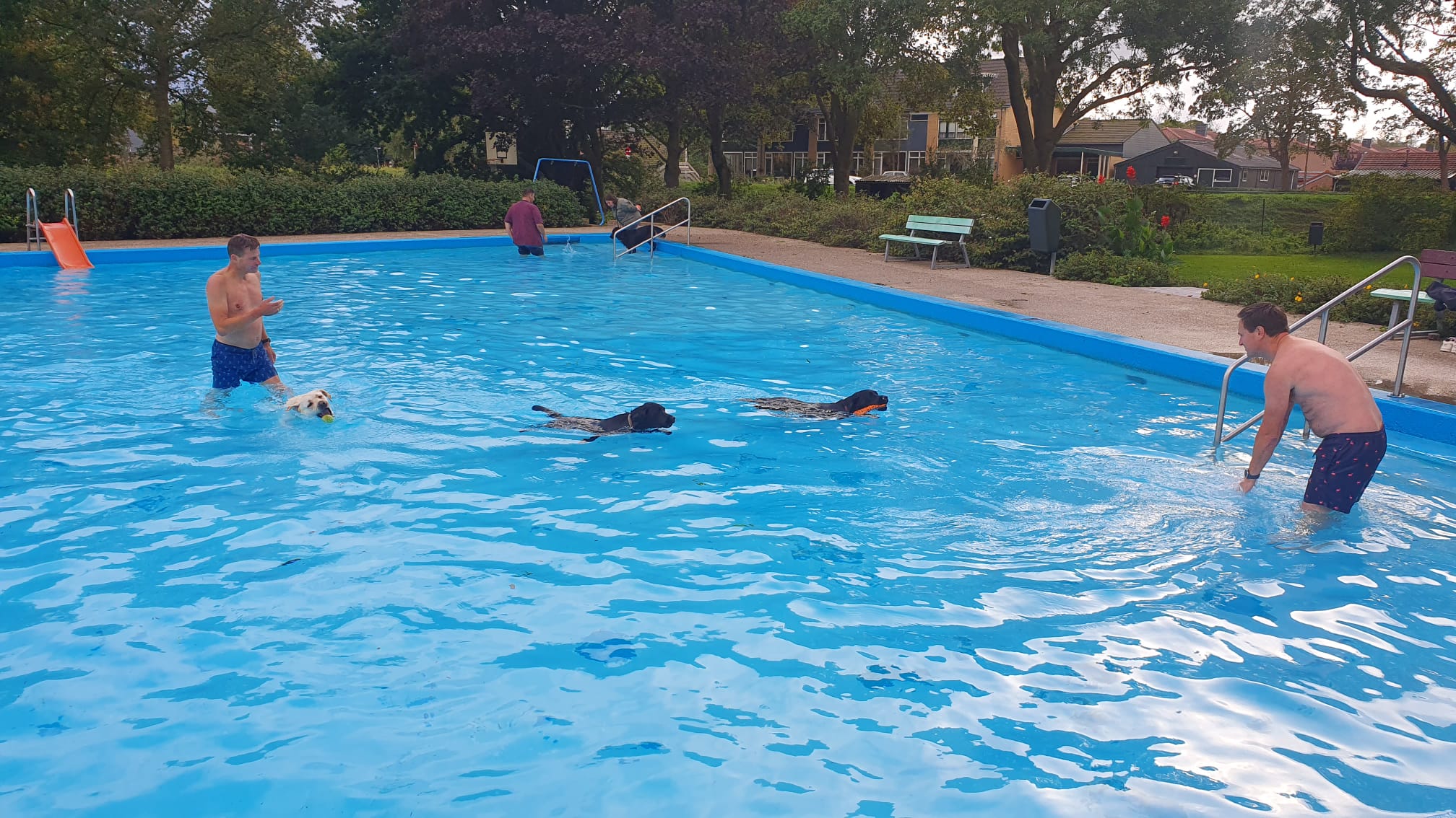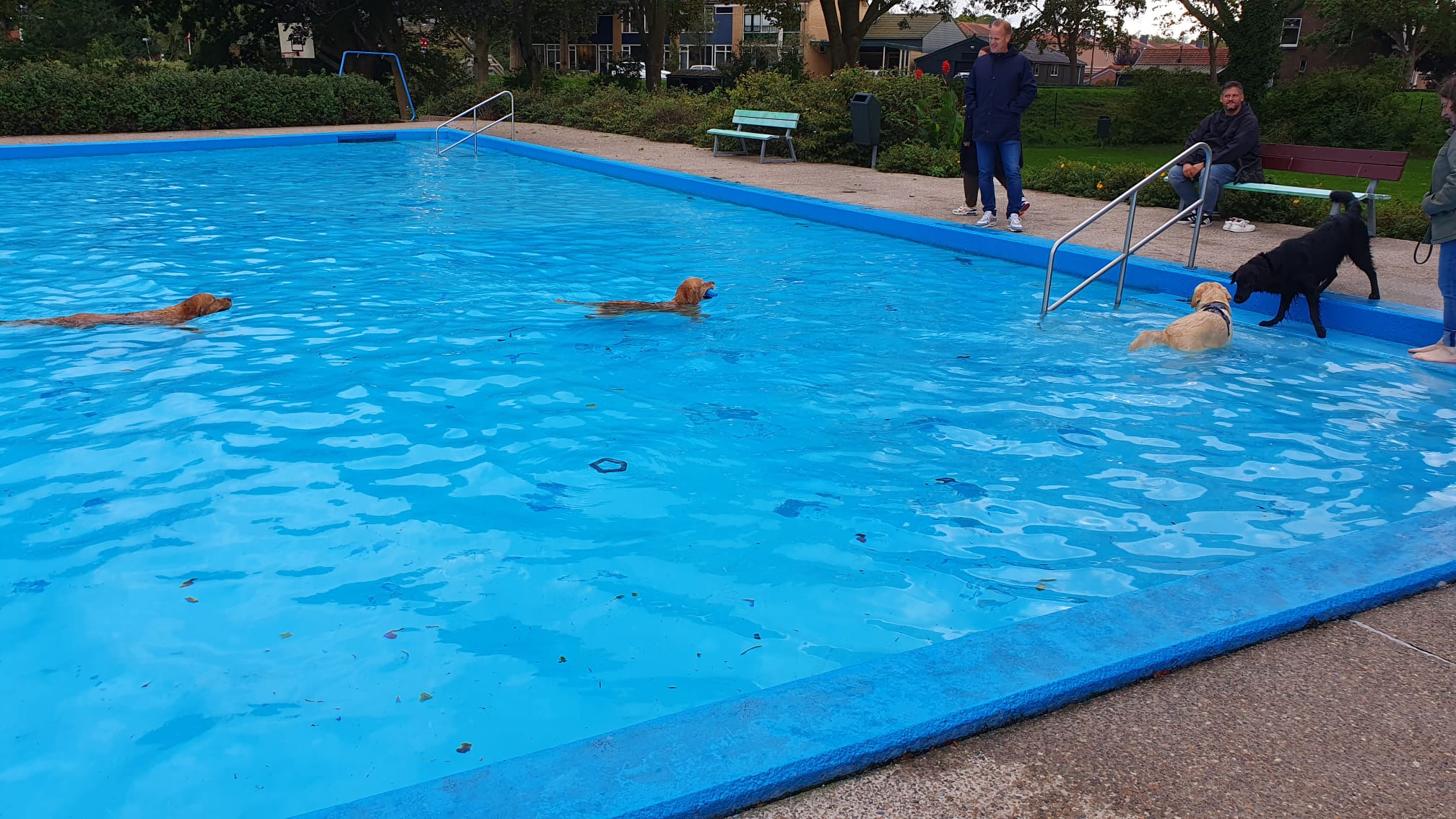 De leukste dag voor hondenbezitters is elk jaar de dag waarop het seizoen weer wordt afgesloten. Dan mogen de honden met hun baasjes mee het water in. Dit keer waren er twaalf honden die hun baasje zover hadden gekregen. De rest vond het weer waarschijnlijk net even te slecht. Er waren dan ook meer honden dan baasjes in het zwembad. Twee Labradors gingen als eerste het water in en na een minuut of tien volgden nog een stuk of tien honden.
