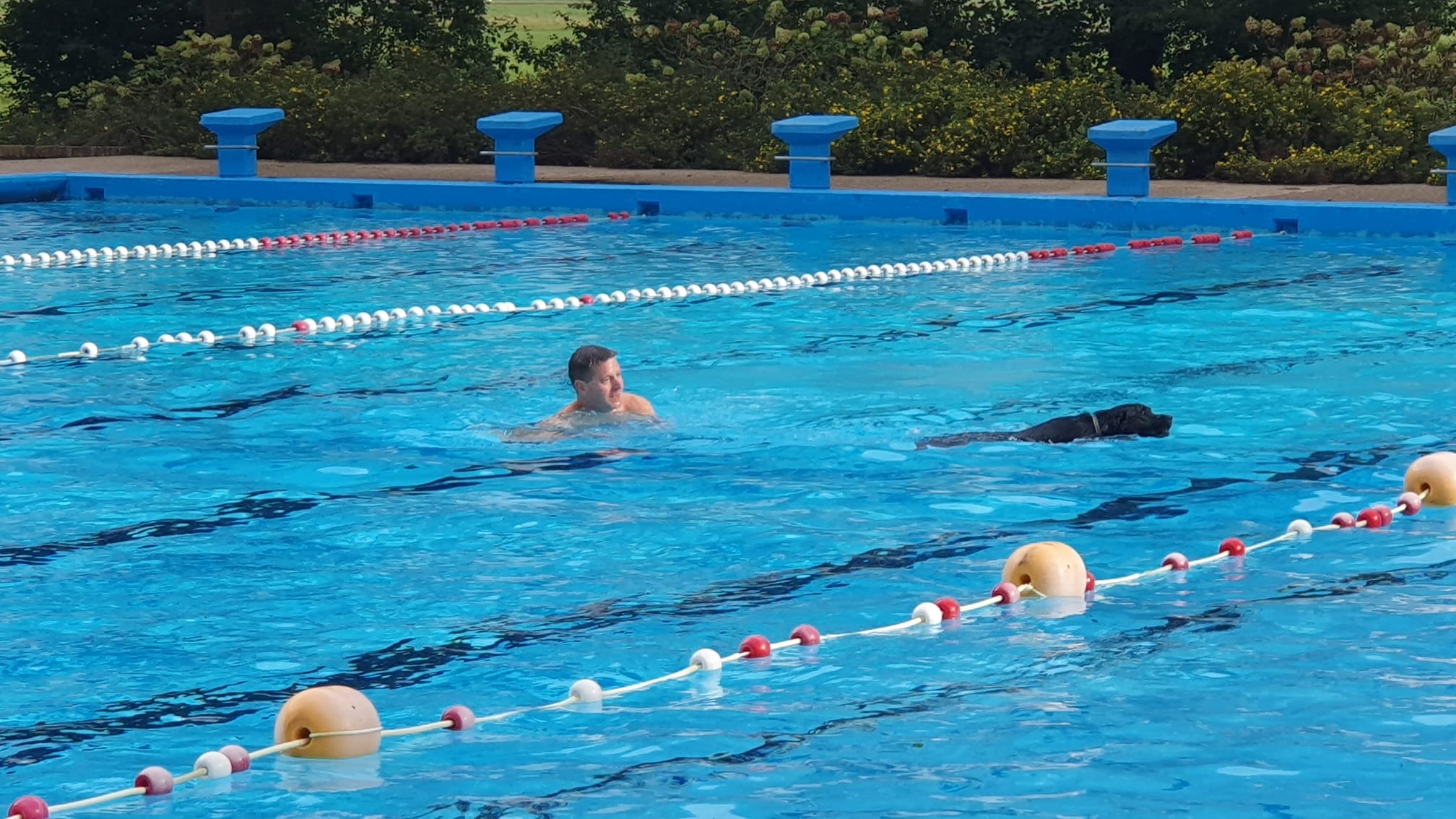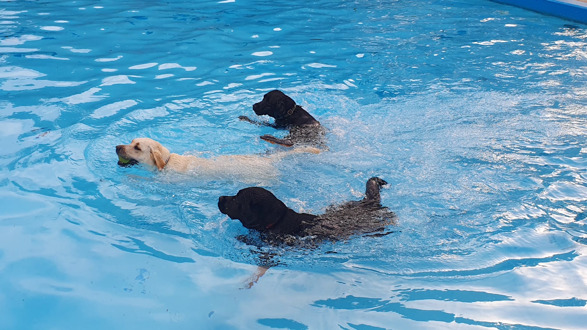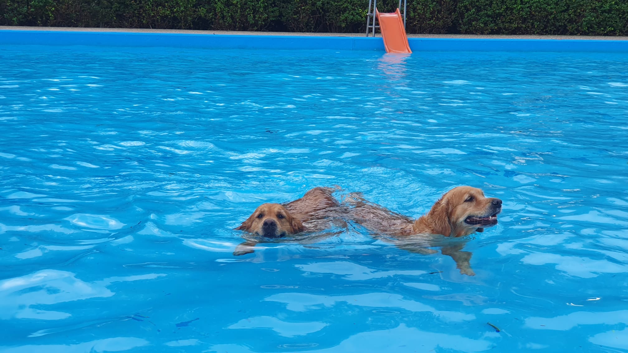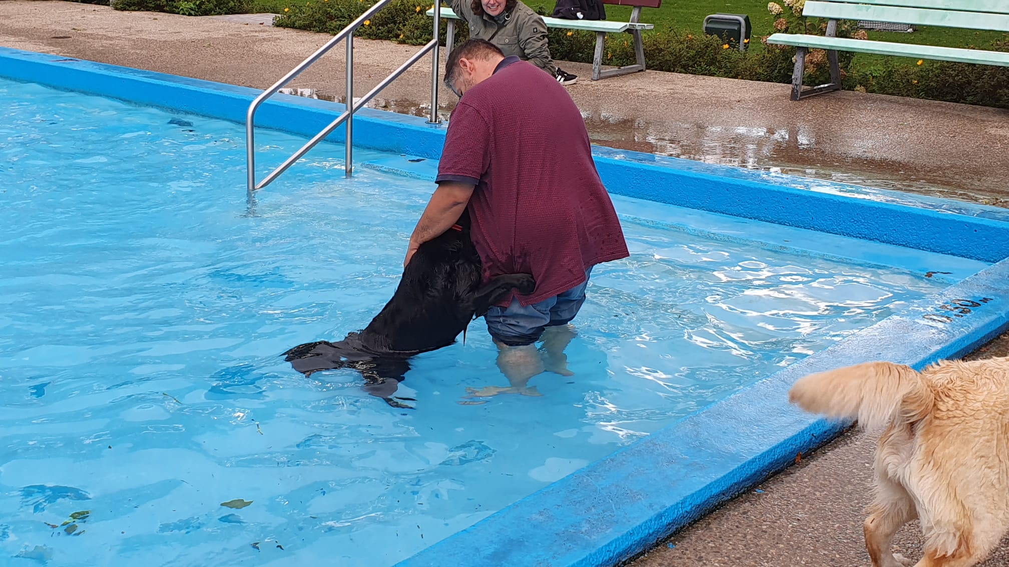 De leukste dag voor hondenbezitters is elk jaar de dag waarop het seizoen weer wordt afgesloten. Dan mogen de honden met hun baasjes mee het water in. Dit keer waren er twaalf honden die hun baasje zover hadden gekregen. De rest vond het weer waarschijnlijk net even te slecht. Er waren dan ook meer honden dan baasjes in het zwembad. Twee Labradors gingen als eerste het water in en na een minuut of tien volgden nog een stuk of tien honden.