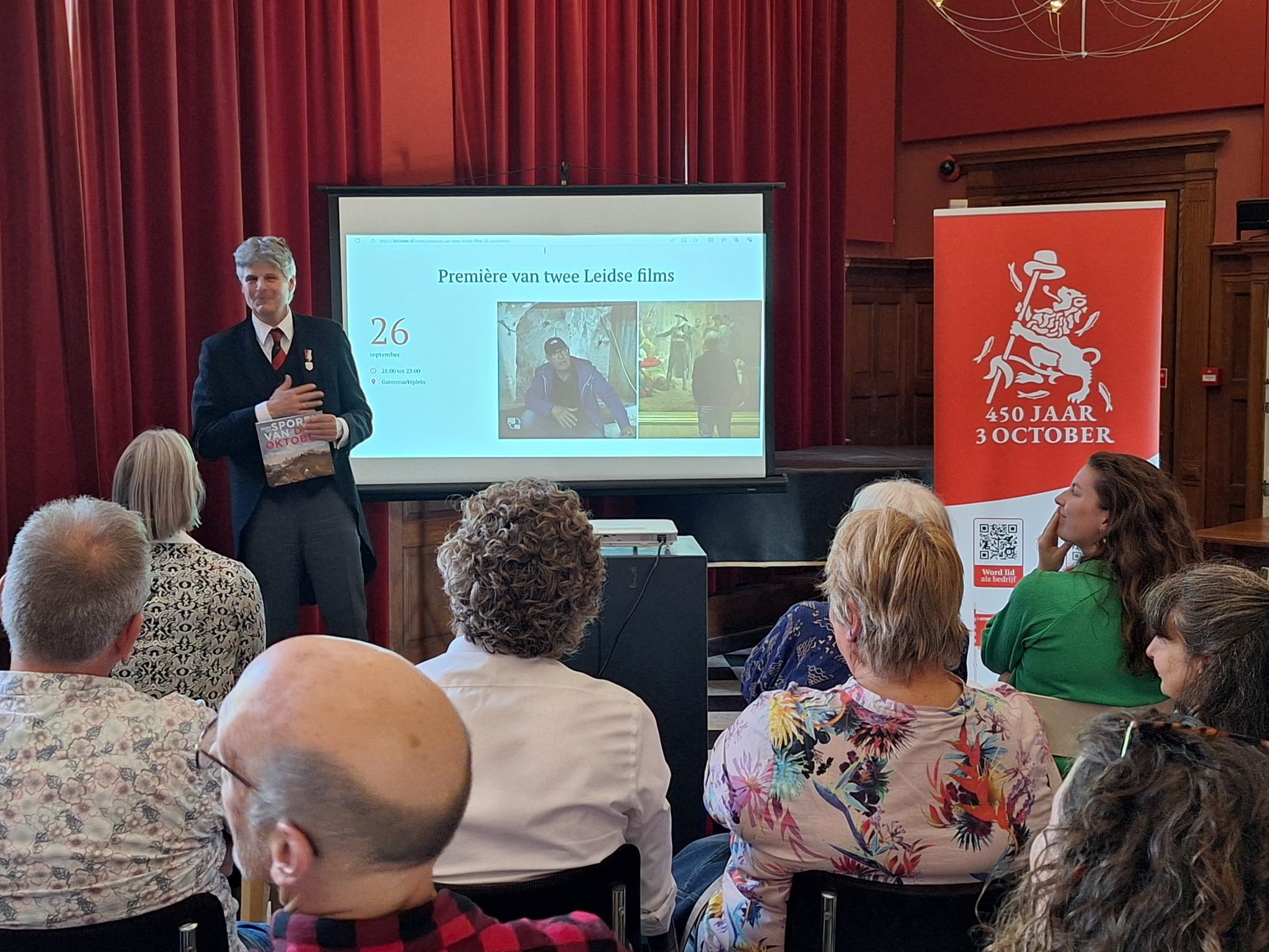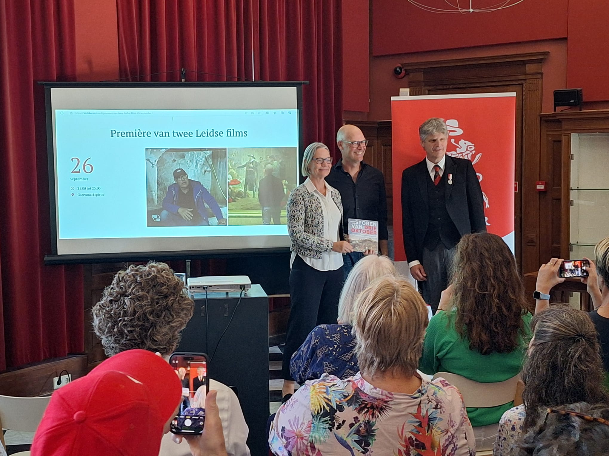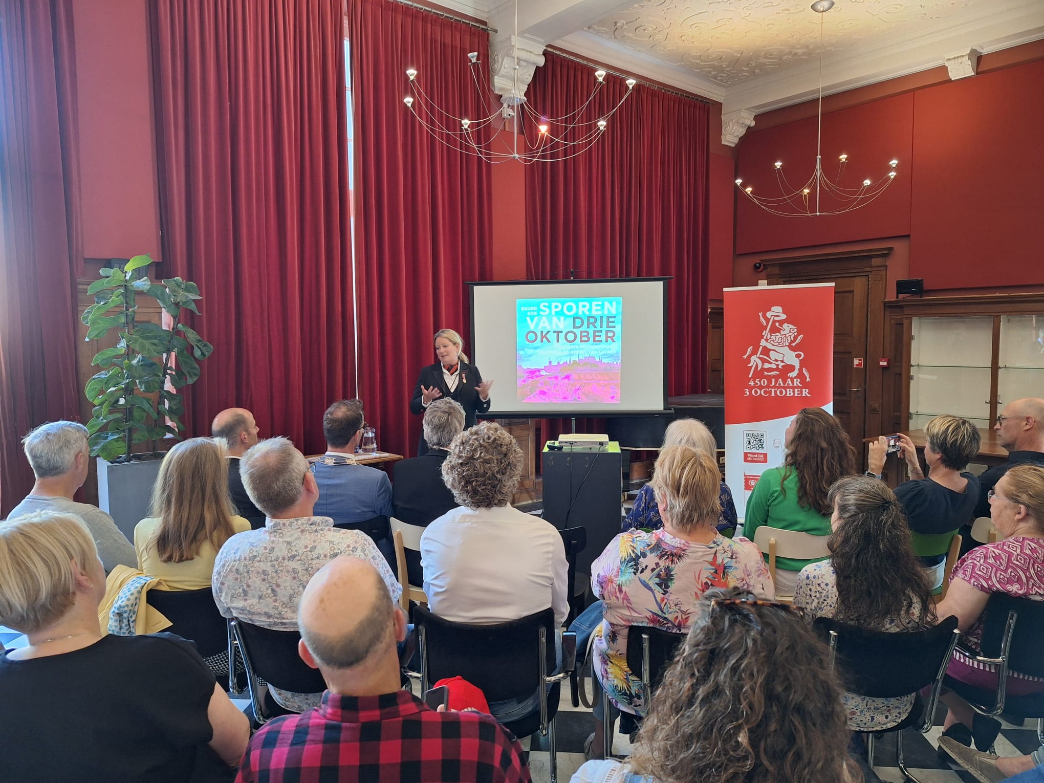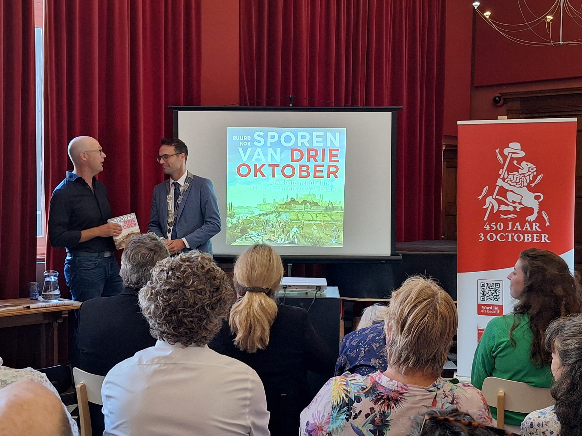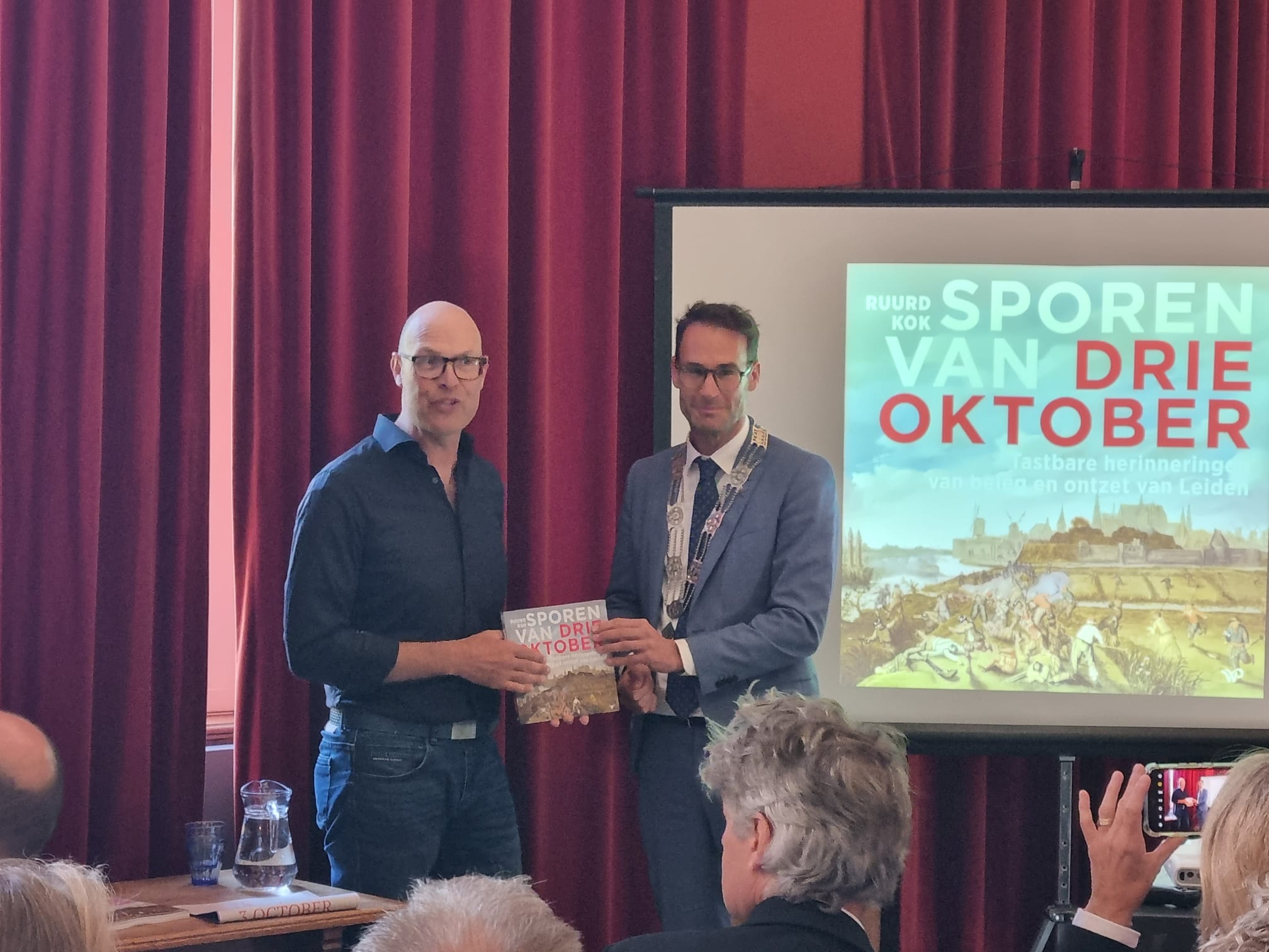 Als eerste officiële handeling nam de burgemeester vrijdagmiddag het boek ‘Sporen van 3 Oktober’ van archeoloog en journalist Ruurd Kok in ontvangst. Kok ging op zoek naar tastbare sporen en herkenbare plekken die 450 jaar later nog steeds aan het beleg en ontzet van Leiden herinneren. (Foto’s: Reanne van Kleef)