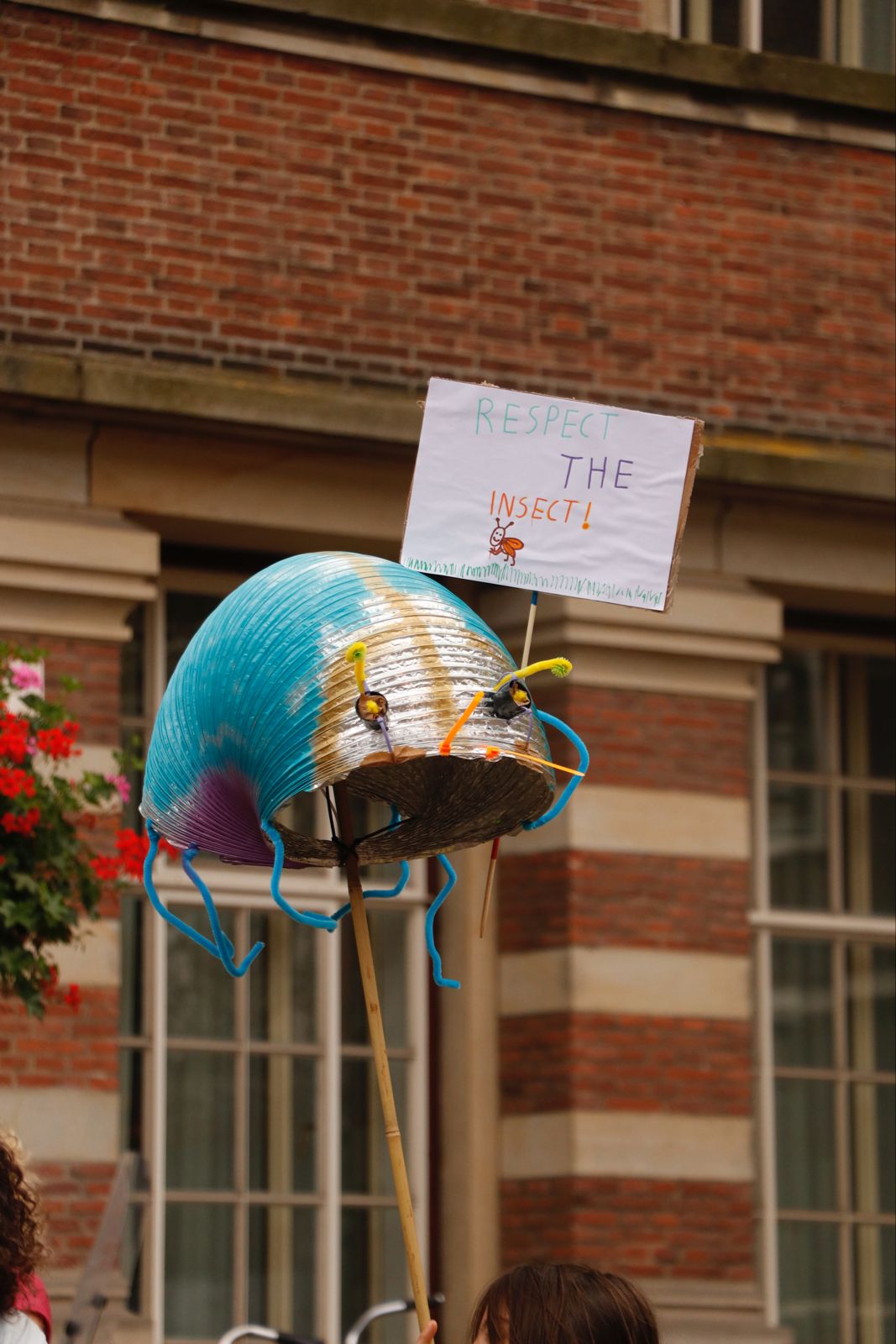 Een aantal van de leuzen was bijvoorbeeld: “Wij staan sterk als een berg. Demonstreren is niet erg”, “Kinderen hebben rechten. Daar willen we voor vechten”, “Wie verdient er respect? Het insect”, “Ik ben zo sterk als een mier. Daarom drink ik geen bier”, “Geen afval in het water”, “Geen afval op de grond” en “Kinderen tegen armoede”. Een klein jochie wilde door de megafoon vooral ‘Jij bent lief’ roepen. Tudor: “Toen we dat gingen herhalen met de demonstratie werd dat een heel mooi moment.”