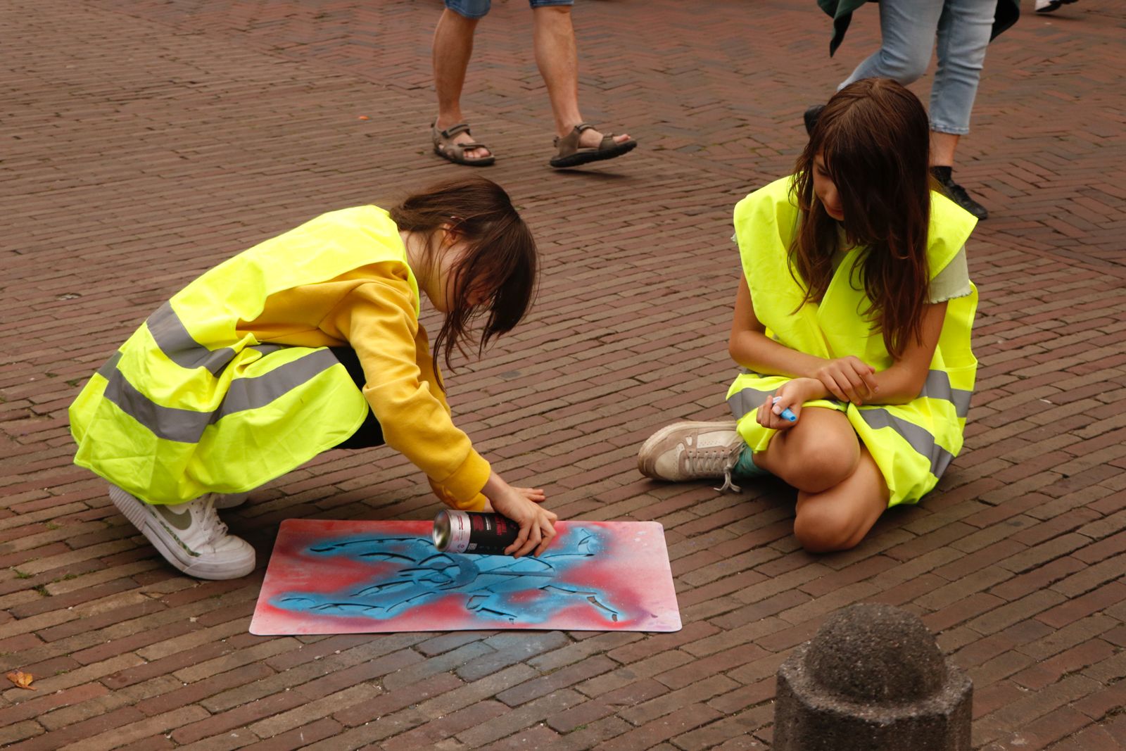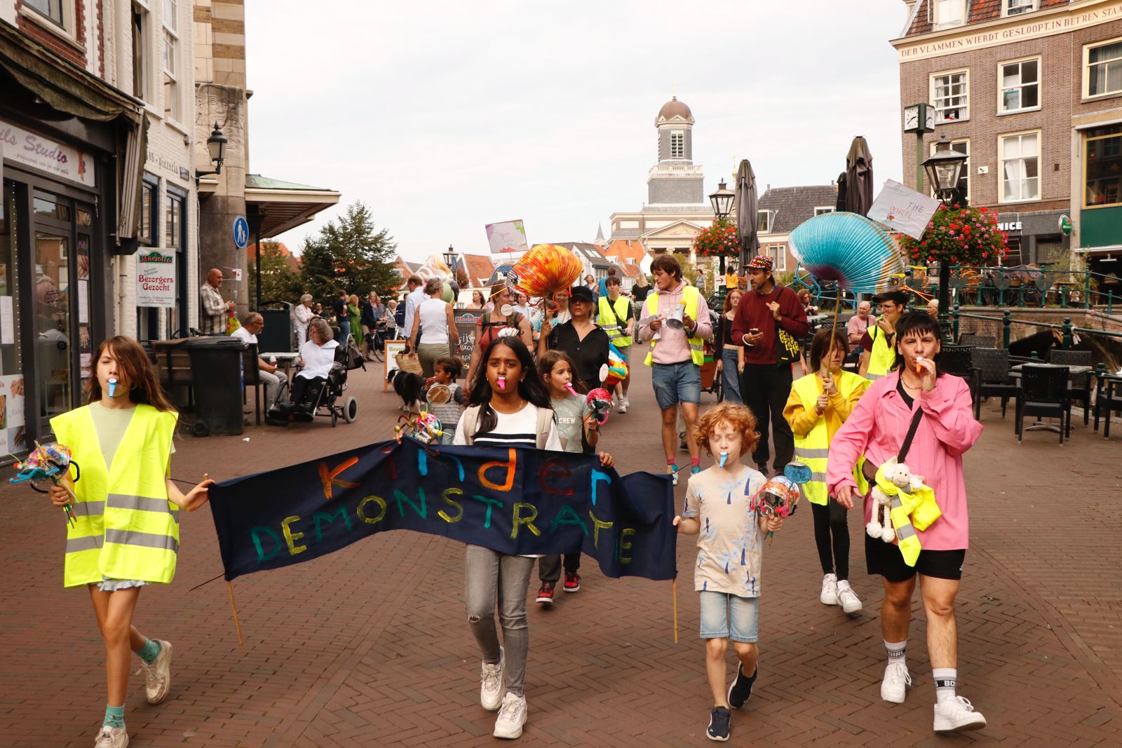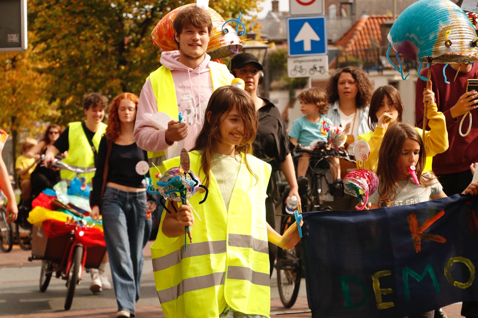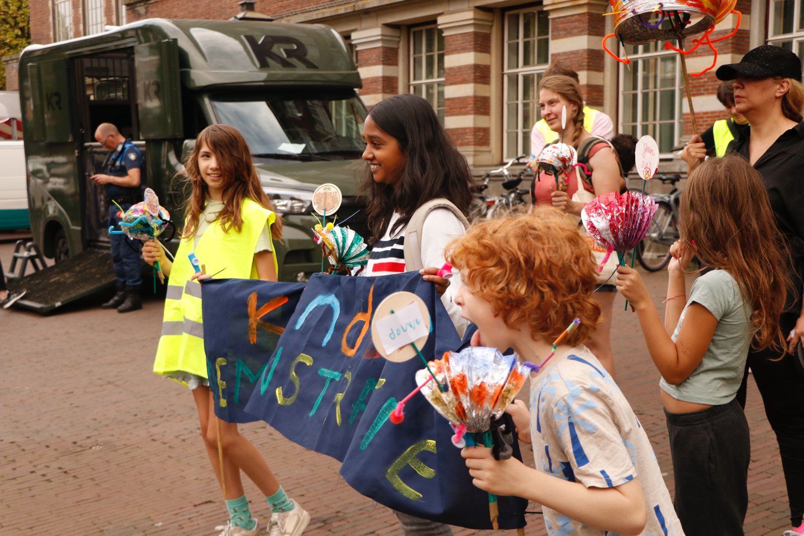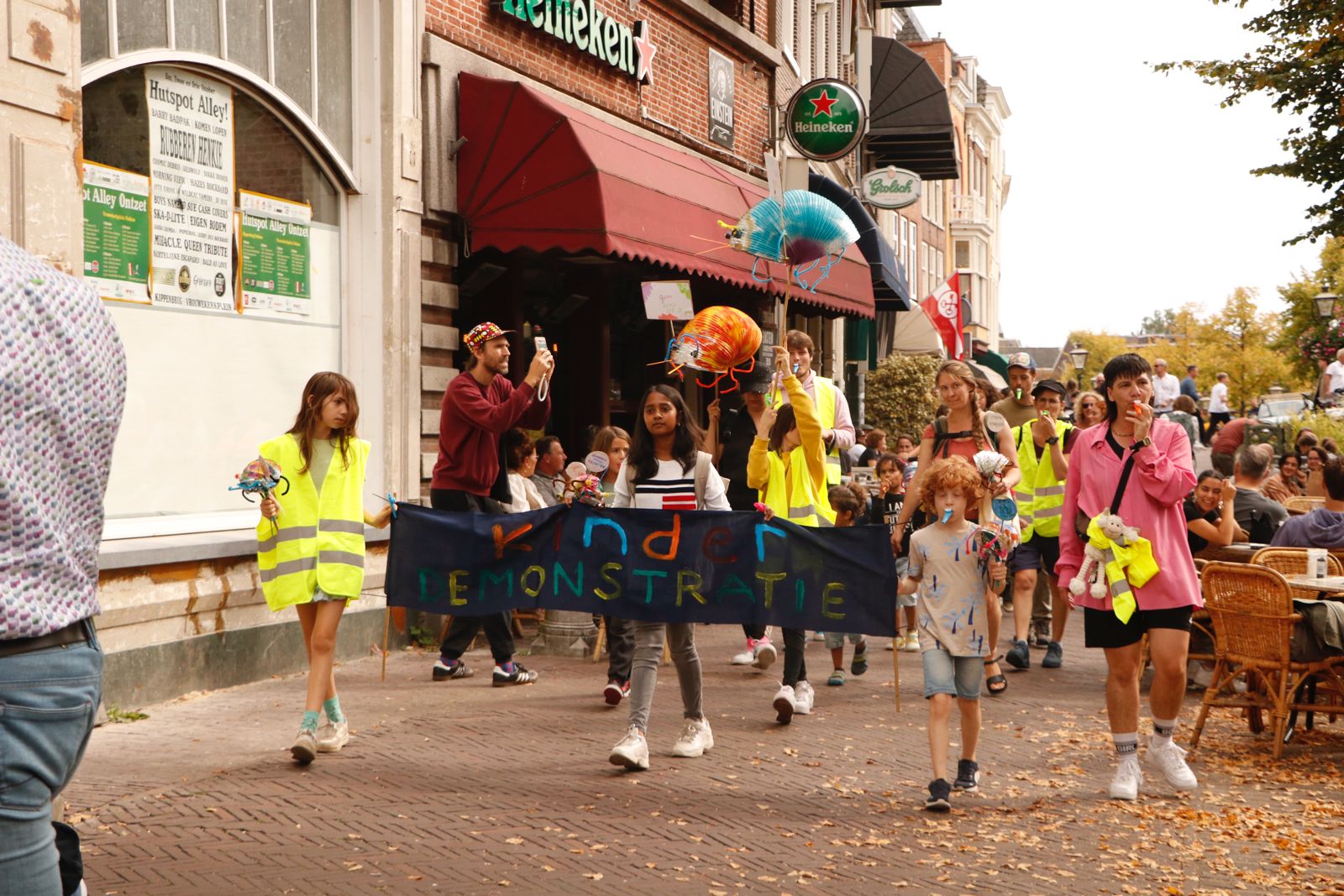 Tijdens de Kinderkunstroute hebben kinderen zondag een demonstratie gehouden in het centrum van Leiden. Ze begonnen bij Theater de Generator in de Vrijplaats Leiden met het maken van creatief protestmateriaal. Daarbij werden ze geholpen door beeldend kunstenaar en activist Sjors Knol.