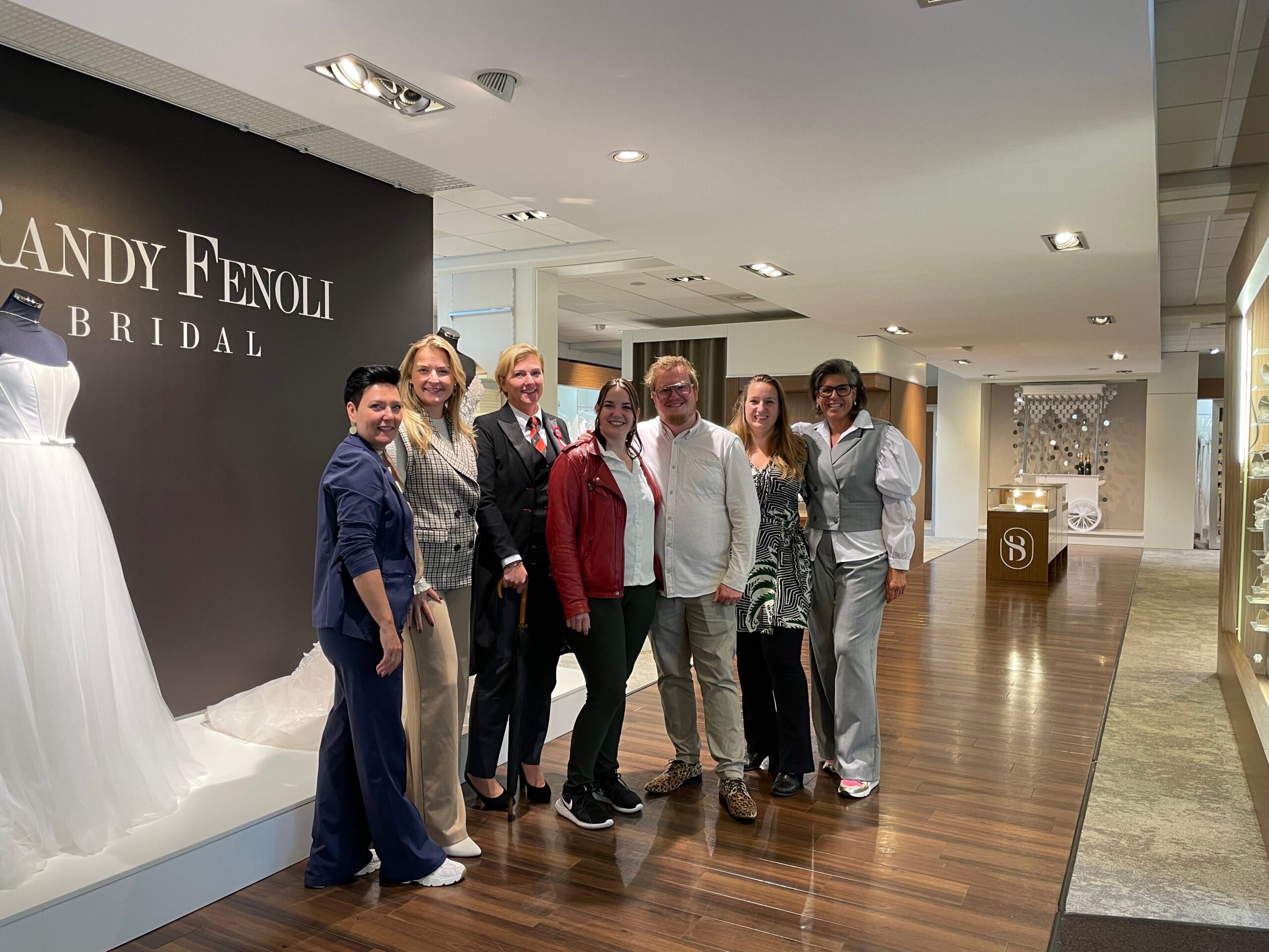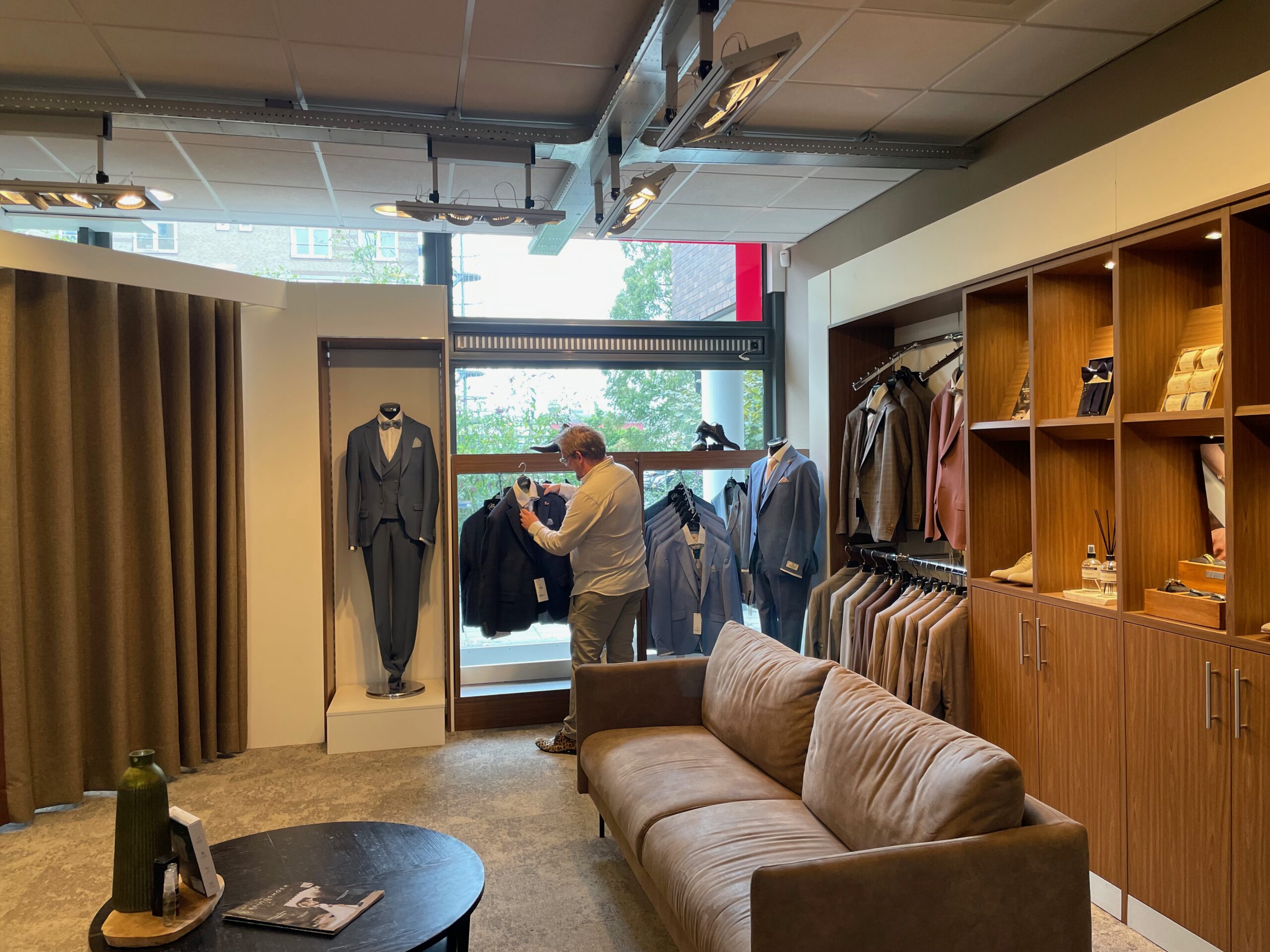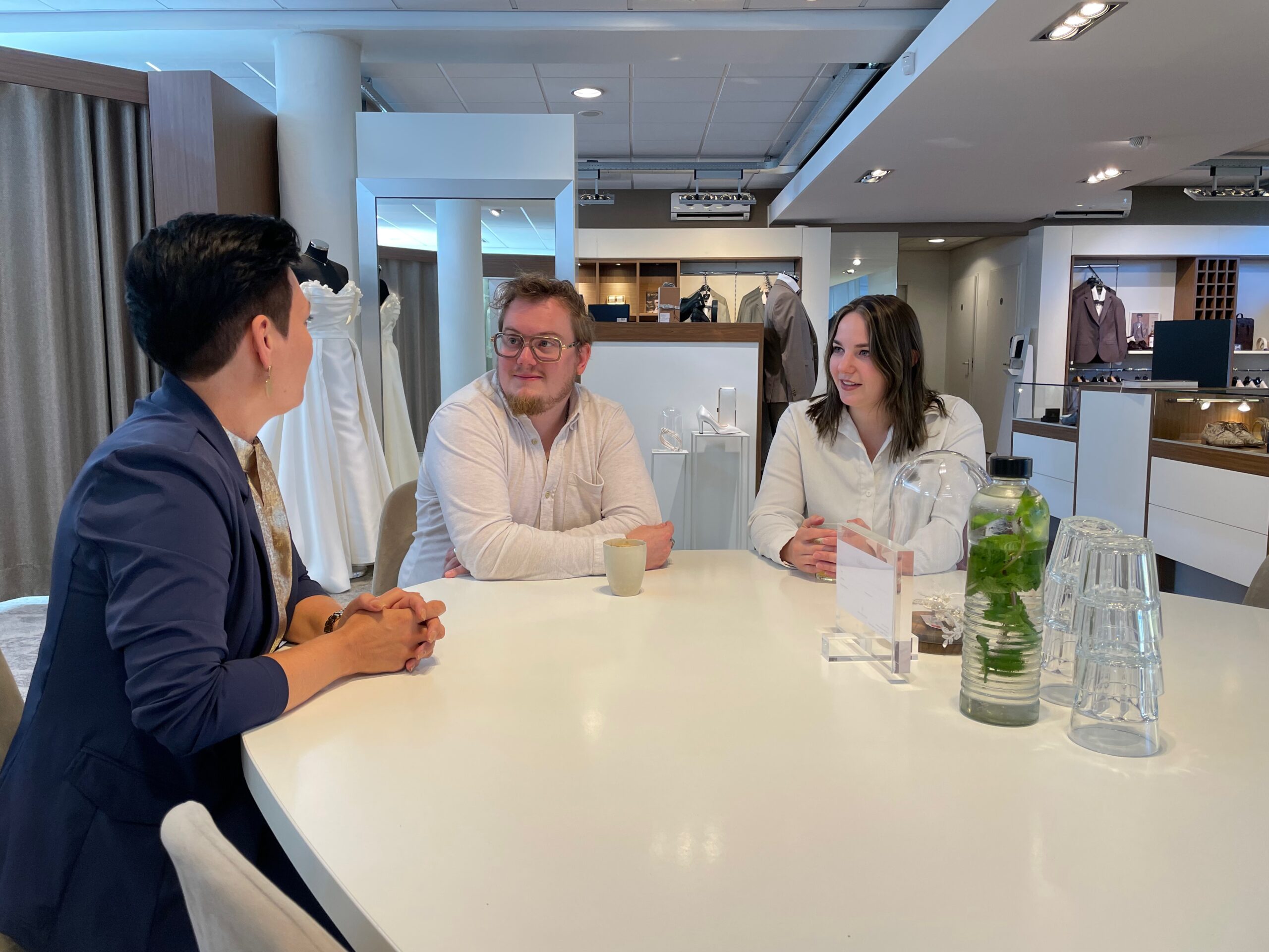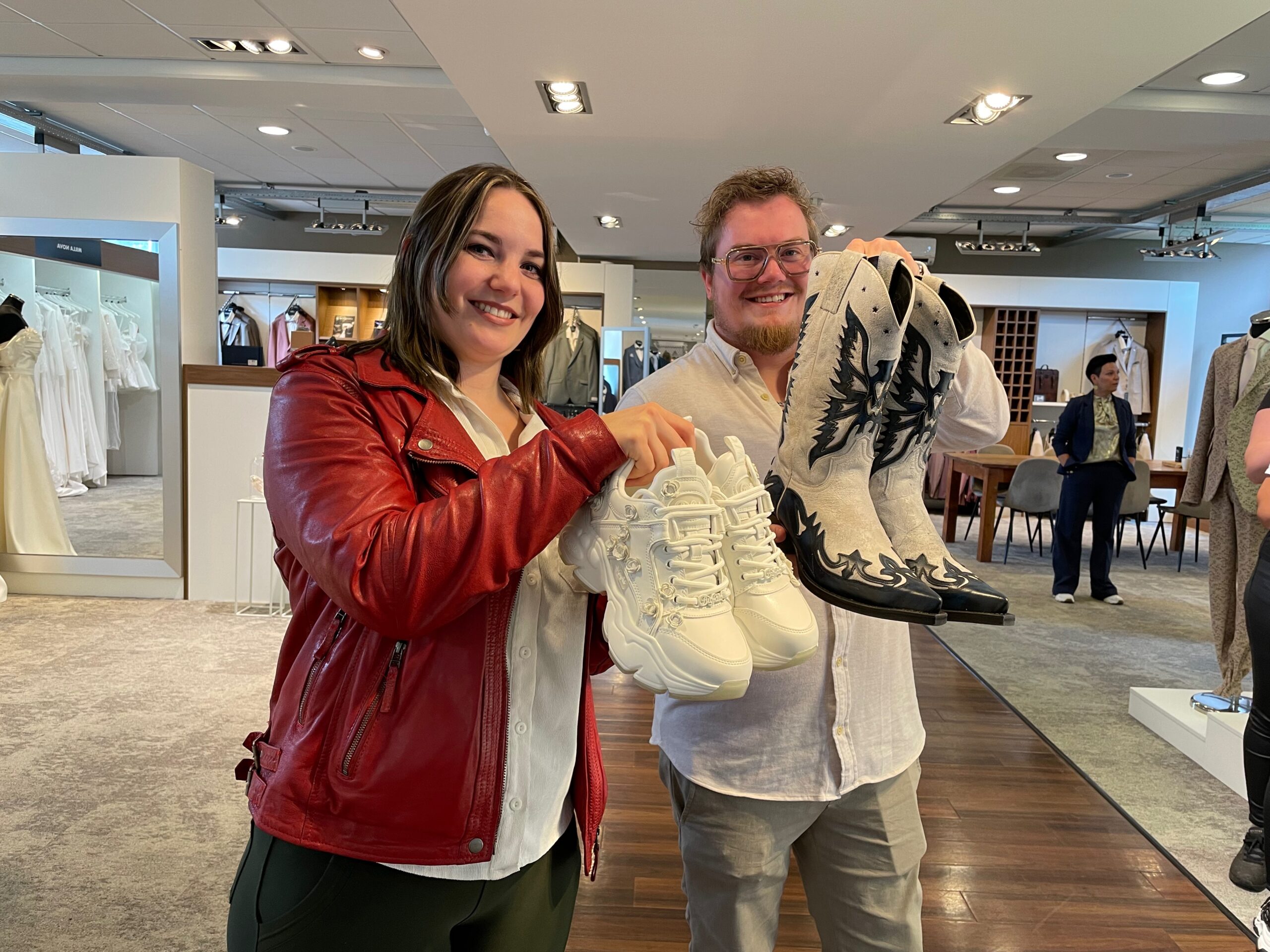 Een week voor de bruiloft komen Stapper en Van der Reek samen naar bruidswinkel Bruidshoek voor een laatste pasmoment van hun pak en jurk. Dat vergt nog wat organisatie, want het tweetal wil elkaars outfit vooraf niet zien. “Er is al zoveel tot in detail georganiseerd, het is leuk dat er ook nog een verrassing is”, zegt Stapper. “Het enige dat we hebben gezien zijn onze schoenen”, zegt Van der Reek.