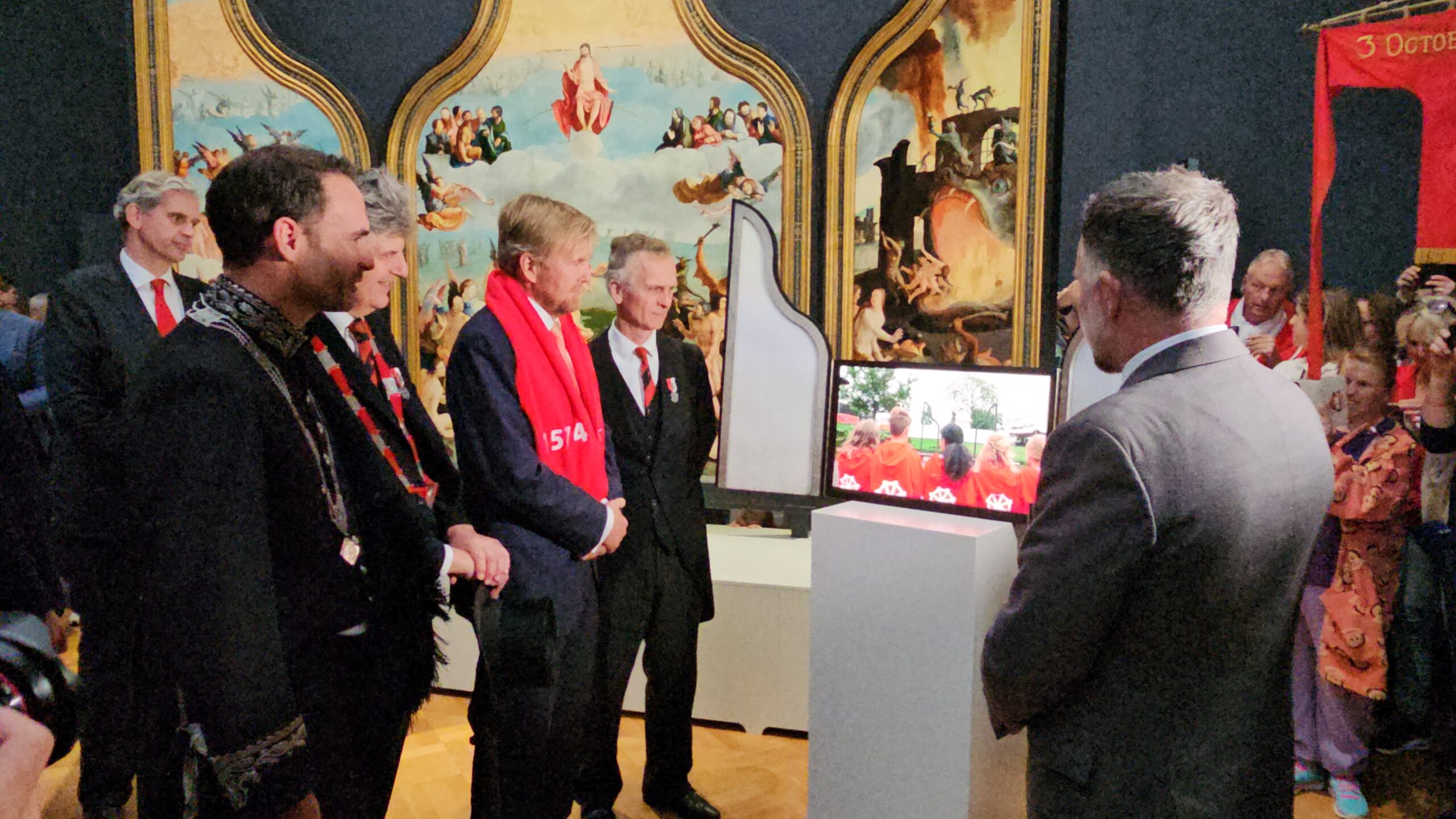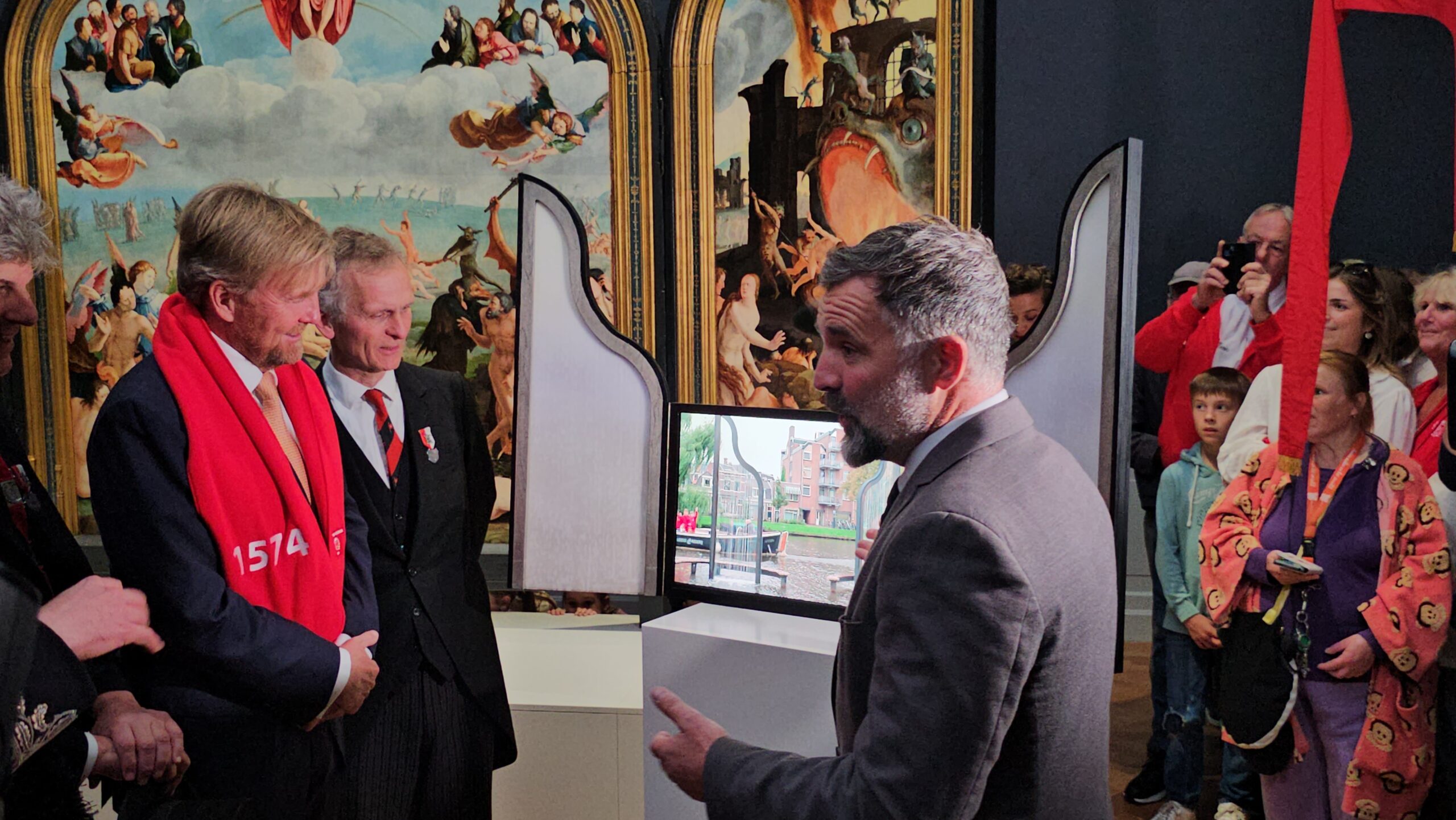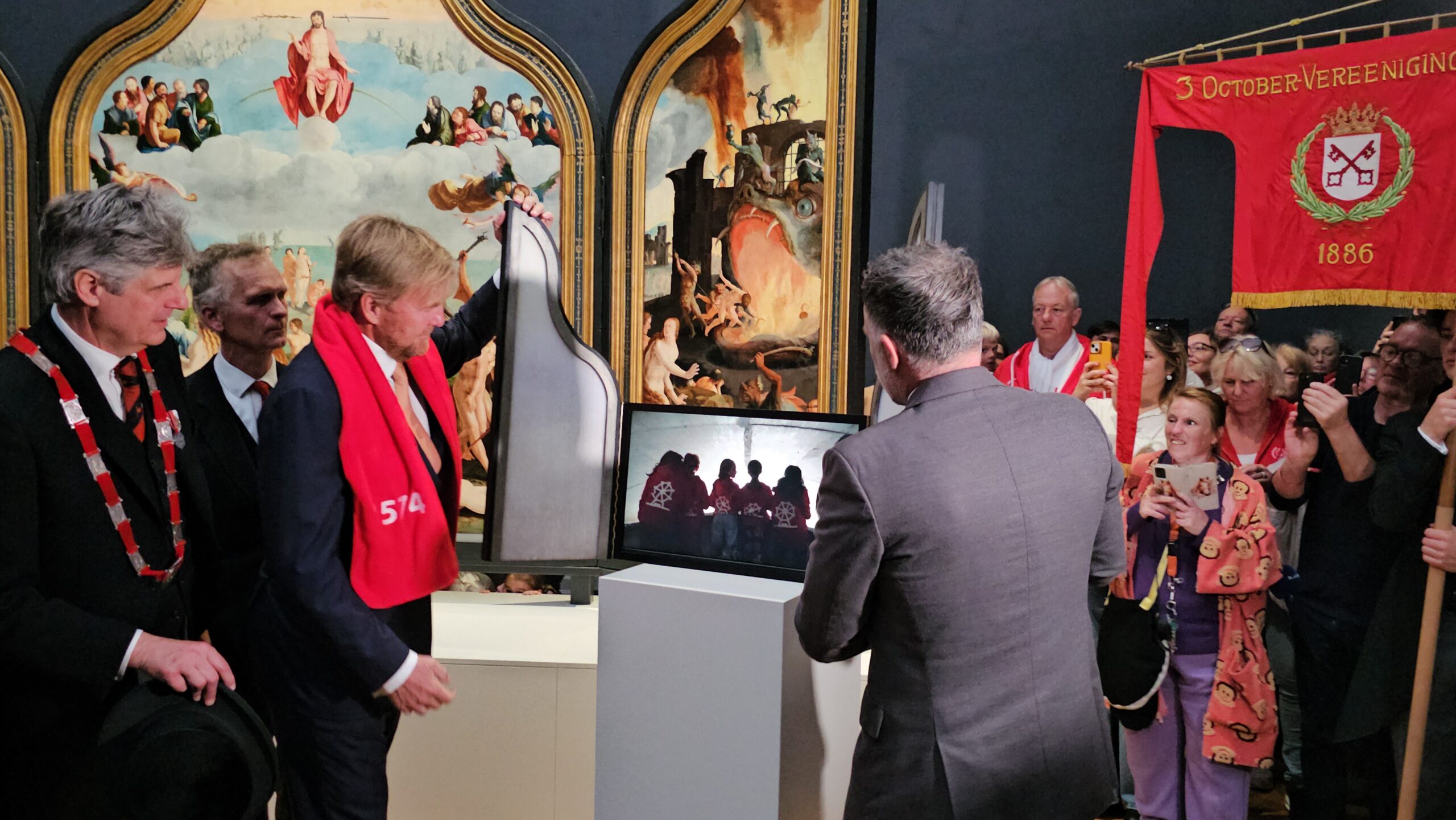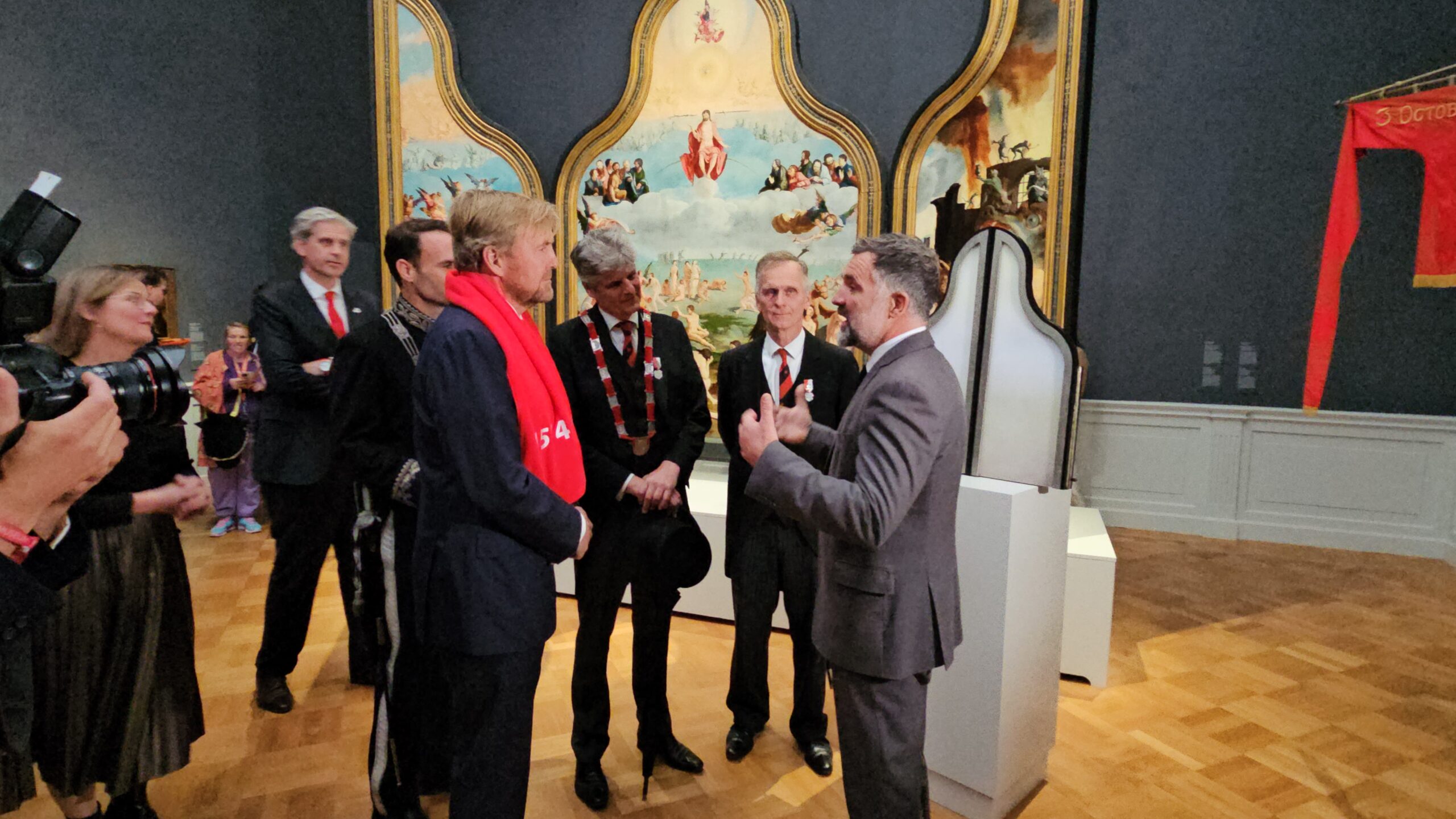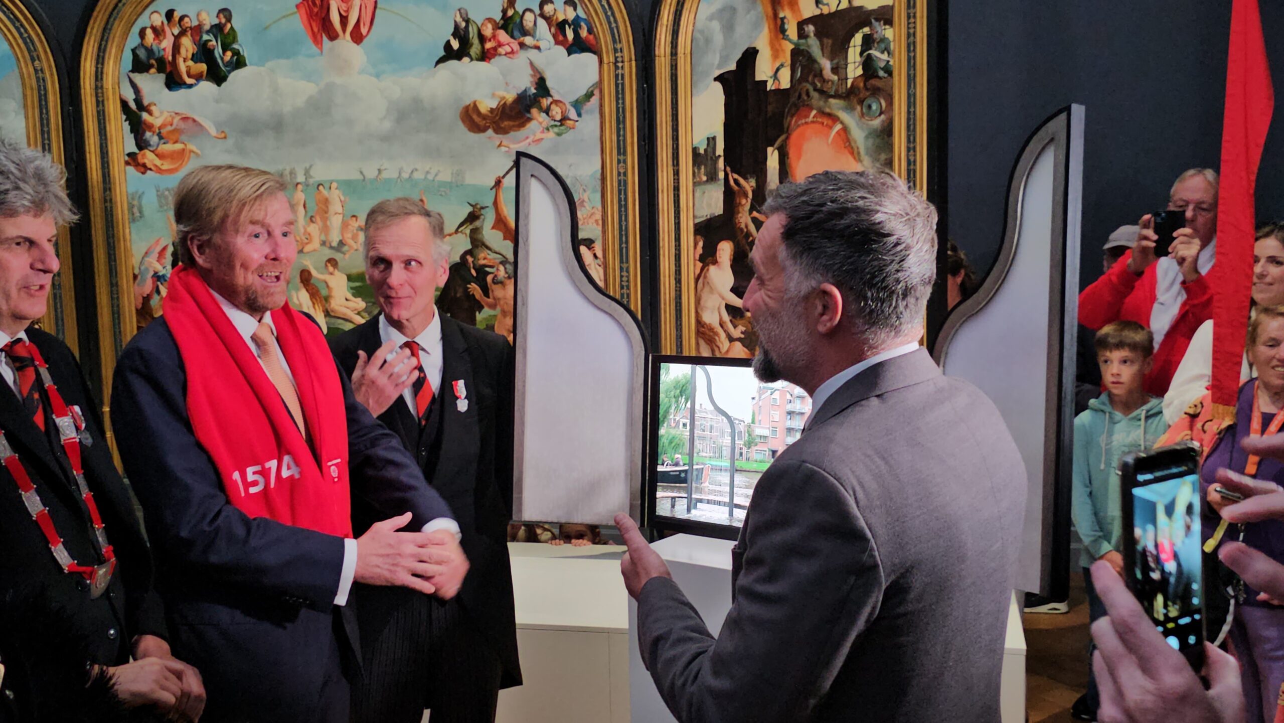 In de Lakenhal bezocht de Koning de tentoonstelling over 450 jaar optochtentraditie, waarna hij het kunstwerk ‘Een nieuwe poort’ van Casper Faassen symbolisch onthulde. Dat werk is geïnspireerd op het drieluik het Laatste Oordeel van Lucas van Leyden en werd naast het origineel onthuld via een livestream. Faassen en de Koning openden allebei een luikje, waarop een webcambeeld van het kunstwerk in beeld kwam. Dat is onlangs geplaatst in het water van de Rijnsburgersingel en er stroomt water doorheen uit Leiden en de omliggende plaatsen.