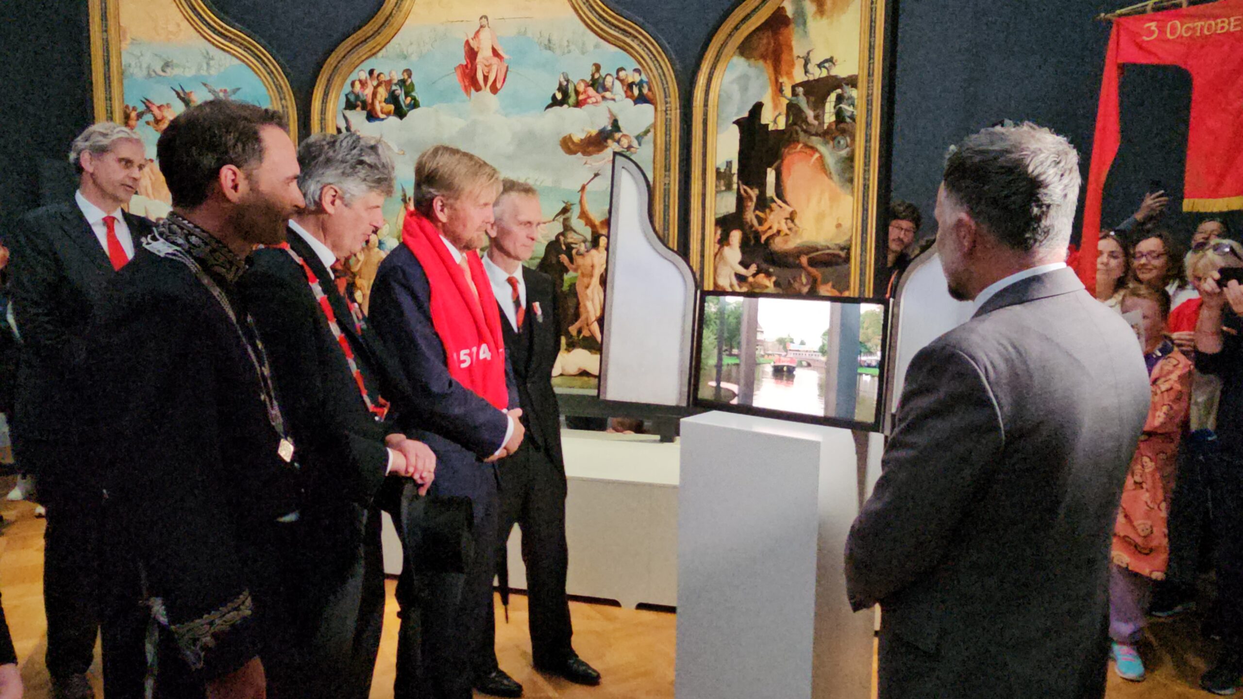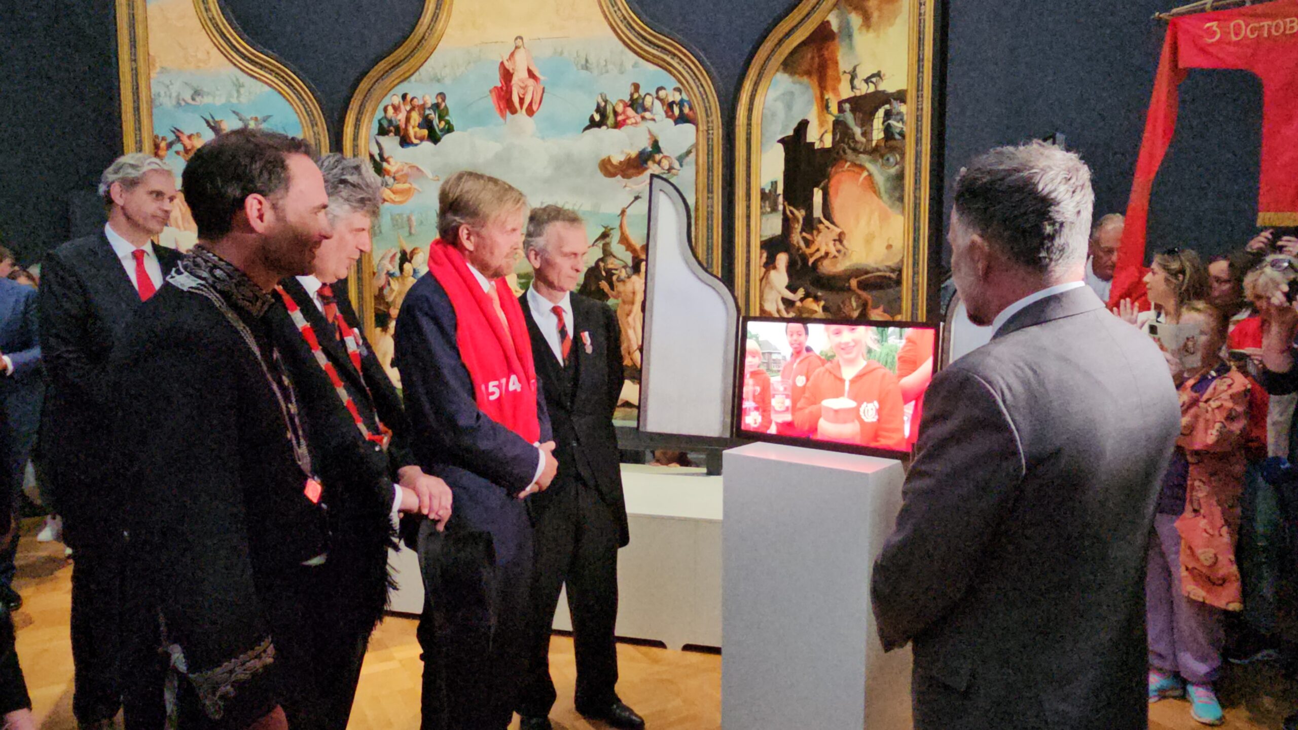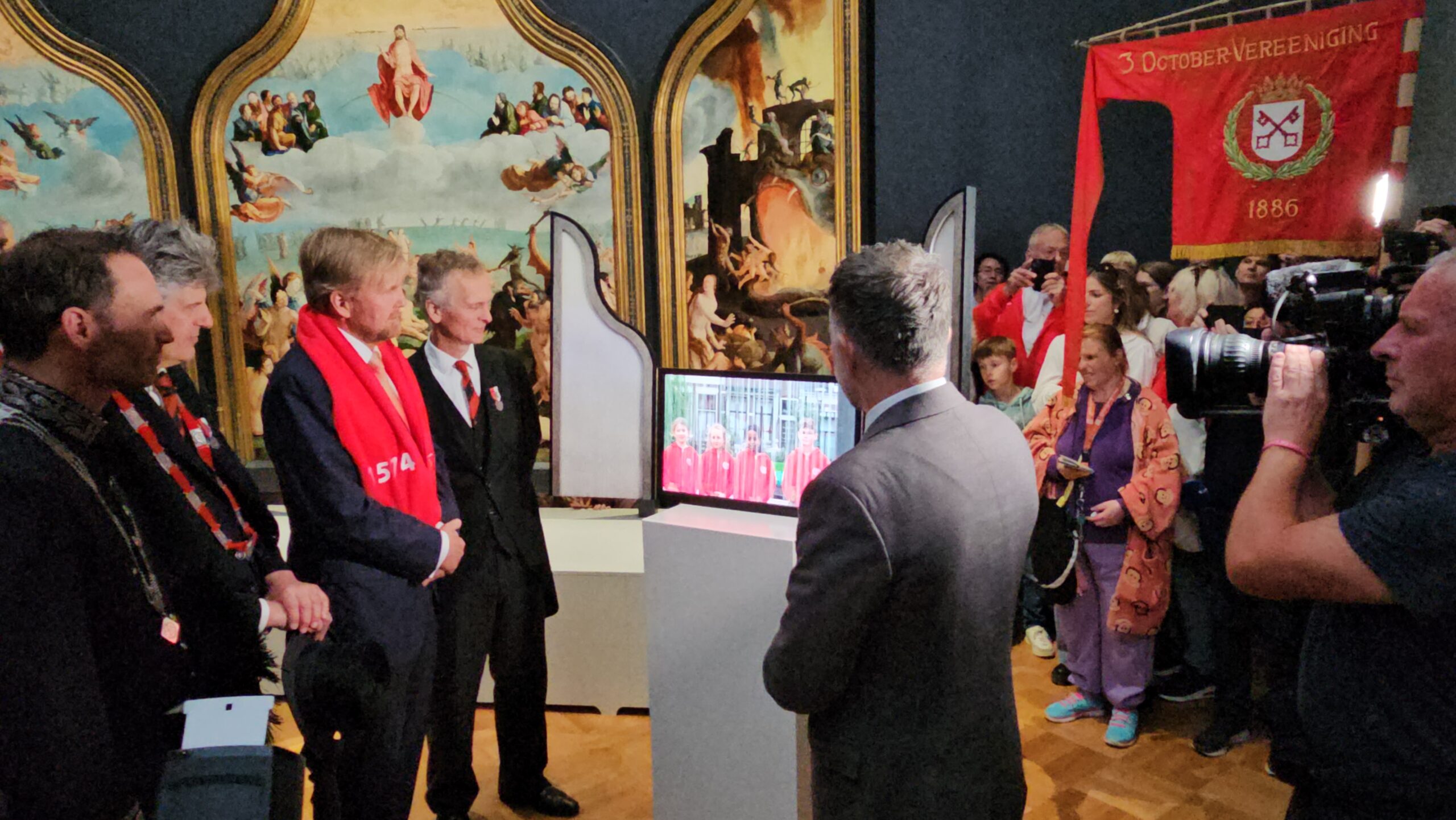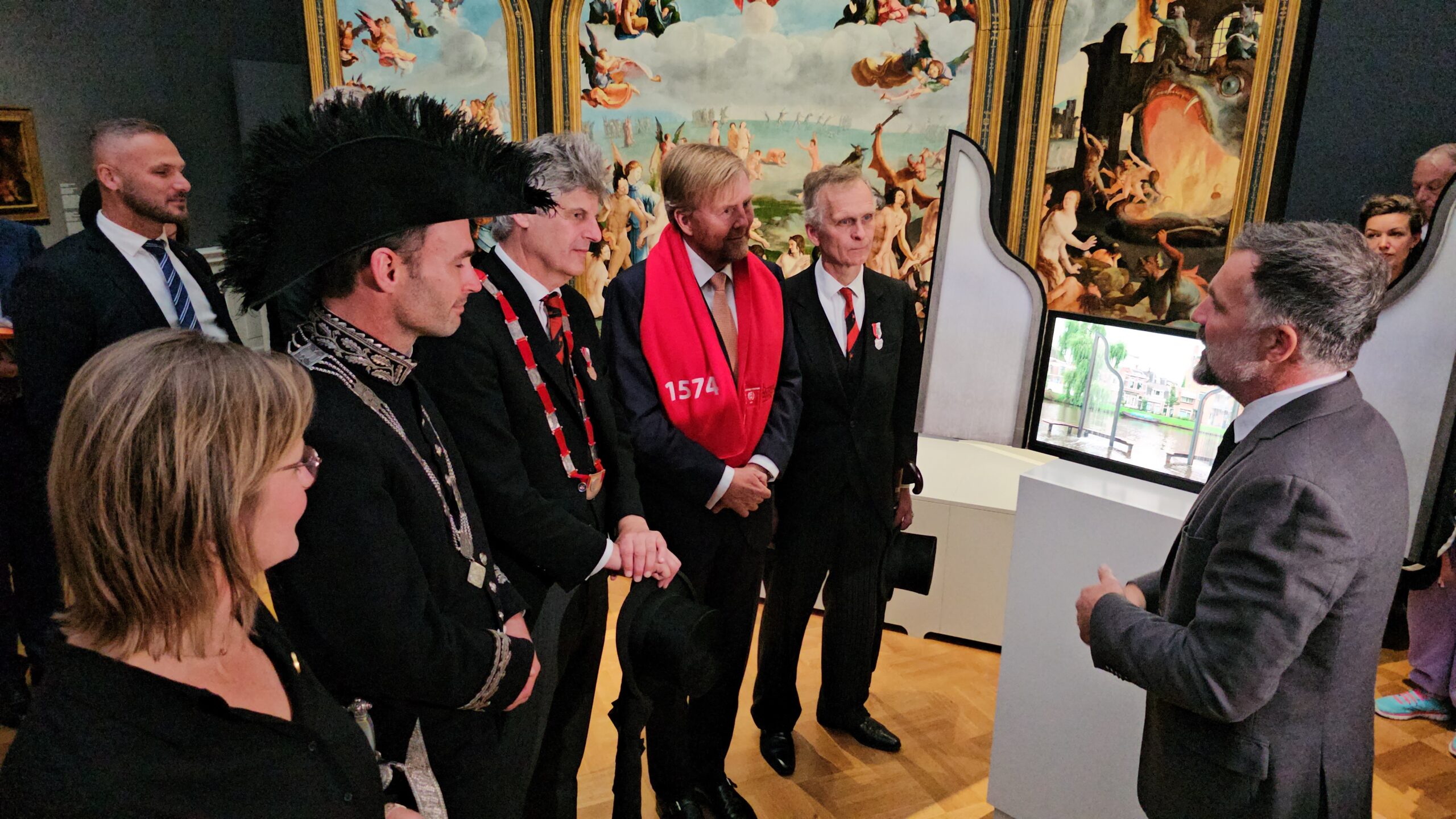 In de Lakenhal bezocht de Koning de tentoonstelling over 450 jaar optochtentraditie, waarna hij het kunstwerk ‘Een nieuwe poort’ van Casper Faassen symbolisch onthulde. Dat werk is geïnspireerd op het drieluik het Laatste Oordeel van Lucas van Leyden en werd naast het origineel onthuld via een livestream. Faassen en de Koning openden allebei een luikje, waarop een webcambeeld van het kunstwerk in beeld kwam. Dat is onlangs geplaatst in het water van de Rijnsburgersingel en er stroomt water doorheen uit Leiden en de omliggende plaatsen.