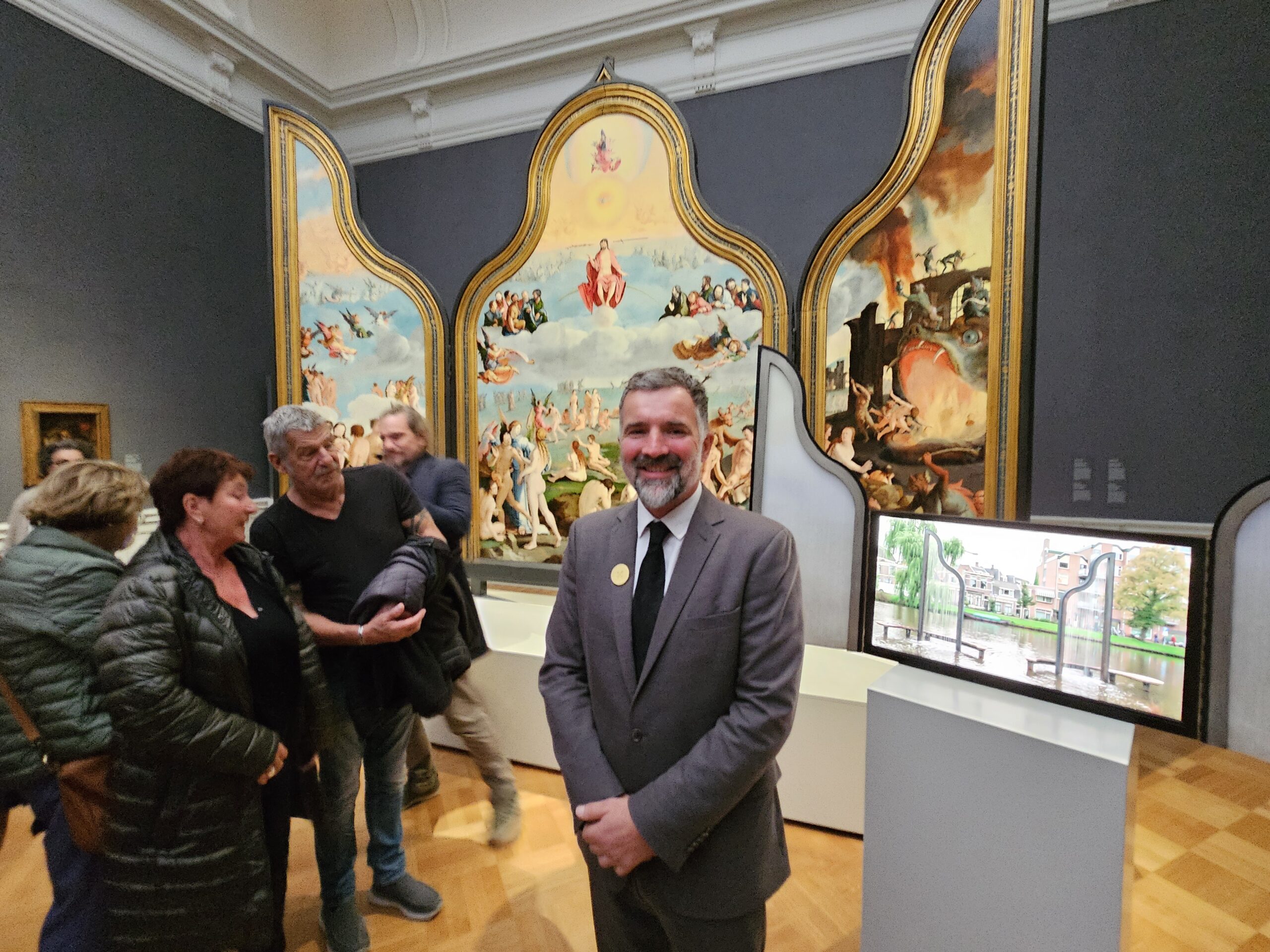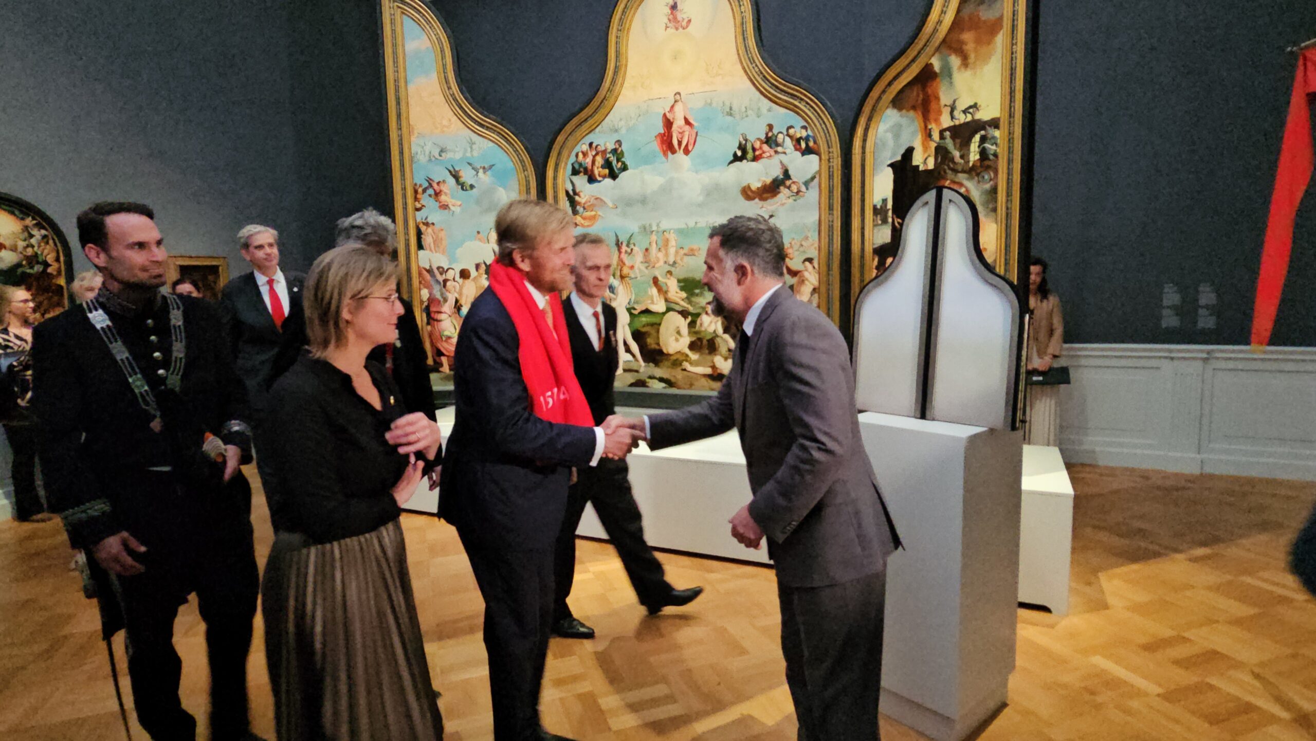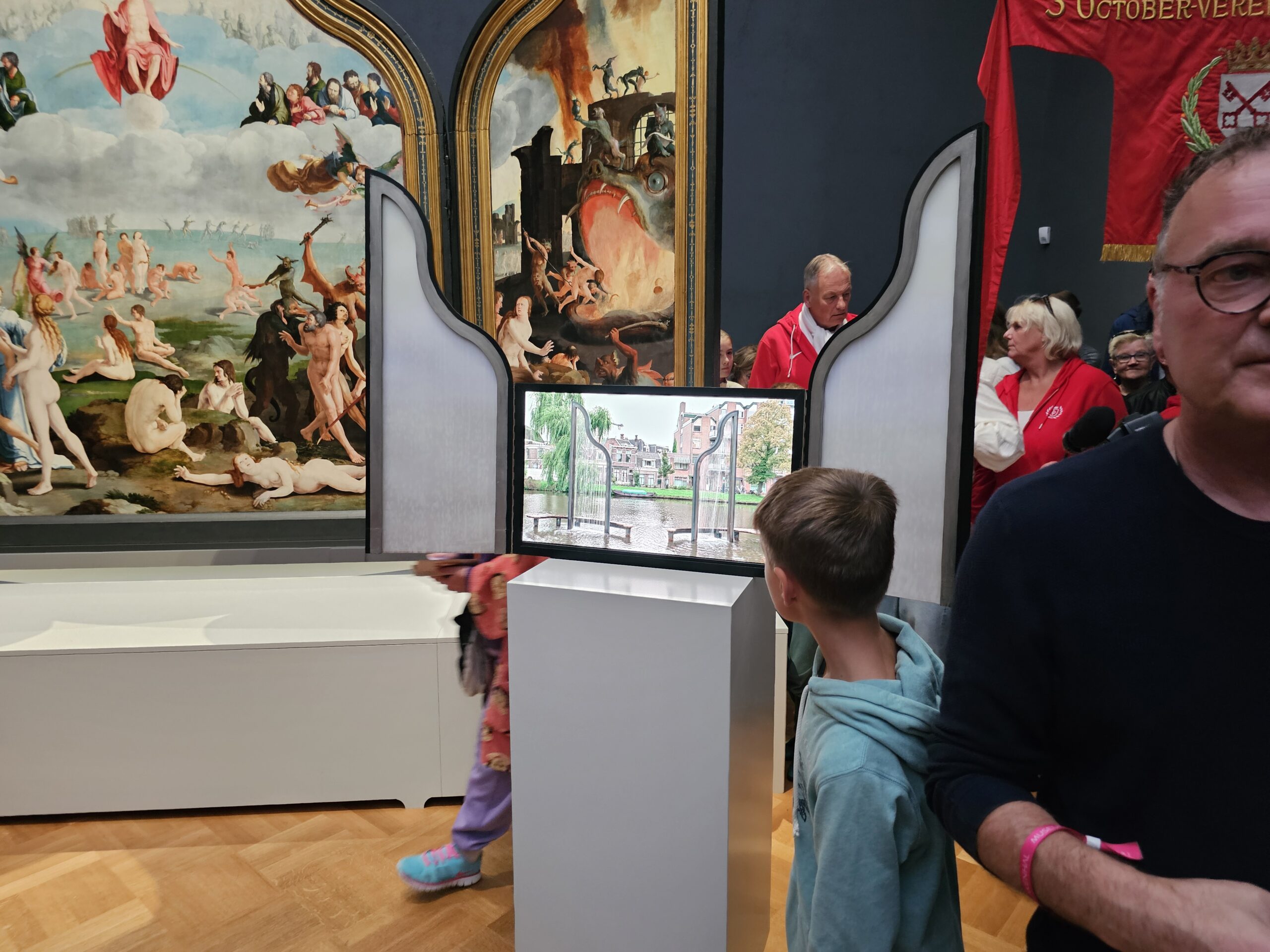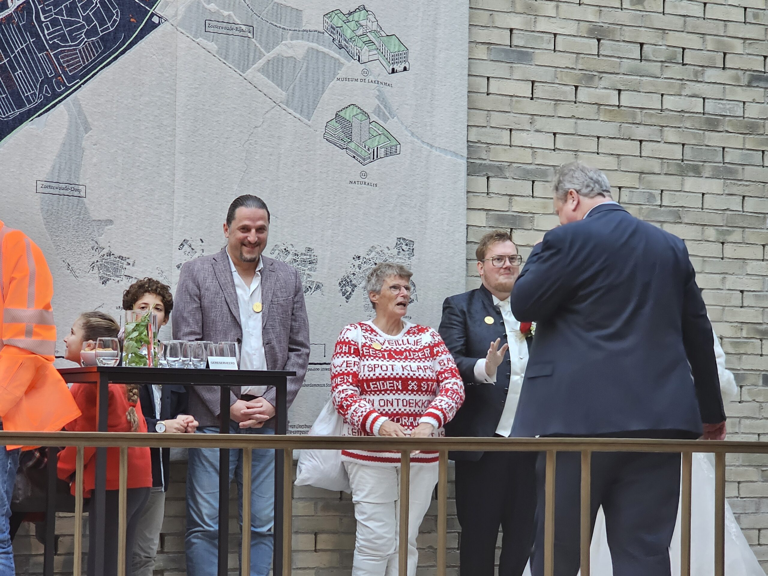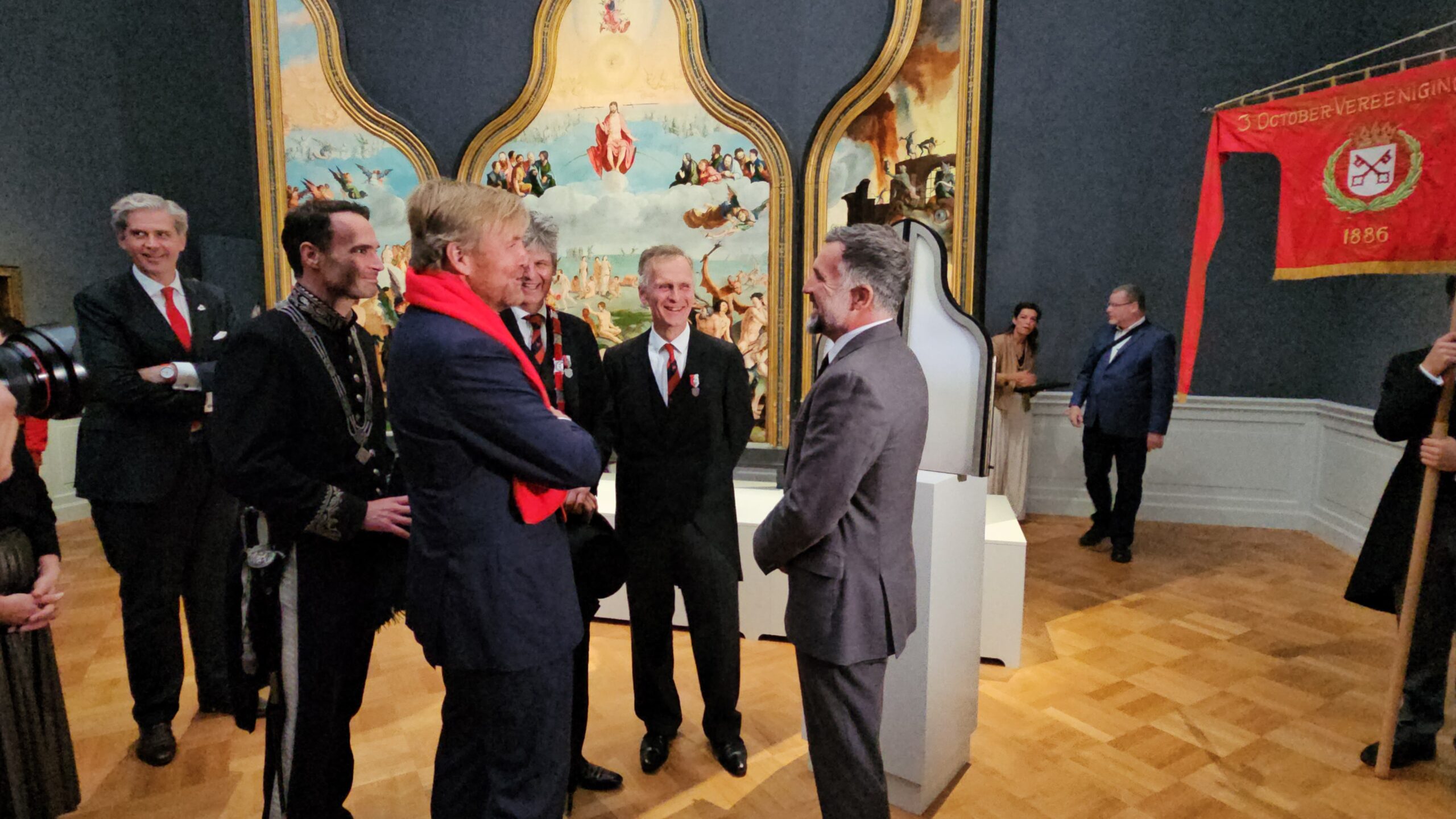 In de Lakenhal bezocht de Koning de tentoonstelling over 450 jaar optochtentraditie, waarna hij het kunstwerk ‘Een nieuwe poort’ van Casper Faassen symbolisch onthulde. Dat werk is geïnspireerd op het drieluik het Laatste Oordeel van Lucas van Leyden en werd naast het origineel onthuld via een livestream. Faassen en de Koning openden allebei een luikje, waarop een webcambeeld van het kunstwerk in beeld kwam. Dat is onlangs geplaatst in het water van de Rijnsburgersingel en er stroomt water doorheen uit Leiden en de omliggende plaatsen.