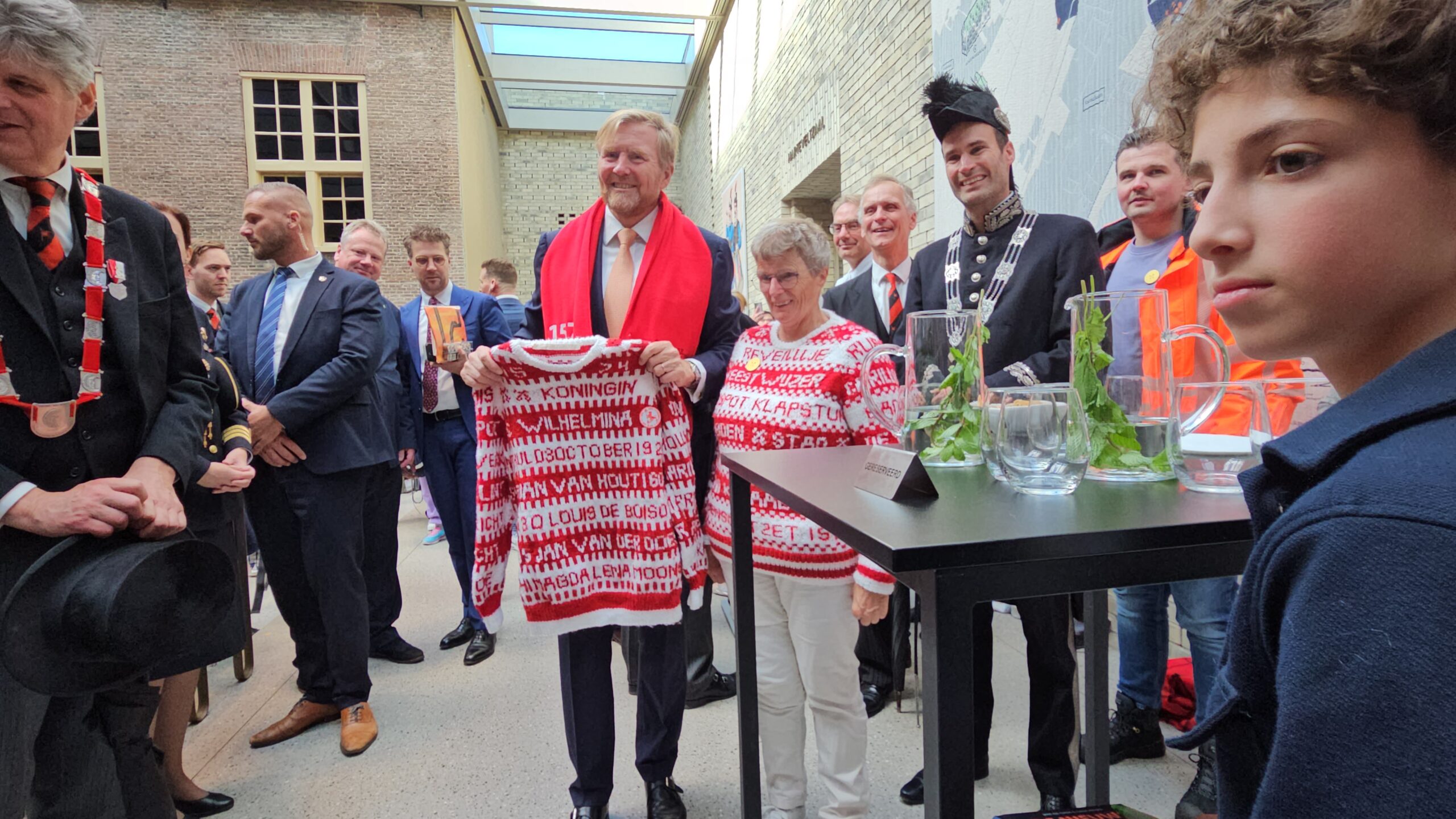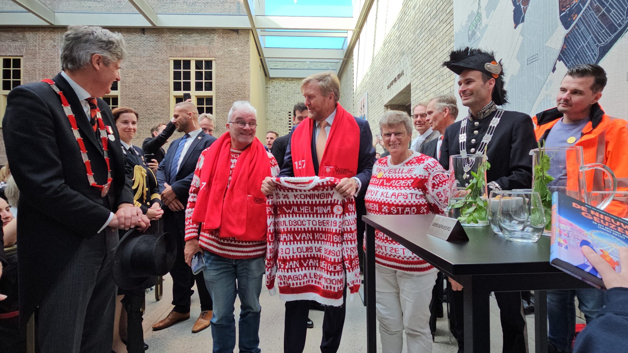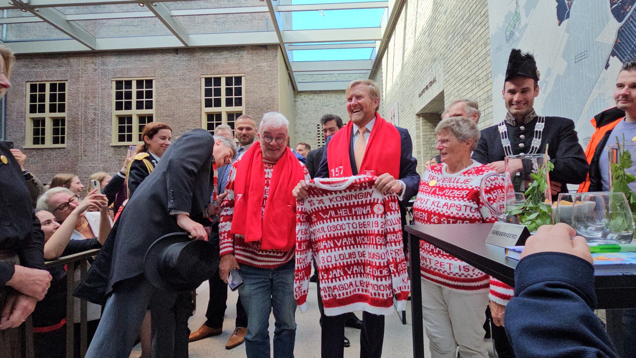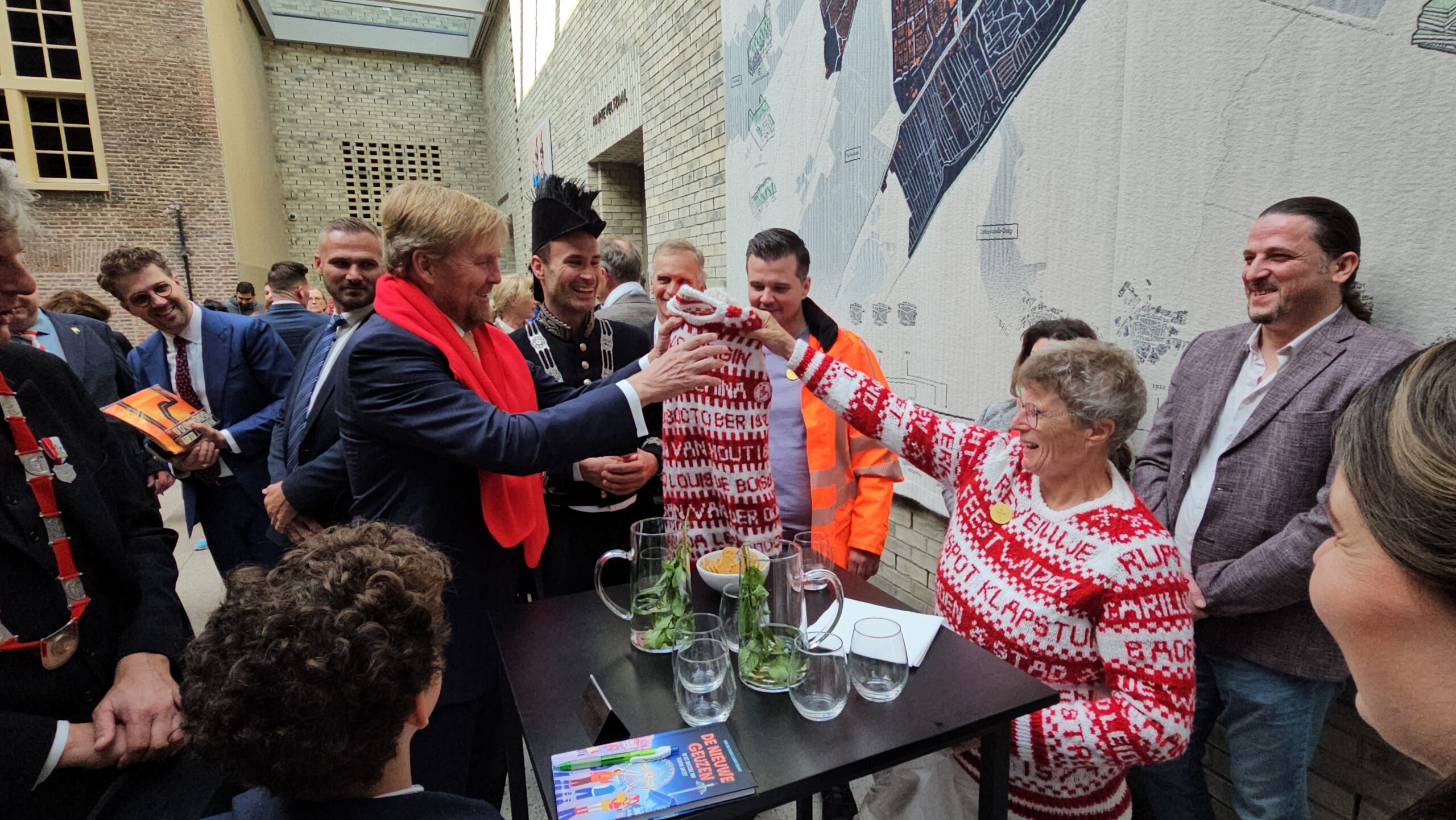 Voordat de Koning afscheid nam, kreeg hij uit handen van Joke van der Poel zijn eigen ‘Joketrui’ die hij in dank aanvaardde. Vervolgens ging hij op de foto met niet alleen Joke, maar ook met haar broer Toon van der Poel die een speciale Joketrui heeft. Op de achterkant heeft Joke namelijk een geel bord verwerkt met daarop de mededeling dat Leiden rond 3 oktober is afgesloten. “Dan is er niet veel veranderd”, constateerde de Koning. “Dat was dertig jaar geleden ook al zo.” En zo is het. En, zo blijft het.