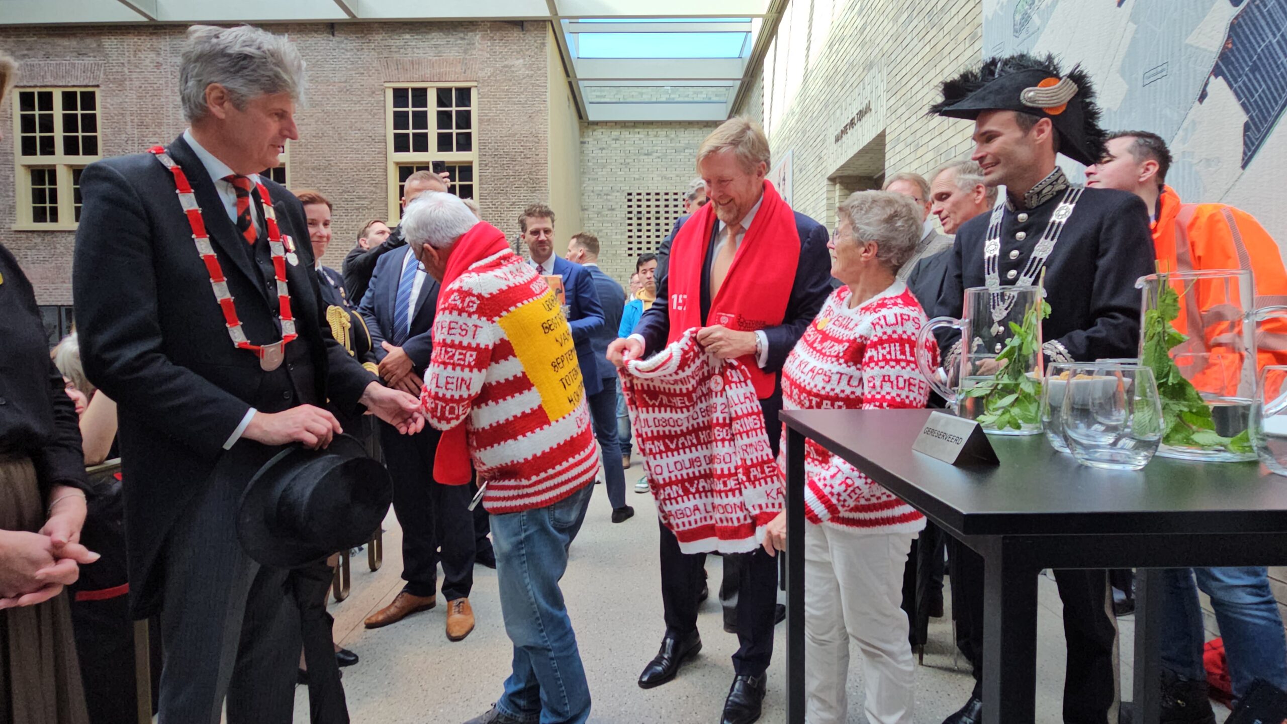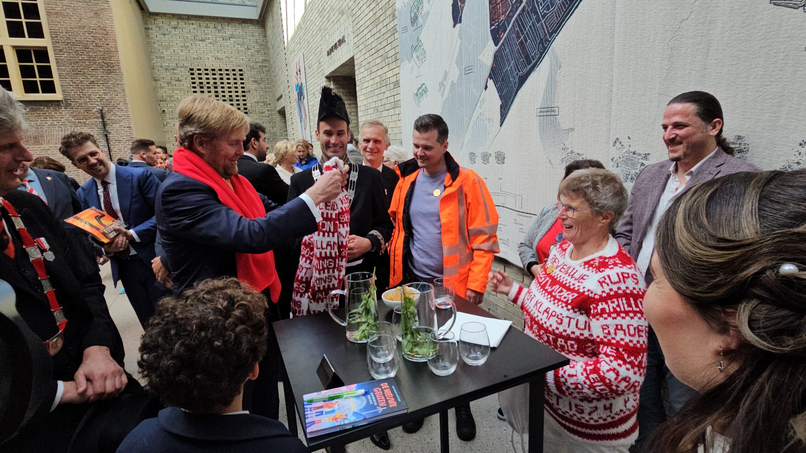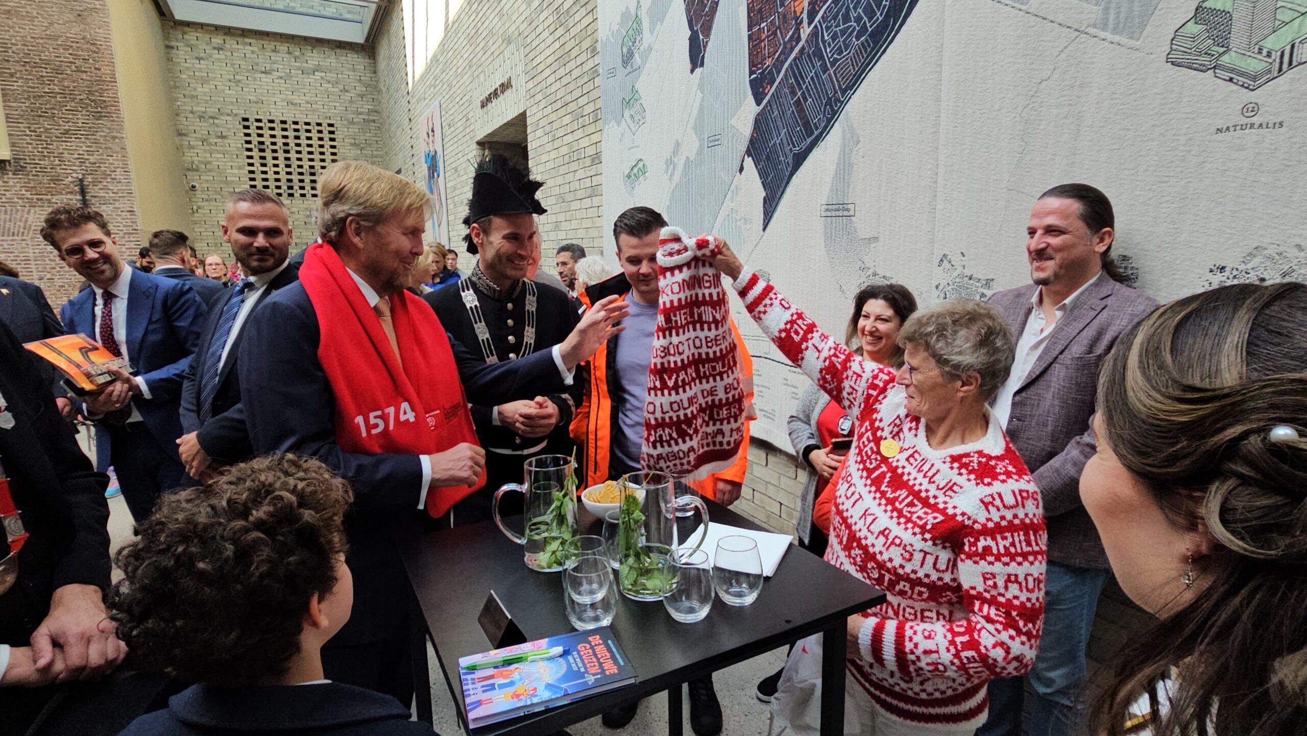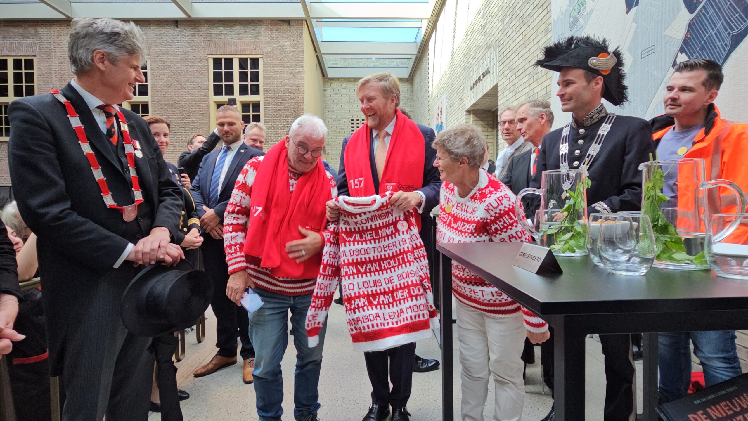 Voordat de Koning afscheid nam, kreeg hij uit handen van Joke van der Poel zijn eigen ‘Joketrui’ die hij in dank aanvaardde. Vervolgens ging hij op de foto met niet alleen Joke, maar ook met haar broer Toon van der Poel die een speciale Joketrui heeft. Op de achterkant heeft Joke namelijk een geel bord verwerkt met daarop de mededeling dat Leiden rond 3 oktober is afgesloten. “Dan is er niet veel veranderd”, constateerde de Koning. “Dat was dertig jaar geleden ook al zo.” En zo is het. En, zo blijft het.