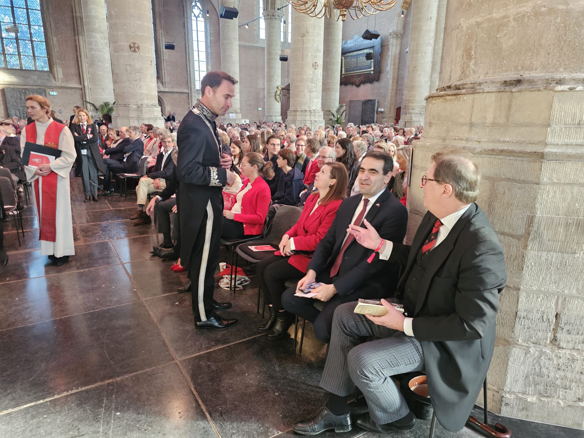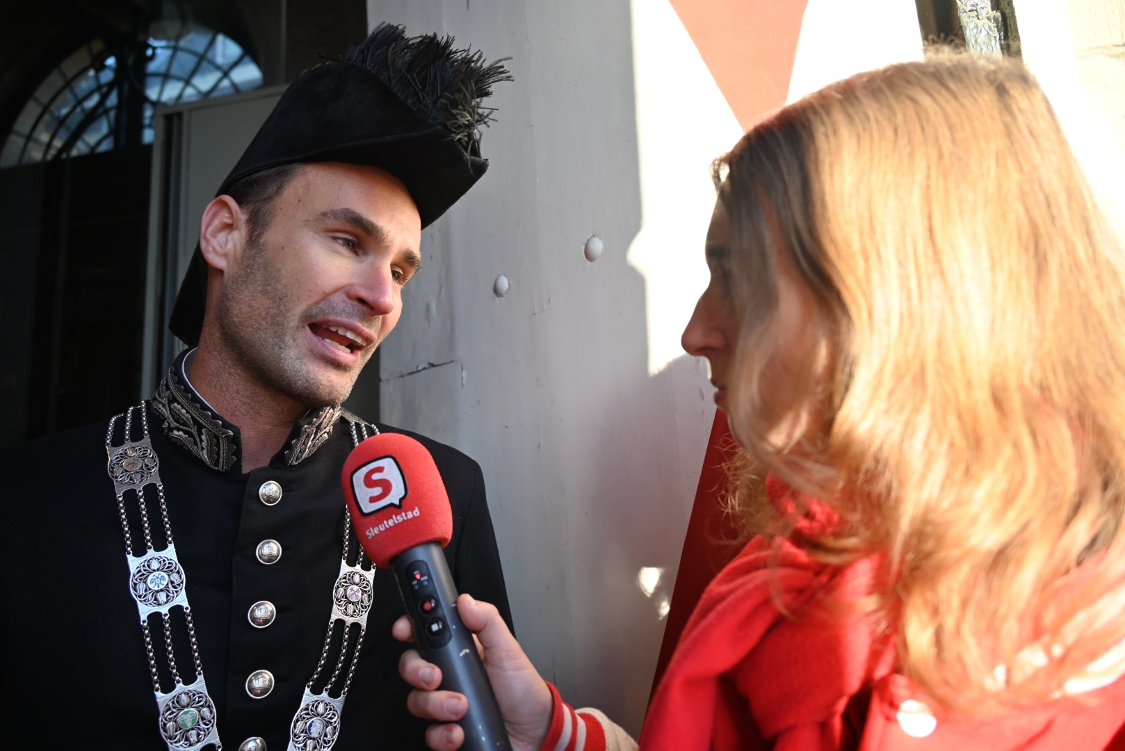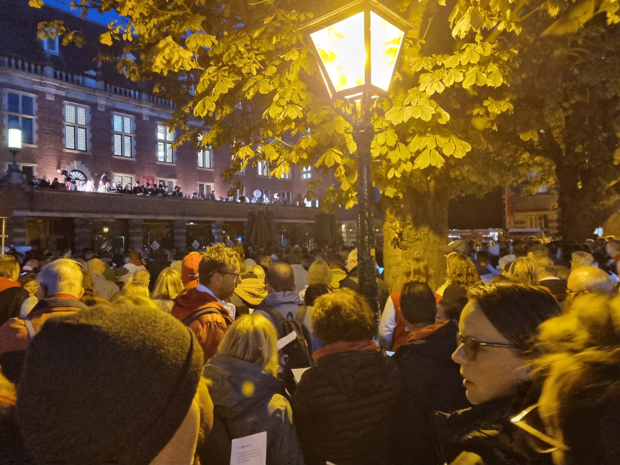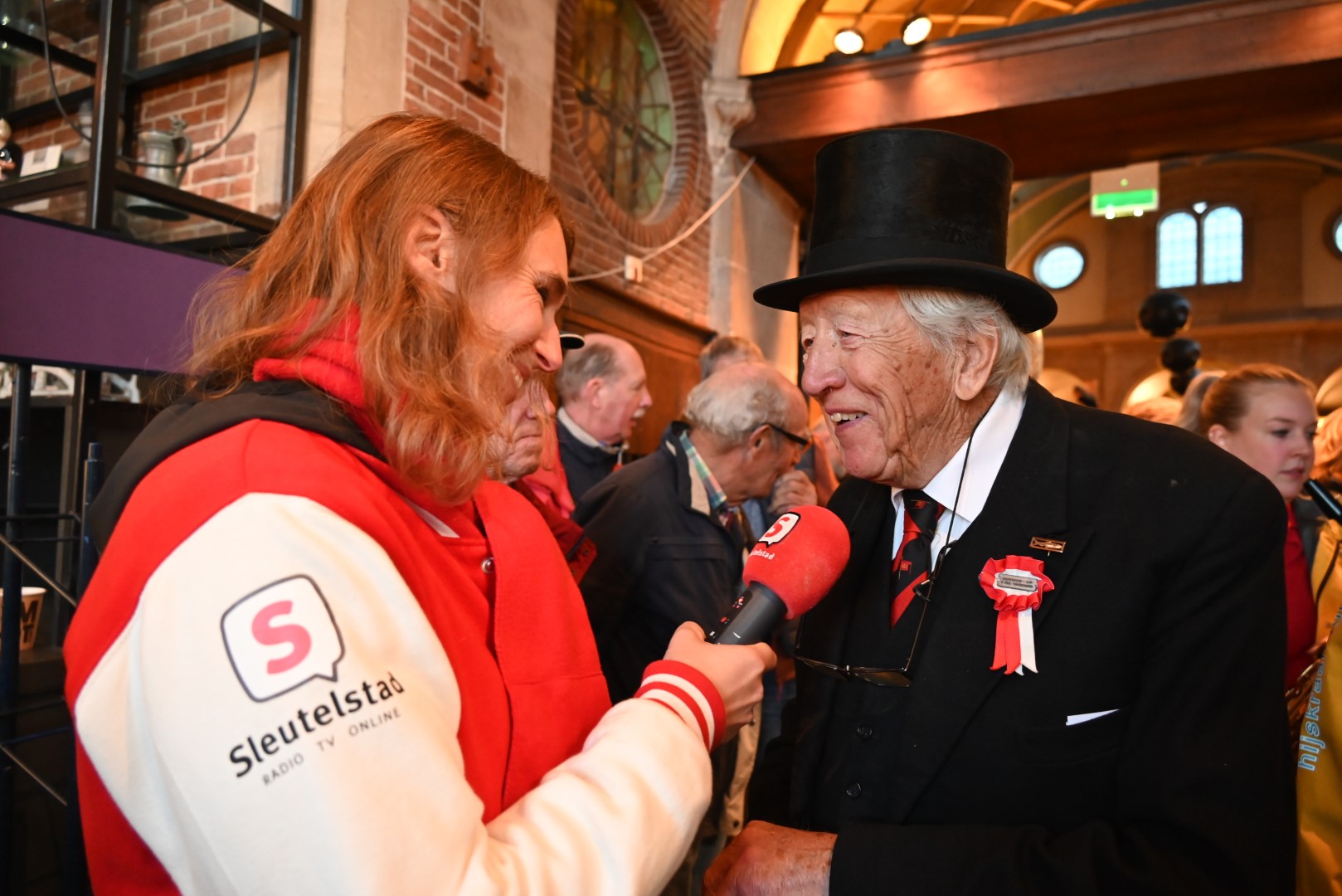 Verslaggeefster Reanne van Kleef in gesprek met burgemeester Peter Heijkoop die hard had geoefend op alle liedjes en vooral het Leids volkslied al uit zijn hoofd kende. “Volgend jaar hoop ik alles mee te kunnen zingen zonder boekje.”