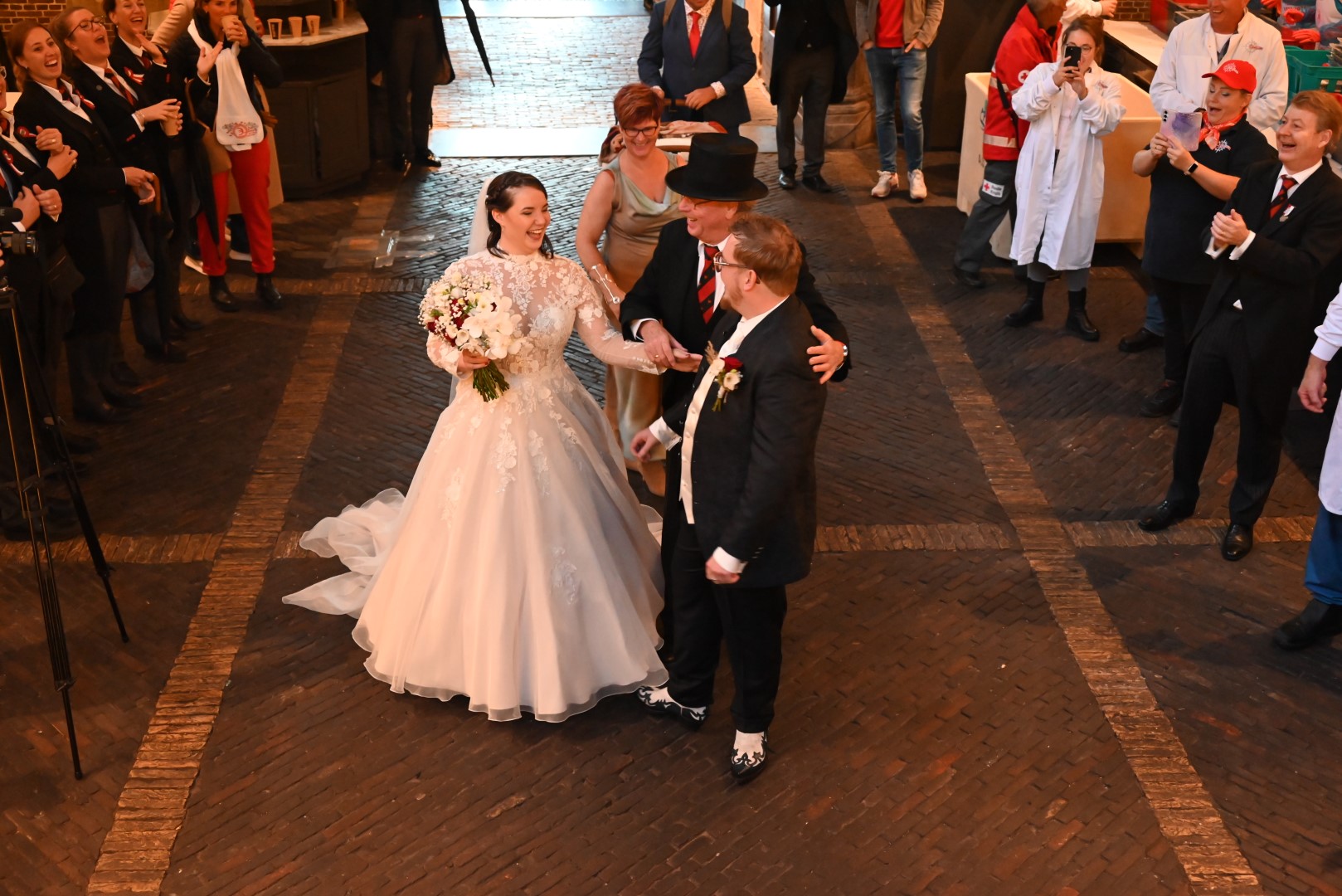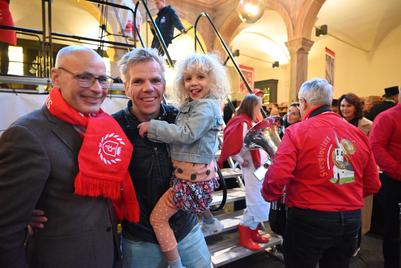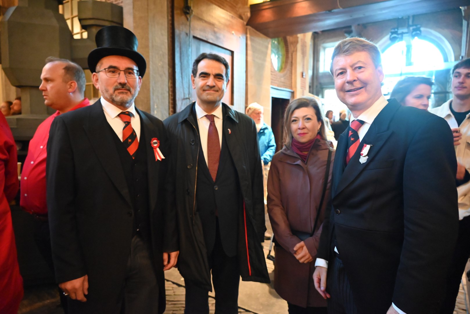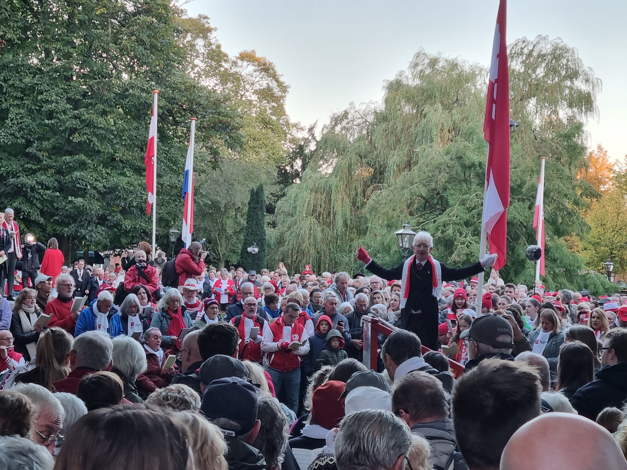 Verslaggeefster Reanne van Kleef in gesprek met burgemeester Peter Heijkoop die hard had geoefend op alle liedjes en vooral het Leids volkslied al uit zijn hoofd kende. “Volgend jaar hoop ik alles mee te kunnen zingen zonder boekje.”