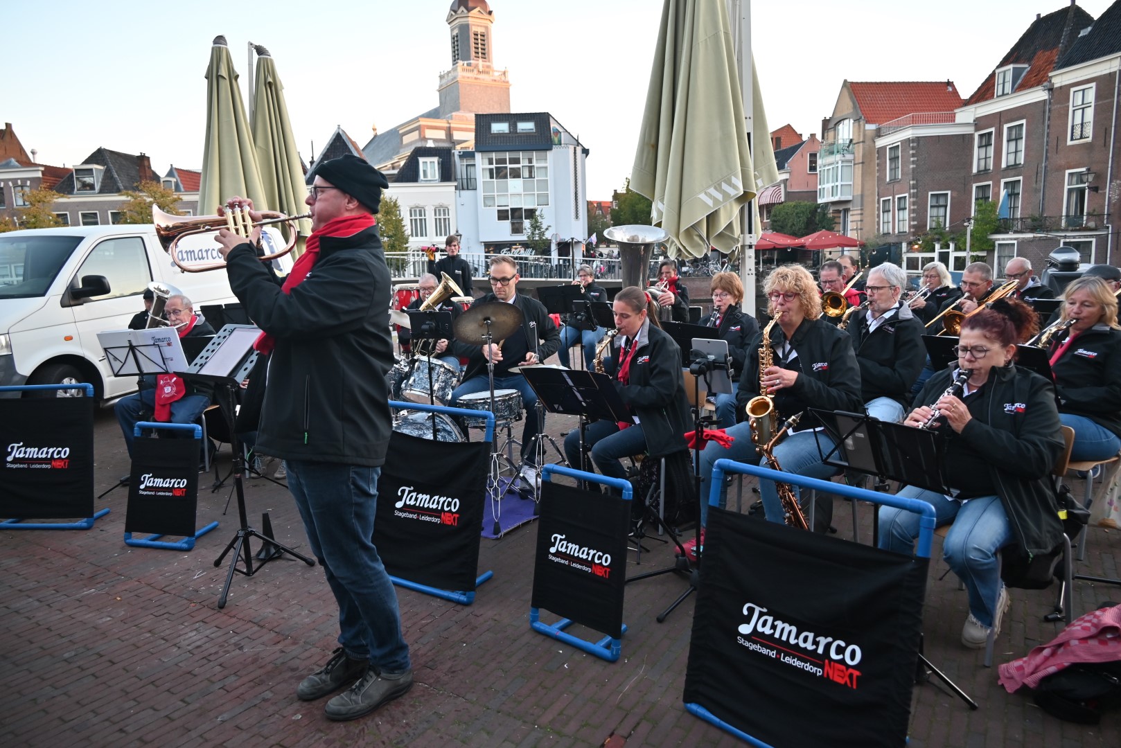Na een openingswoord van Rik Kamps, voorzitter van de 3 October Vereeniging, klinkt eerst het Wilhelmus. Daarna worden de typische liedjes van Leidens Ontzet gezongen. Over de geuzenvloot, haring en wittebrood en de moed van de Leidenaren in 1574. “Ik zing al mee met het Reveille sinds 1981”, vertelt een vrouw die met drie kleinkinderen op het Stadhuisplein staat. “Onze ouders waren gisteravond nog laat de stad in om het optreden van Armin van Buren mee te maken”, vult een van die kleinkinderen aan, “dus die zijn nu niet hier.”