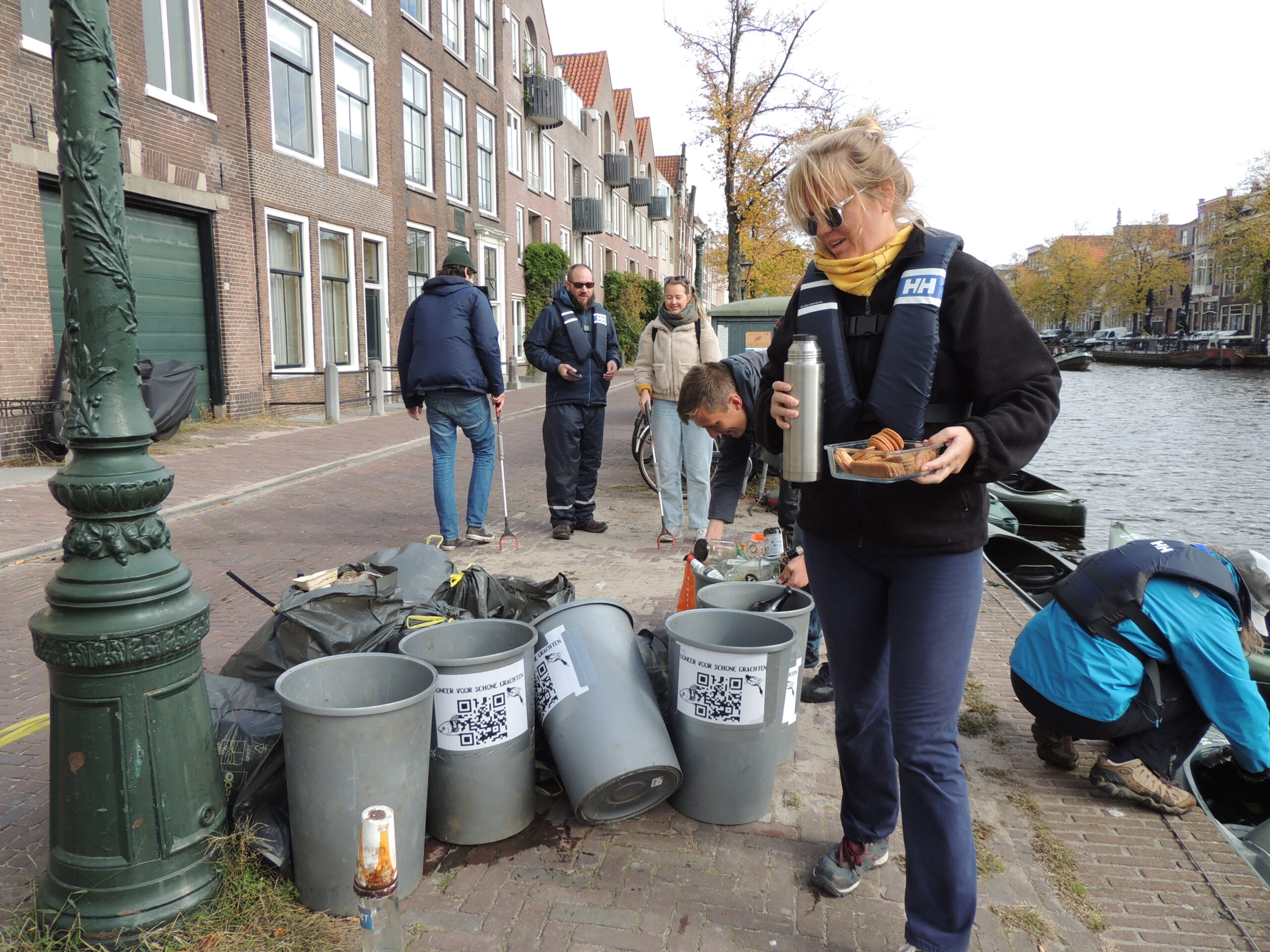Hoewel Bierman het geen probleem vindt om op een zonnige zondagmorgen het water van Leiden op te gaan, vindt hij het wel jammer dat het nog steeds nodig is. Dat beaamt Grachtwacht-oprichter Rambonnet. “Het zou beter zijn als wij niet meer nodig waren. We hebben ook al met de 3 October Vereeniging om de tafel gezeten hoe het feest duurzamer kan en met minder afval op straat. Er staan wel veel extra vuilnisbakken, maar de verdeling over de stad is niet goed. Hier langs de warenmarkt aan de Oude Singel zagen wij veel van die kleine prullenbakjes die helemaal uitpuilden en waar mensen andere afval tegenaan hadden gezet. Wat extra vuilnisbakken zou goed kunnen helpen.”