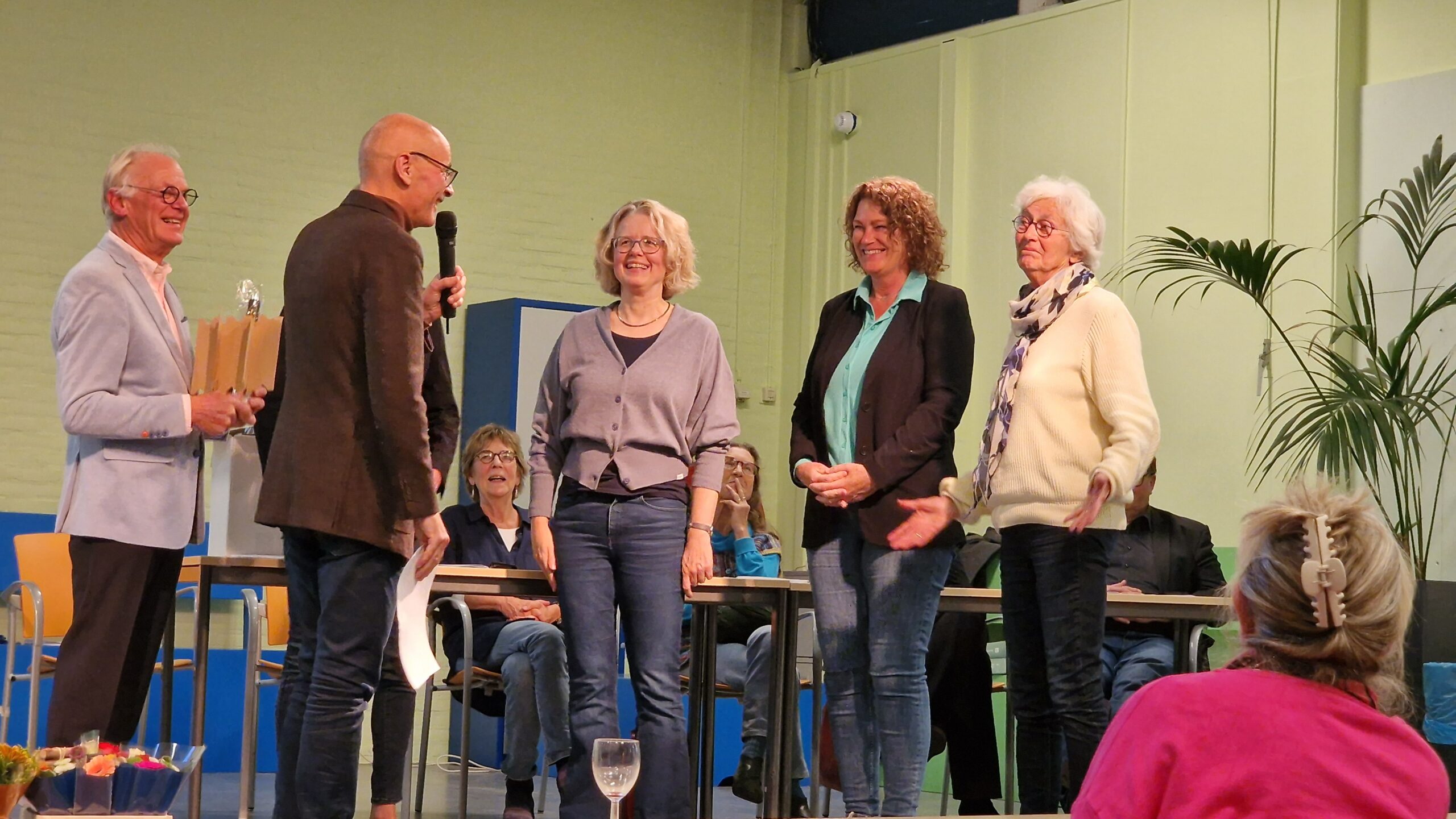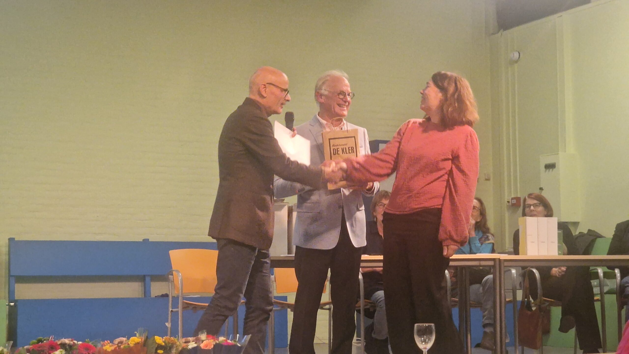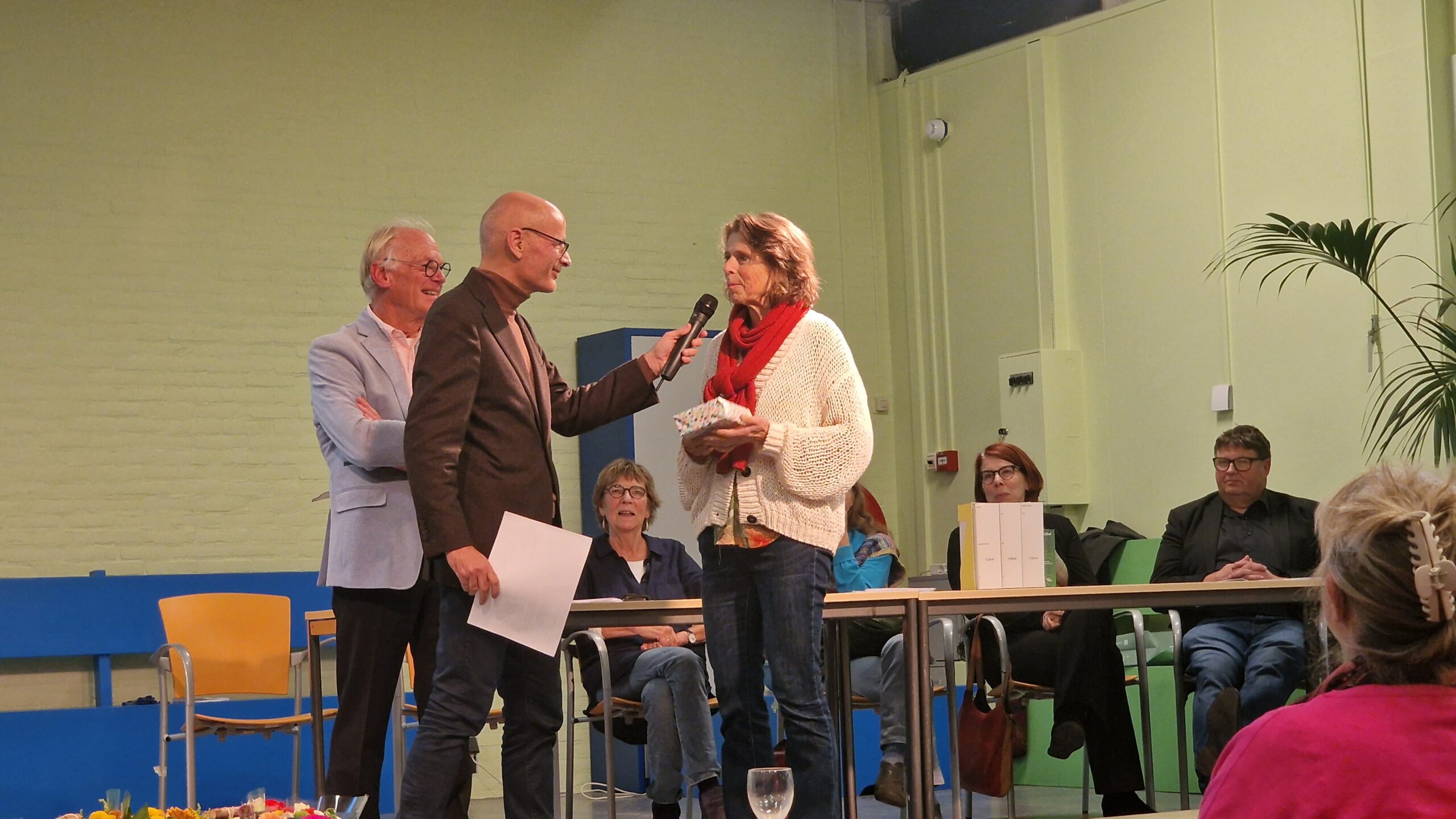Jan Frensen in gesprek met voorzitter van de Dicteecommissie Harry Theuns en Esther Groenewoud van VoorleesExpress.
