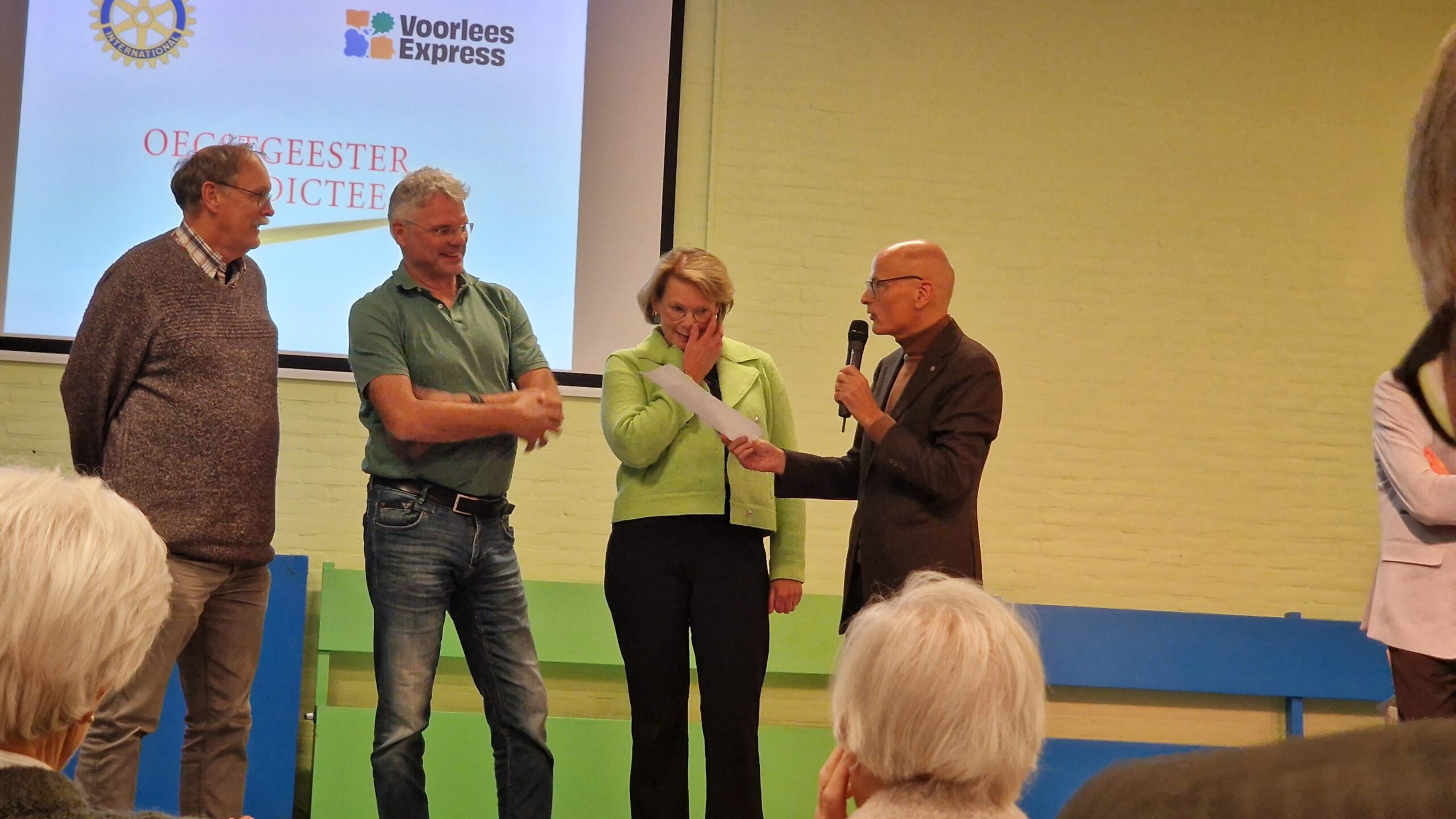 VoorleesExpress is al vanaf de start van het Oegstgeester Dictee ontvanger van het ingezamelde geld. Dit geld komt van de deelnemersbijdrage en van sponsoren, vooral van lokale ondernemers. Dit jaar is er naar verwachting zo’n tweeduizend euro opgehaald. Winnaars van het dictee kregen onder meer een Groen Boekje, een fles wijn en een waardebon voor een bowlingsessie.