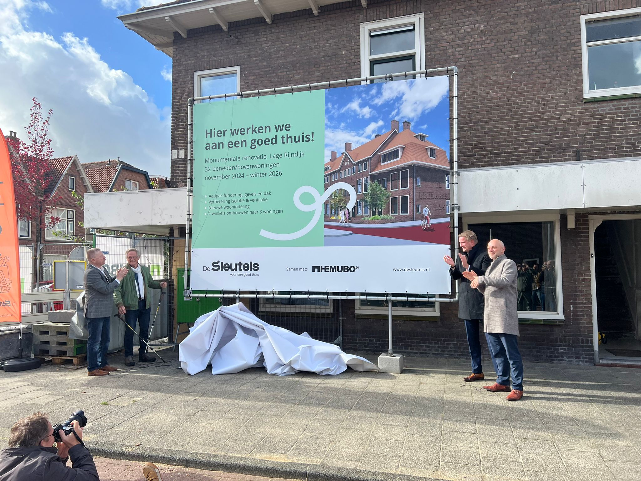 De renovatie van het monumentale huizenblok aan de Lage Rijndijk in Leiden is dinsdagmiddag van start gegaan. Het komende jaar worden de panden volledig verbouwd door woningcorporatie De Sleutels. Na de renovatie zijn de woningen op de hoek met de Borneostraat duurzaam en toekomstbestendig.